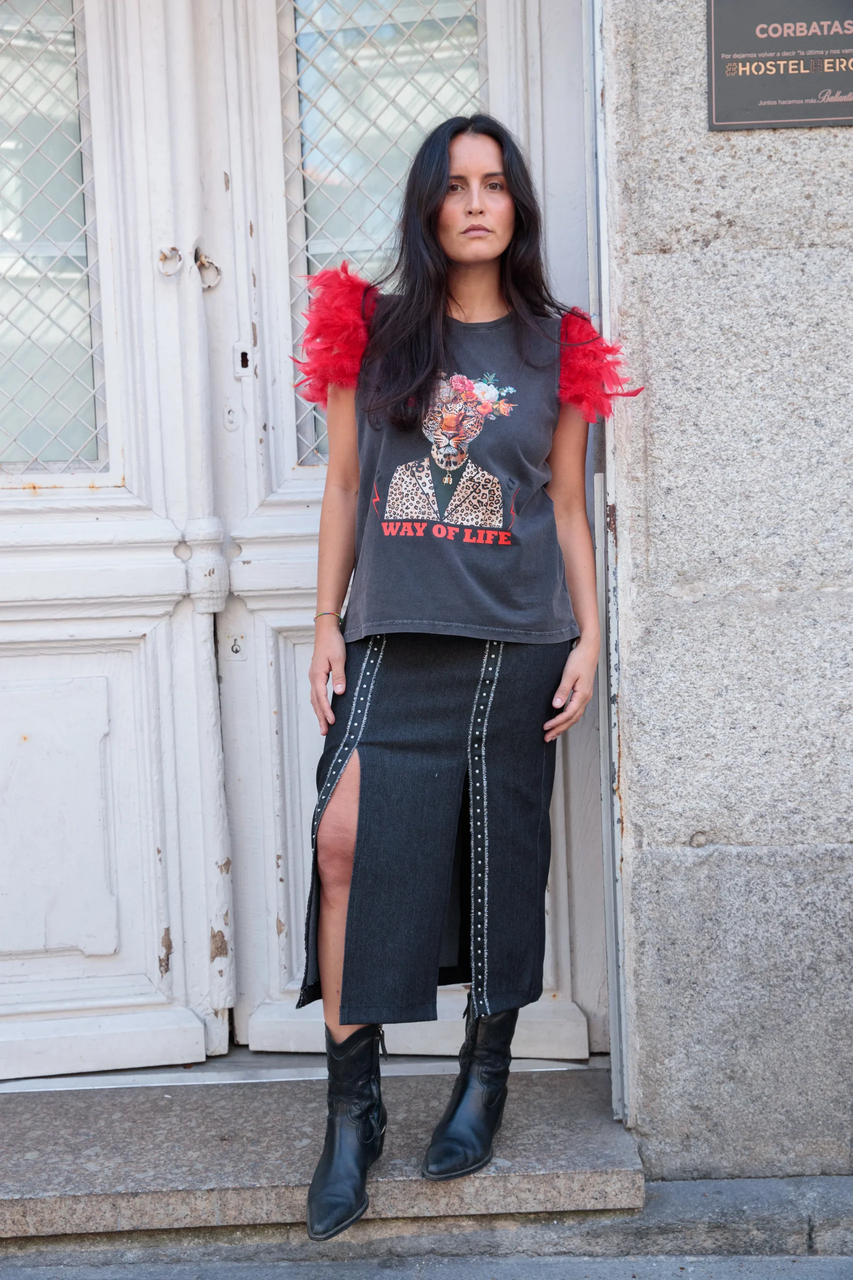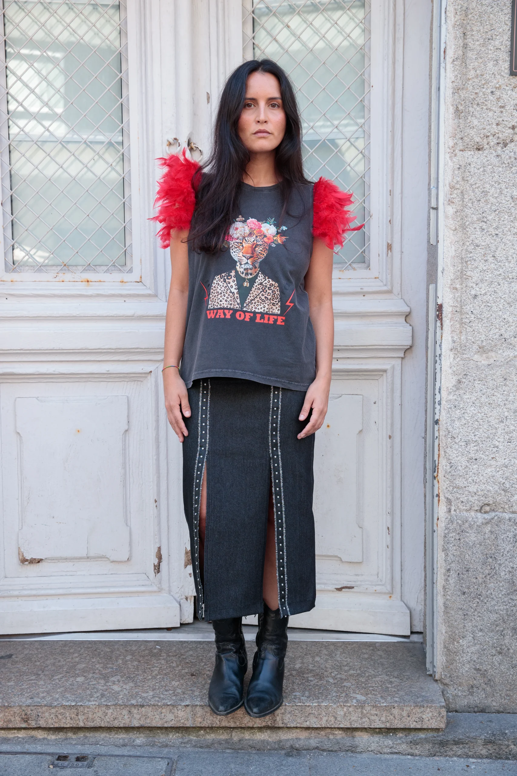 Detalle de hombreras con plumas rojas cosidas directamente en ambas sisas, generando volumen estructurado. Cuello redondo. Costuras reforzadas. Tejido suave al tacto con acabado lavado vintage.