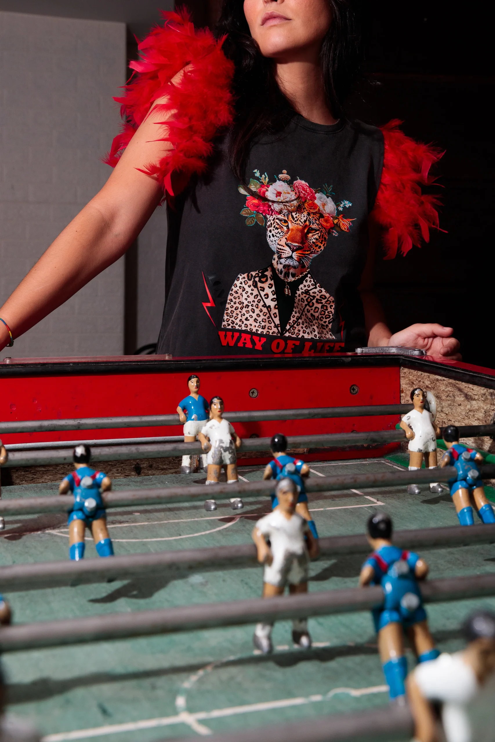 Camiseta sin mangas confeccionada en algodón lavado gris oscuro. Corte evasé con bajo asimétrico, ligeramente más largo por la parte trasera. Estampado central de tigre con tocado floral y chaqueta de leopardo. Texto «WAY OF LIFE» serigrafiado en color rojo debajo del gráfico.
