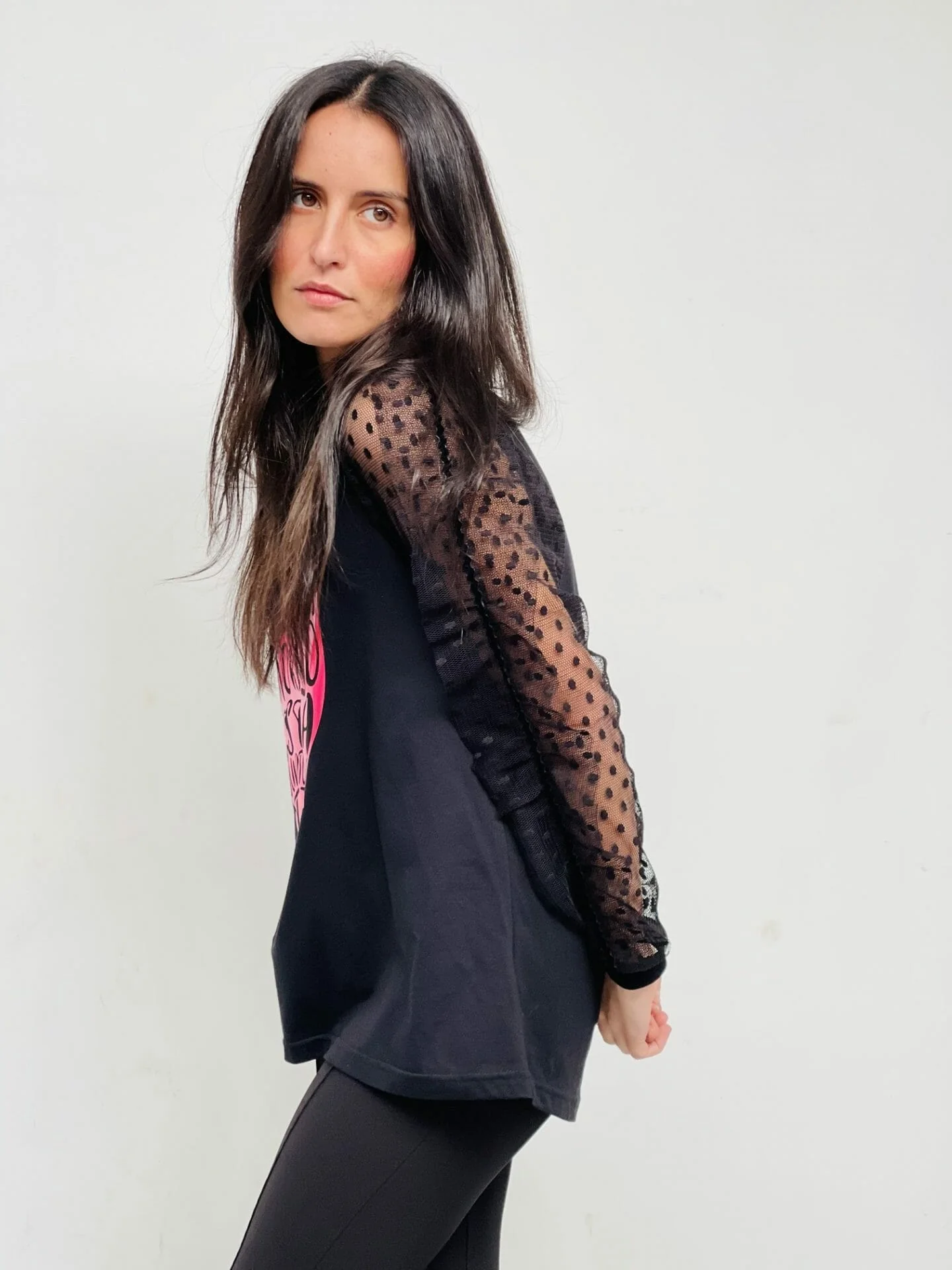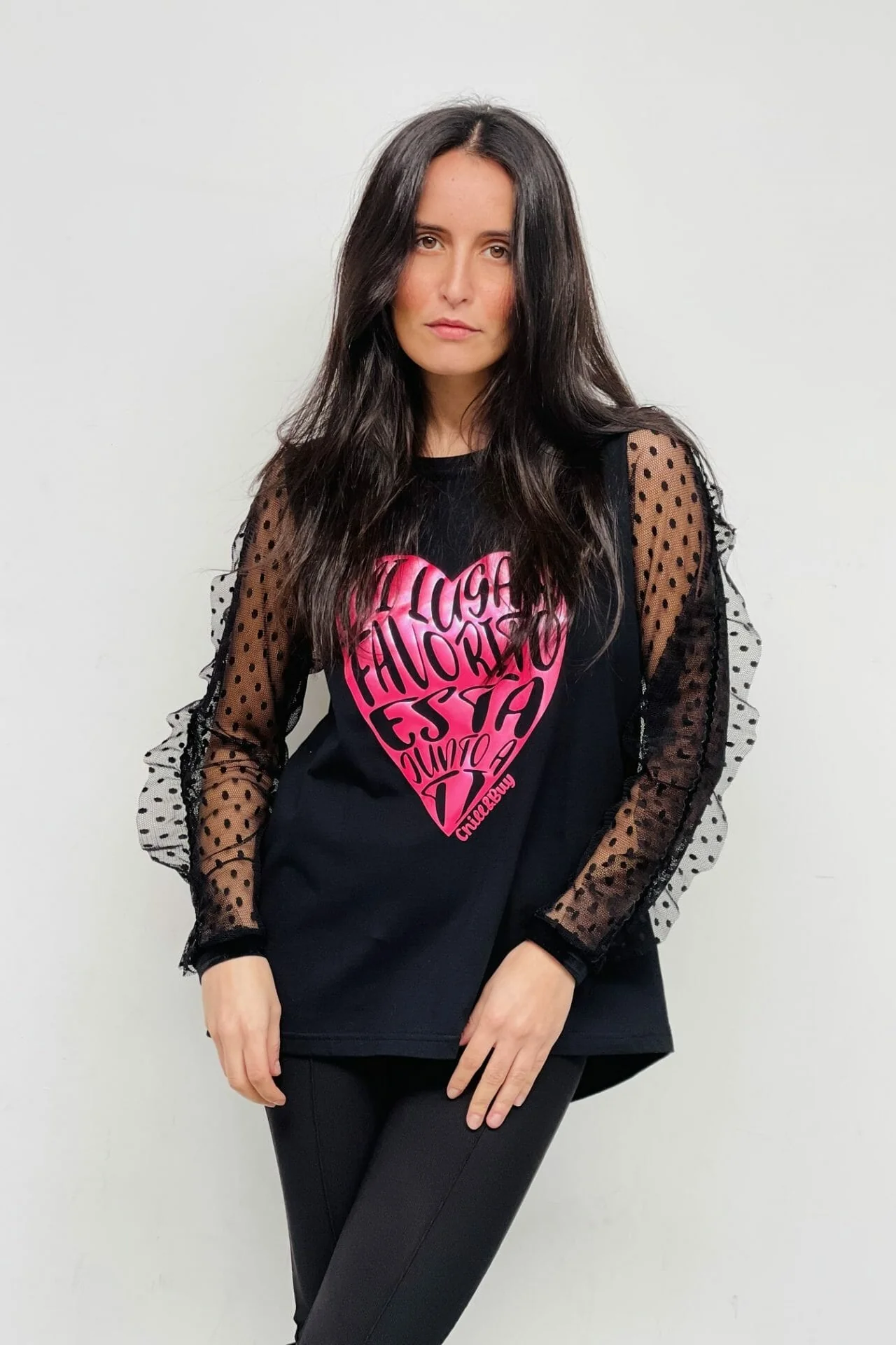 Camiseta de cuello redondo y manga larga plumeti acabada en puño de terciopelo y detalle aplicación con volante a lo largo de la manga. Estampación frontal.