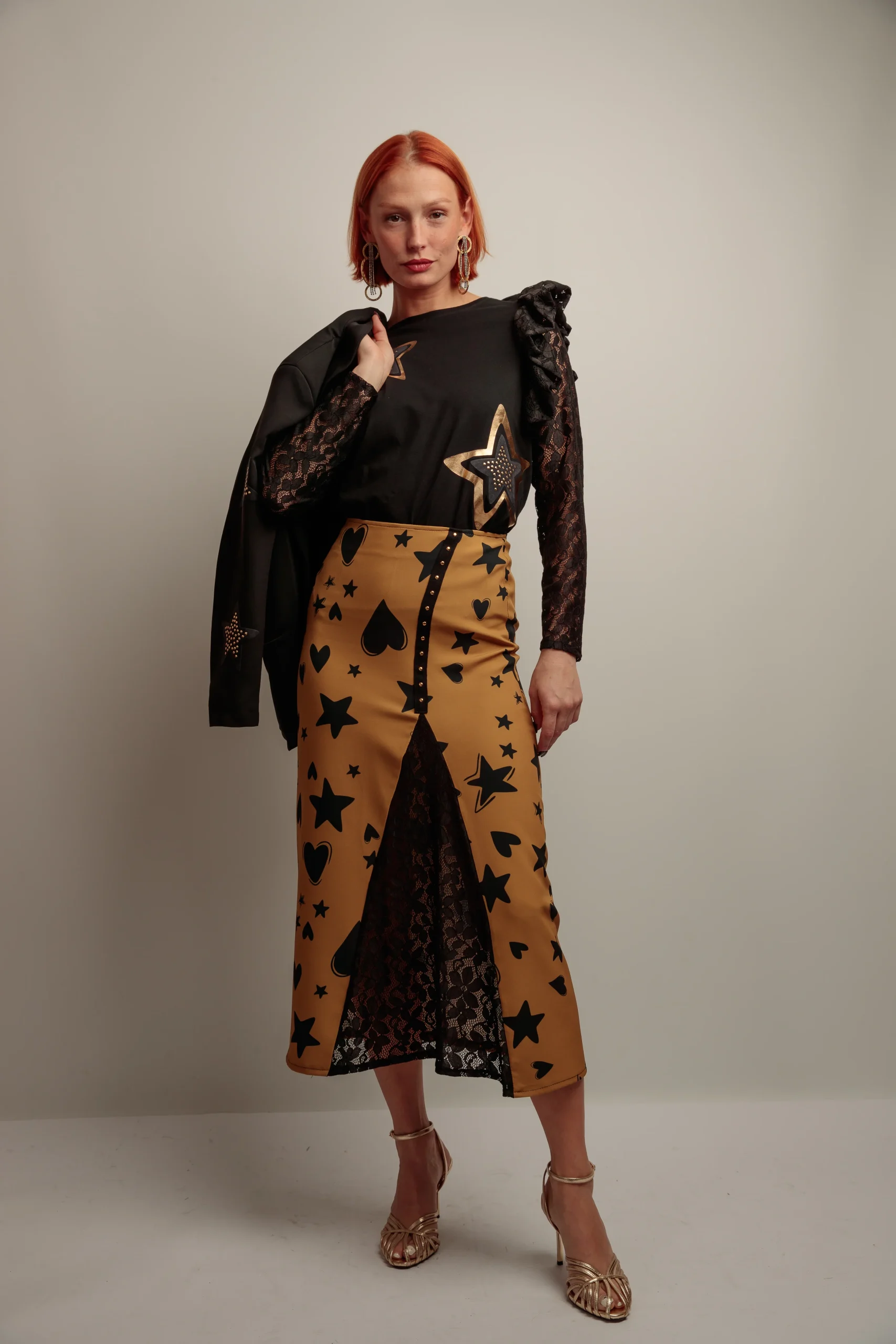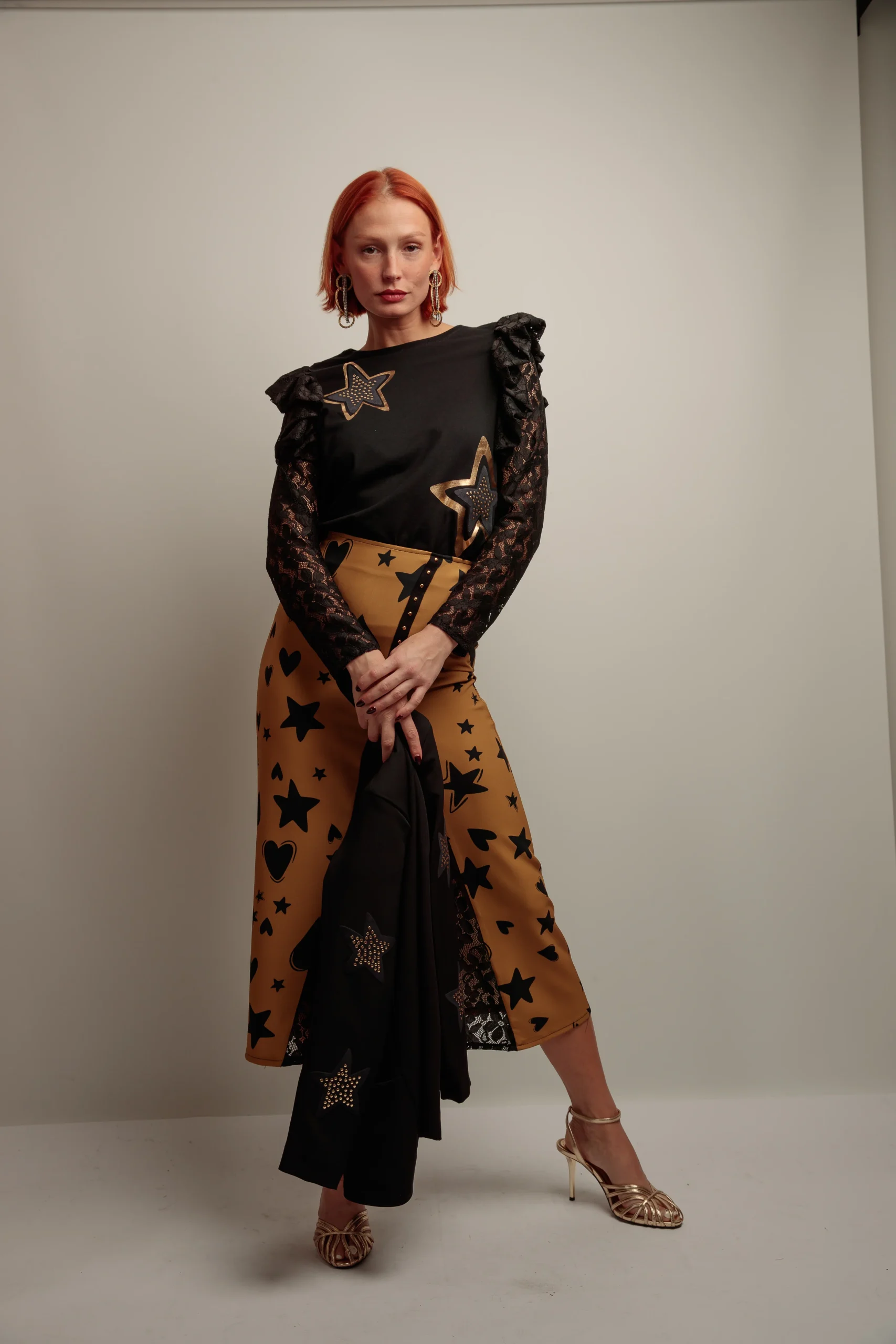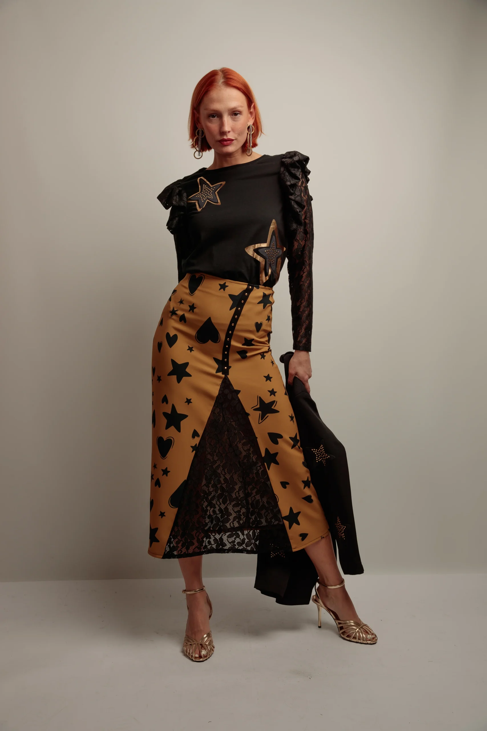 Camiseta de algodón en color negro, con cuello redondo, corte evasé y bajo asimétrico. Detalle de manga larga adaptada al brazo confeccionada en tejido de encaje negro, volante de encaje en el hombro. Diseño frontal de parches de estrellas realizados con lentejuelas doradas. Confeccionado en Vigo.