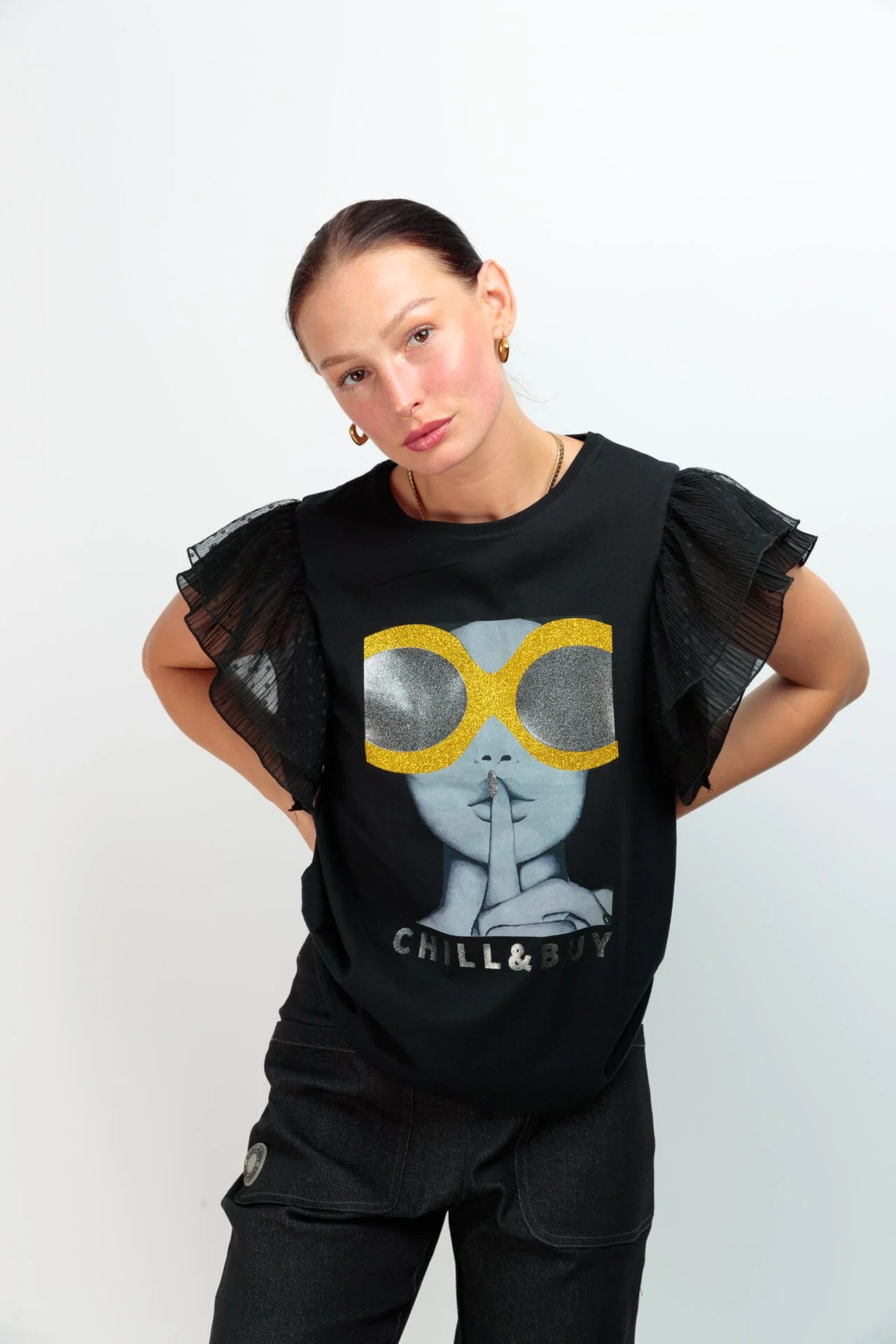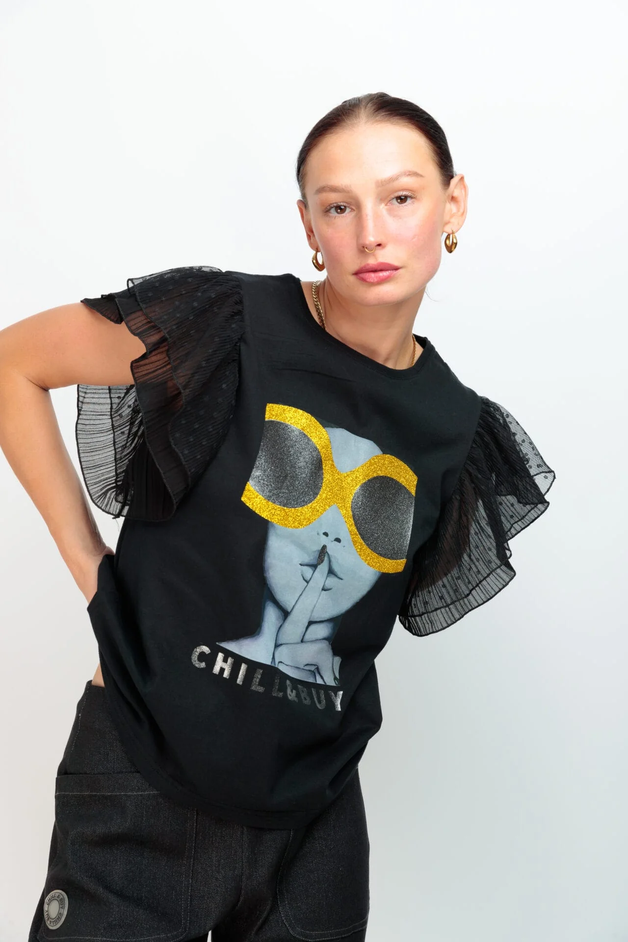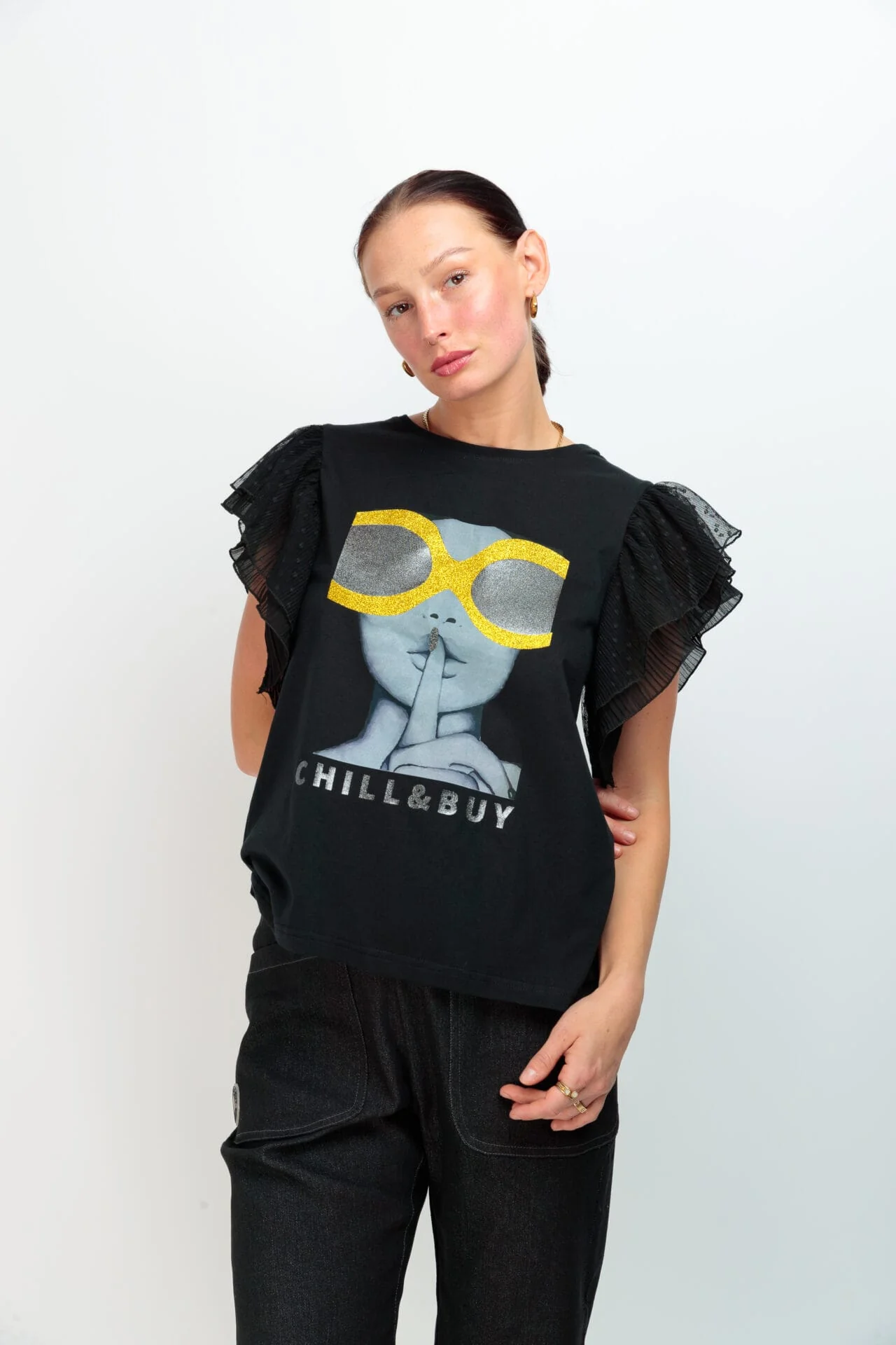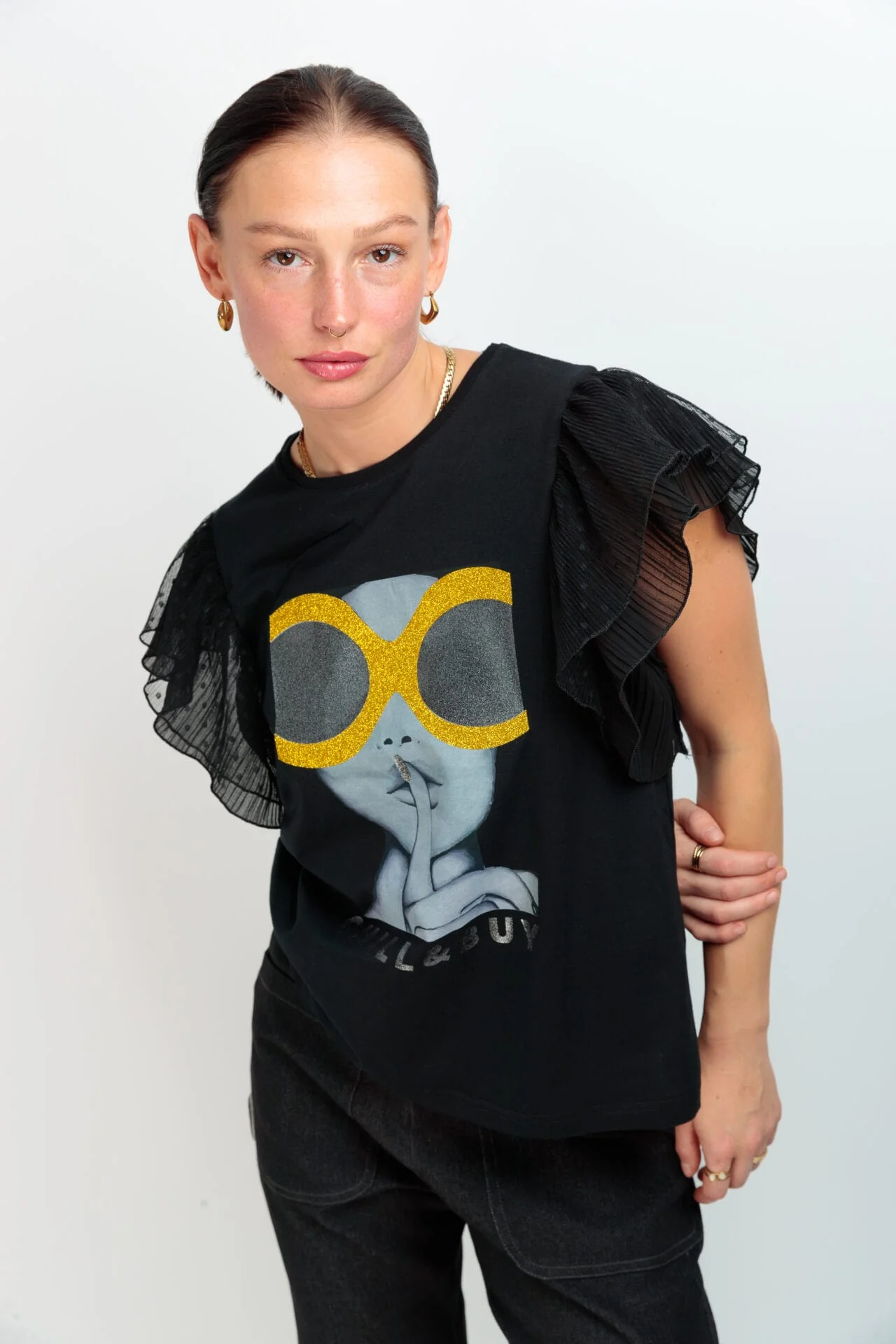 Camiseta de algodón , cuello redondo, corte evasé y bajo asimétrico. Detalle de dos volantes de tul en la sisa. Estampación frontal blanco y negro con detalles en glitter dorado.