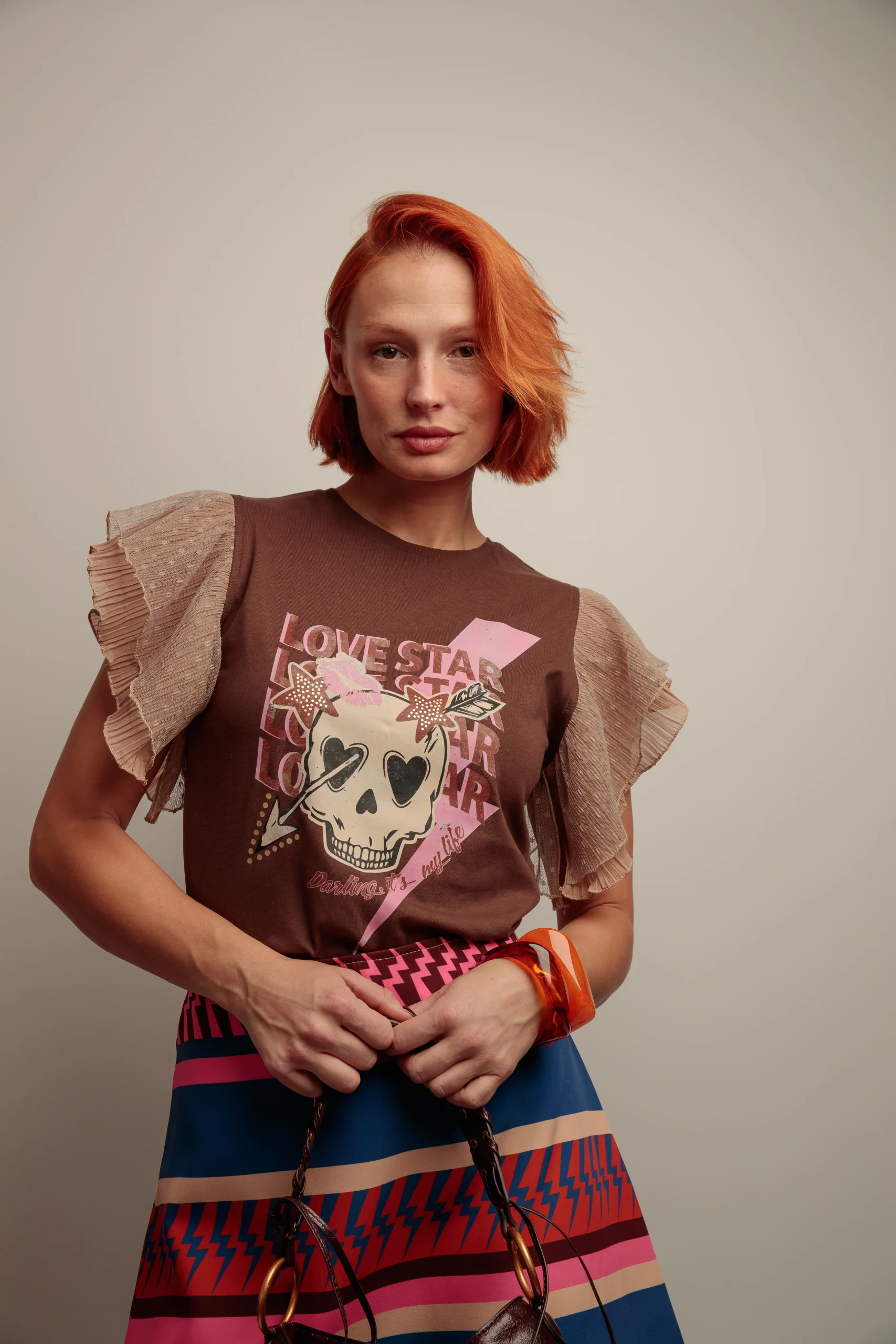 Camiseta de algodón con cuello redondo, corte entallado y bajo recto. Detalle de volantes doble de tul en el hombro en tono beige a contraste. Estampación frontal. Confeccionado en Vigo.