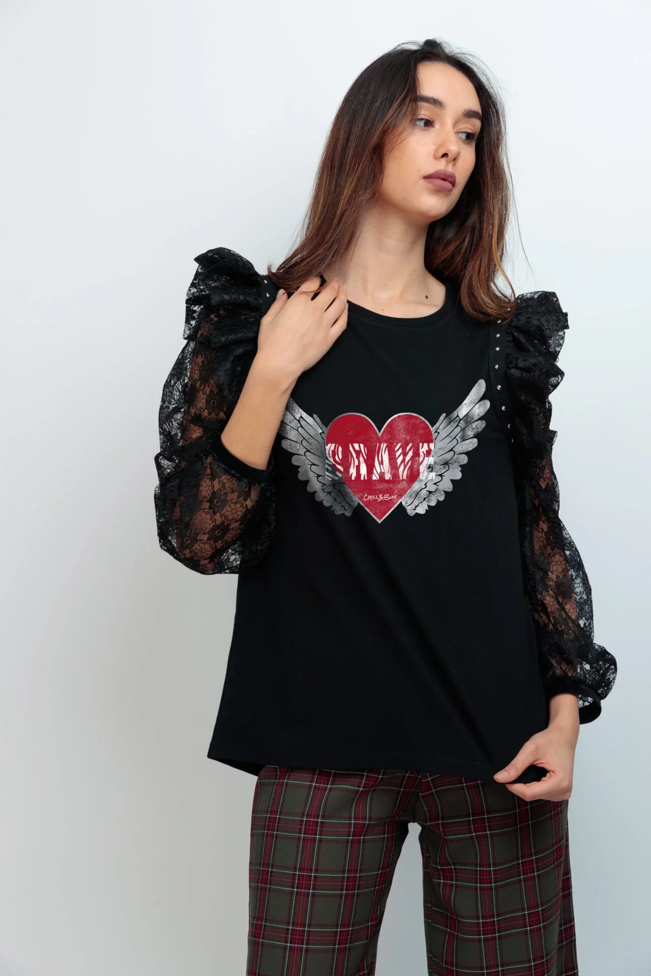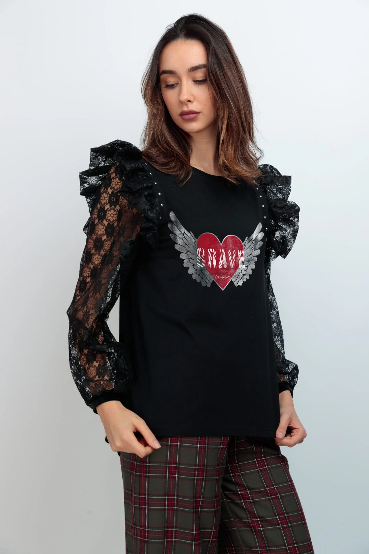 Camiseta de algodón en color negro con cuello redondo, corte evasé y bajo asimétrico, detalle de mangas abullonadas de encaje con volante en sisa y tachuelas plateadas. Estampación delantera.
