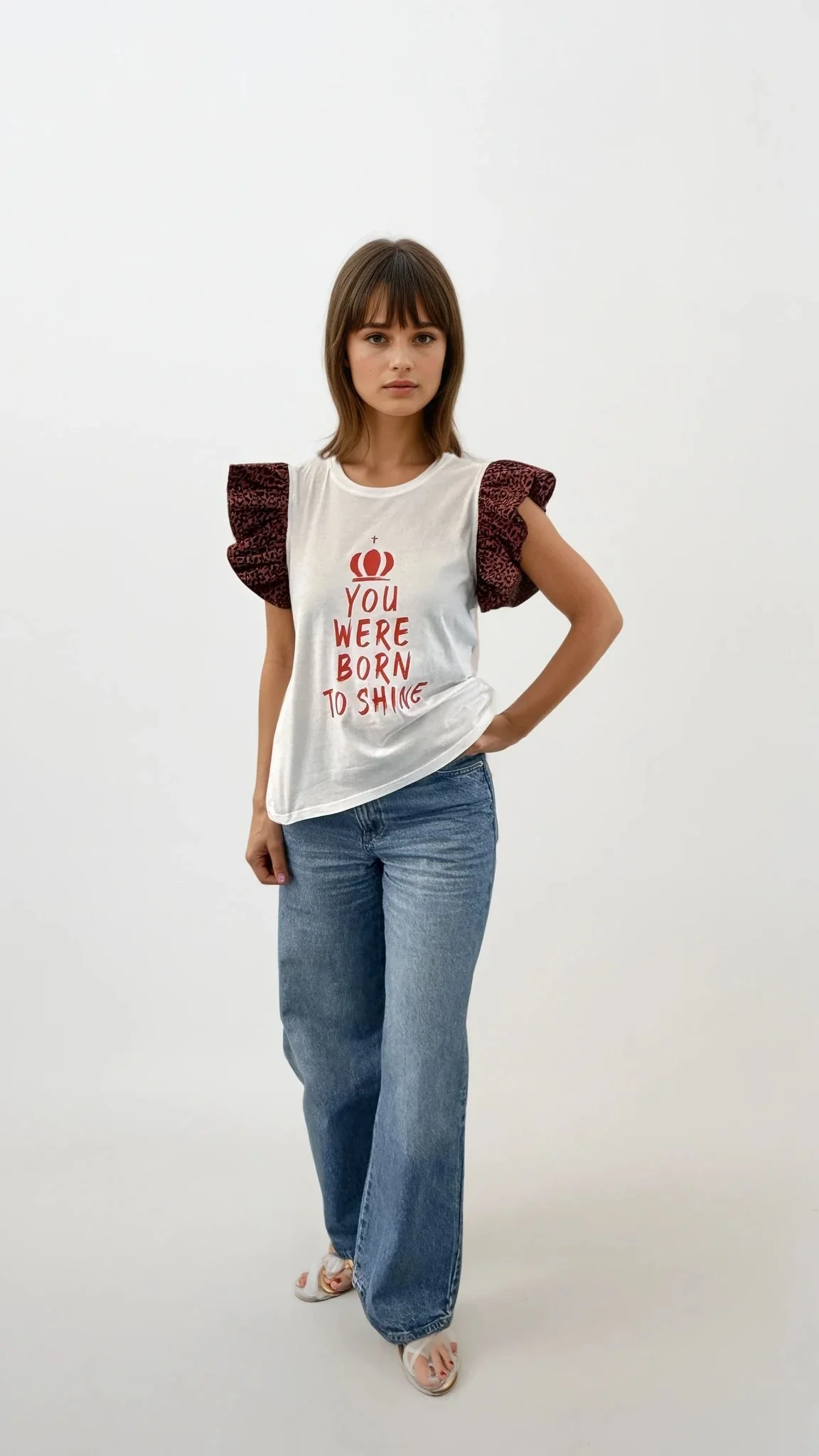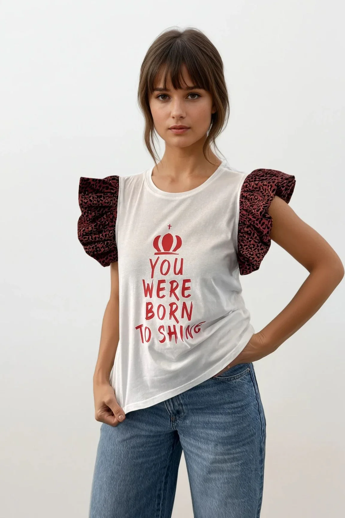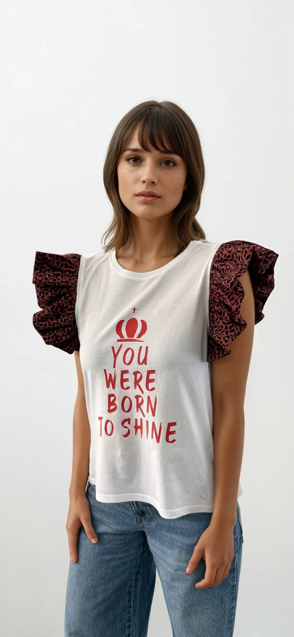 El diseño se completa con una estampación frontal en color rojo, con el mensaje «YOU WERE BORN TO SHINE» y un sÃmbolo de corona, un guiño directo al poder personal, la autenticidad y la autoafirmación. Una prenda que combina actitud, diseño y comodidad en una misma pieza.