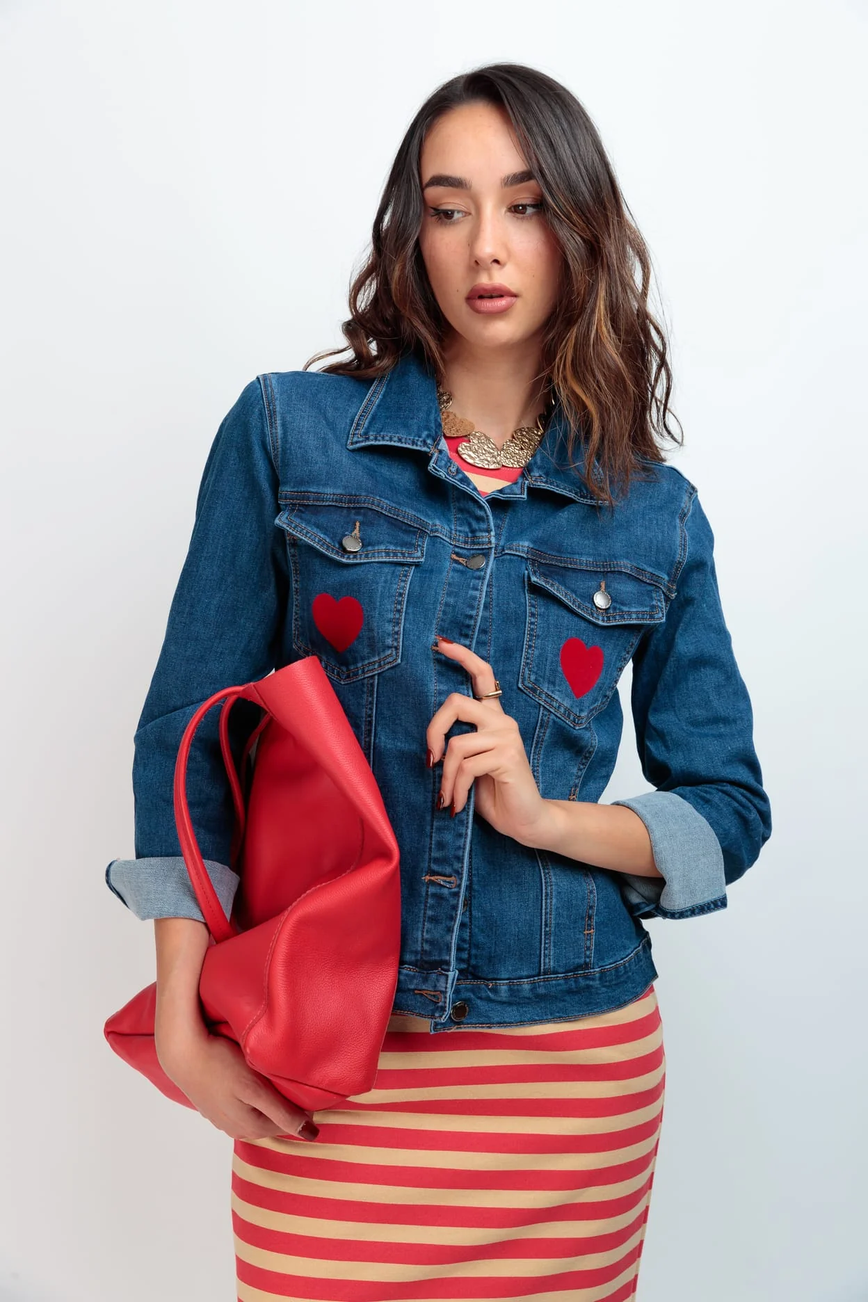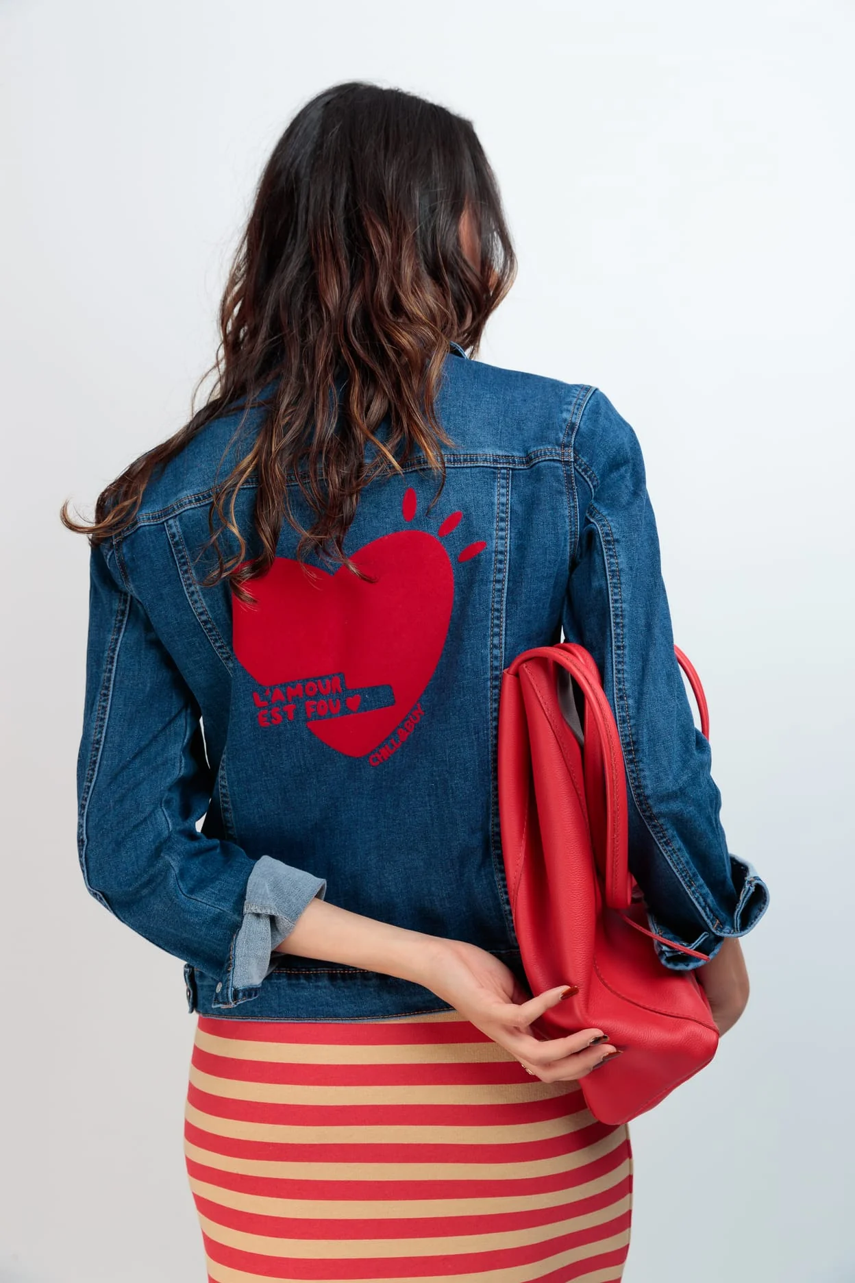 Cazadora Vaquera Azul corta, con bolsillos y cierre con botones met谩licos. Detalle de estampaci贸n en la parte trasera y delantera.