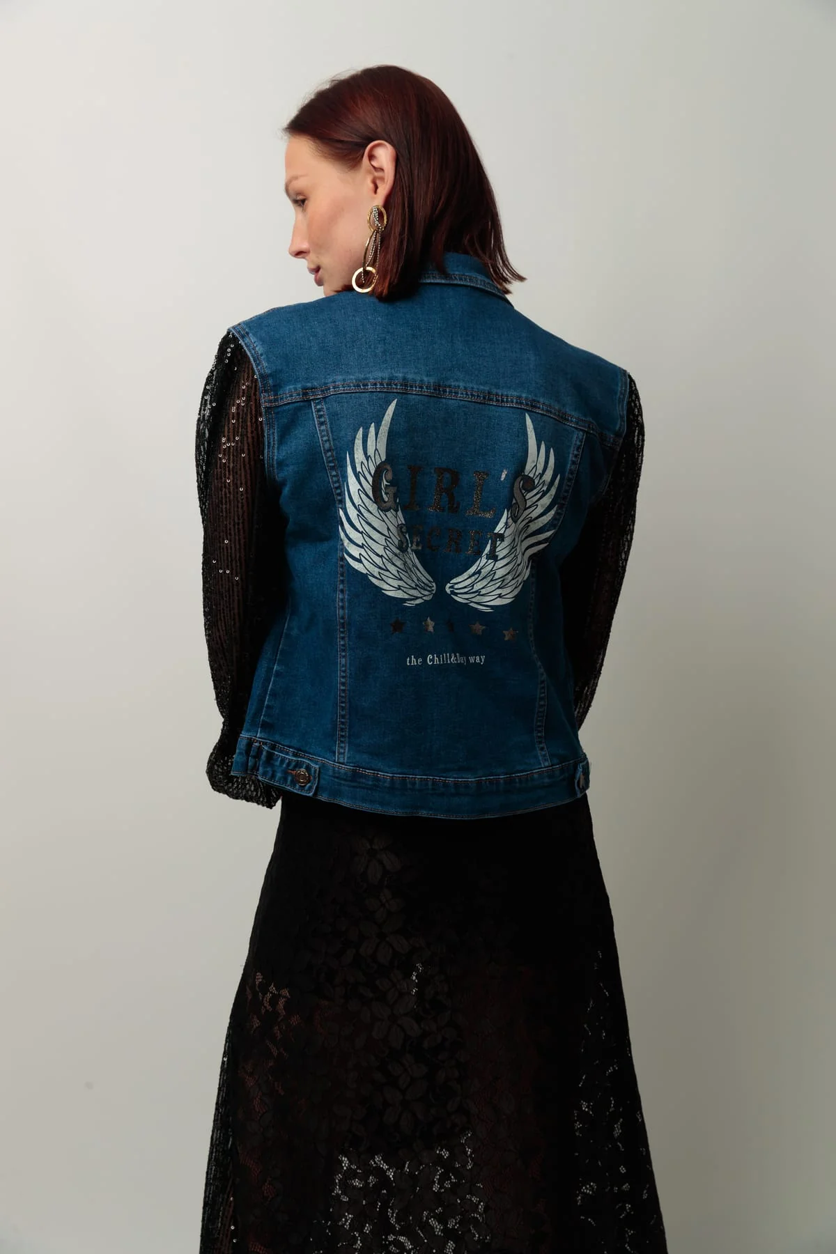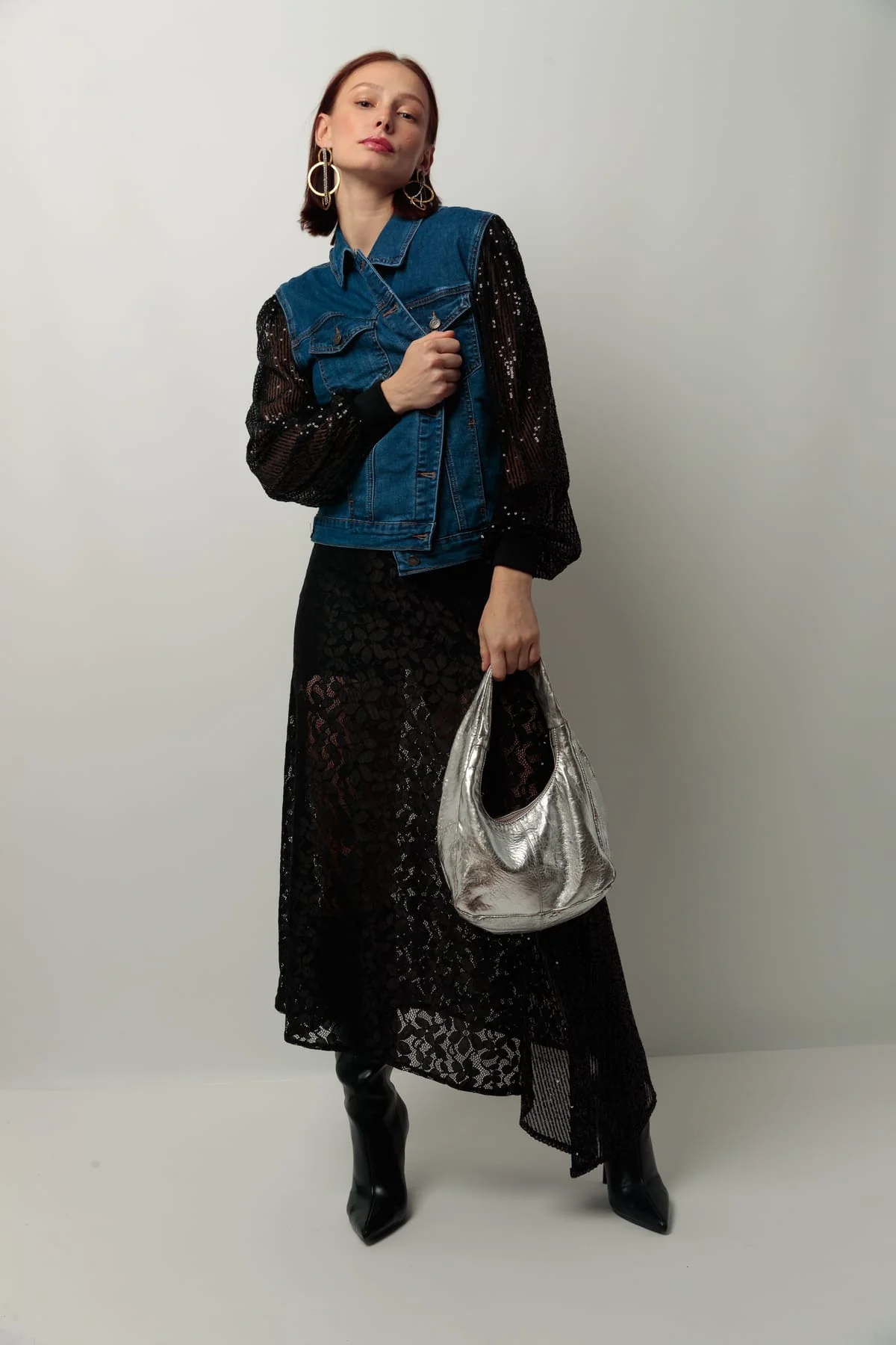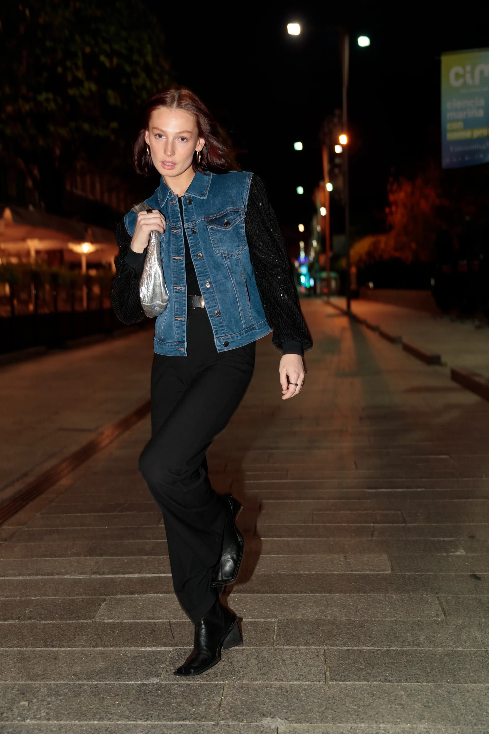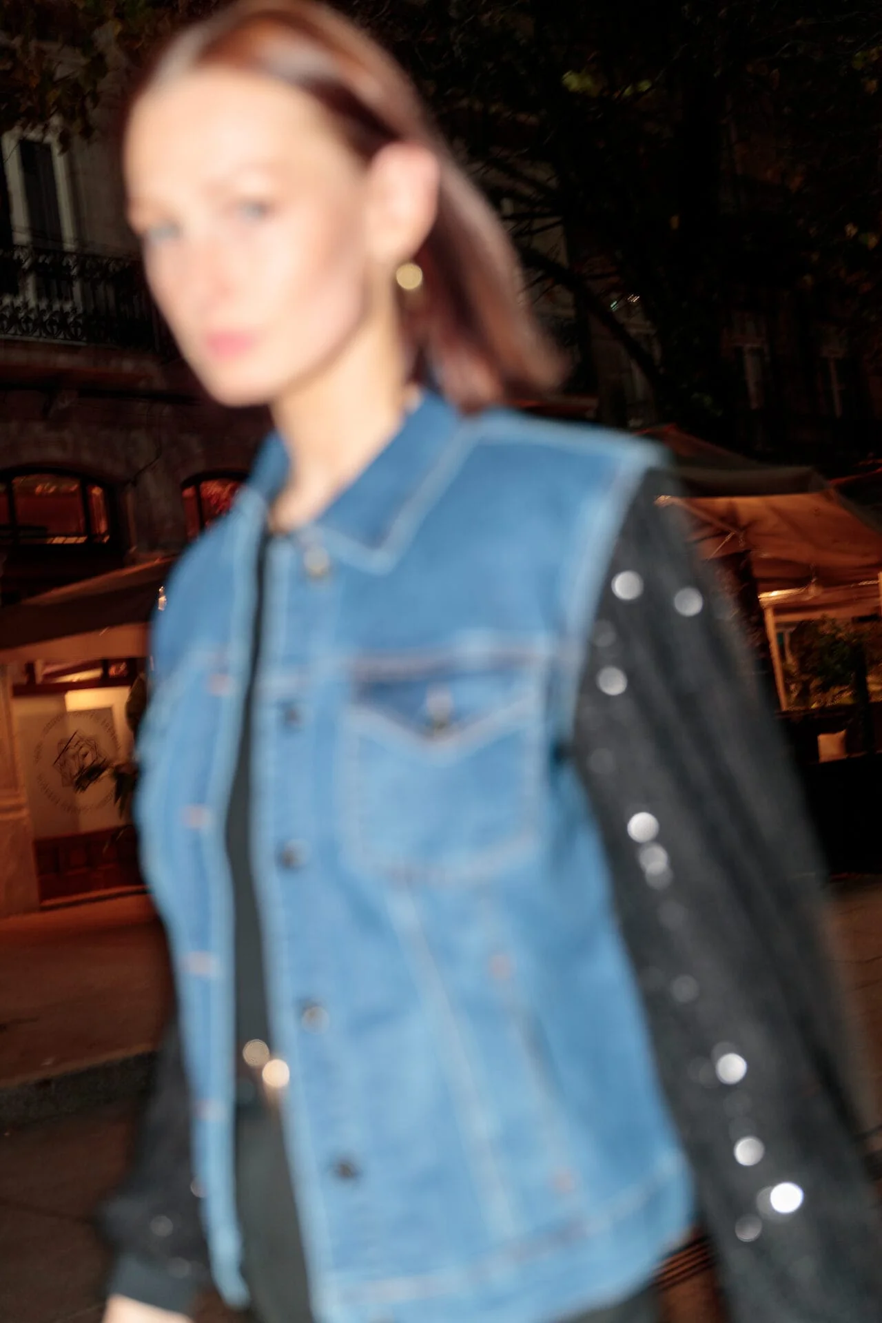 Chaqueta de cuello solapa y manga larga abullonada de lentejuelas en color negro acabada en puño. Bolsillos de plastrón con solapa y botón. Cierre frontal. Diseño en la espalda.