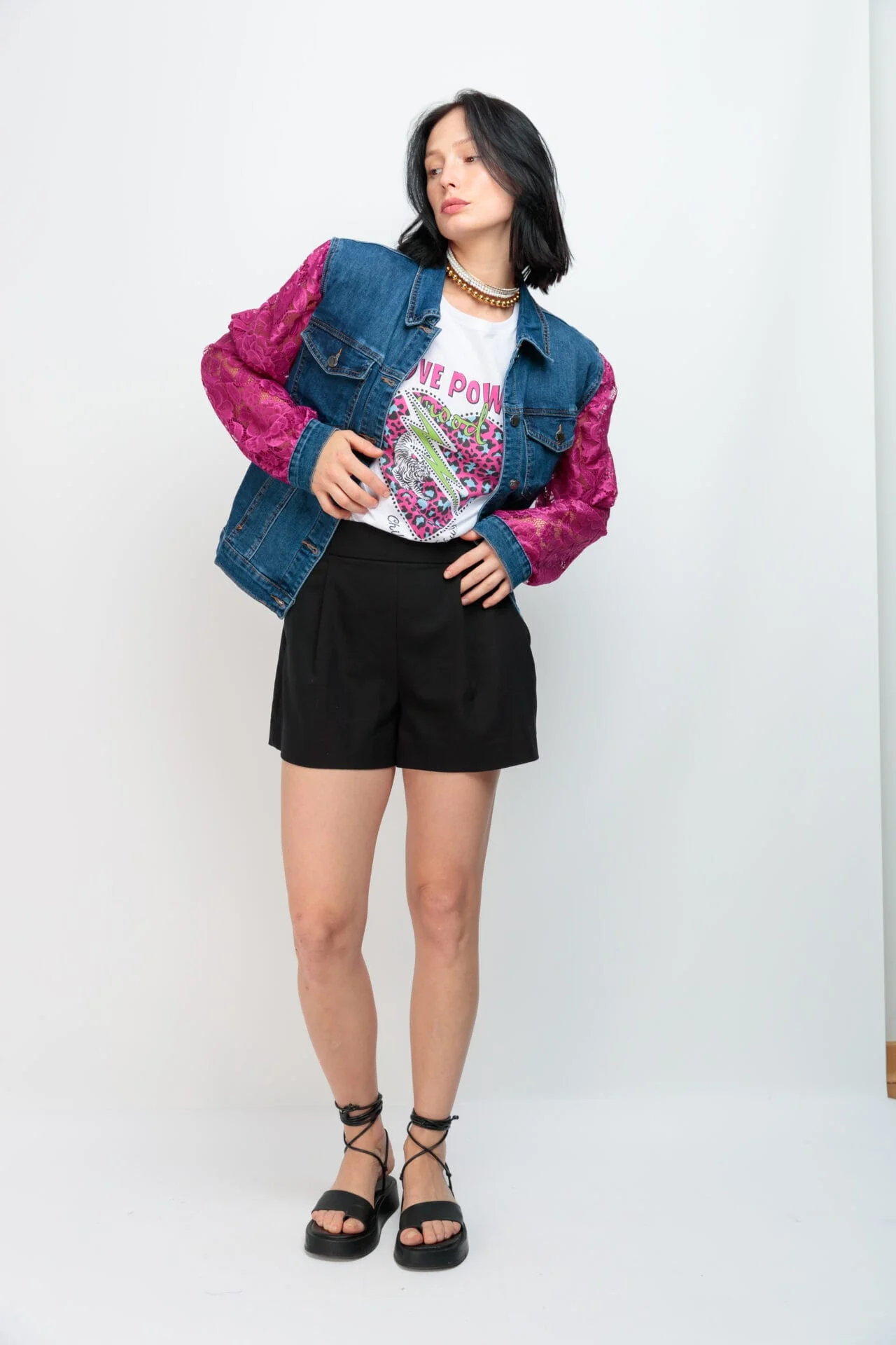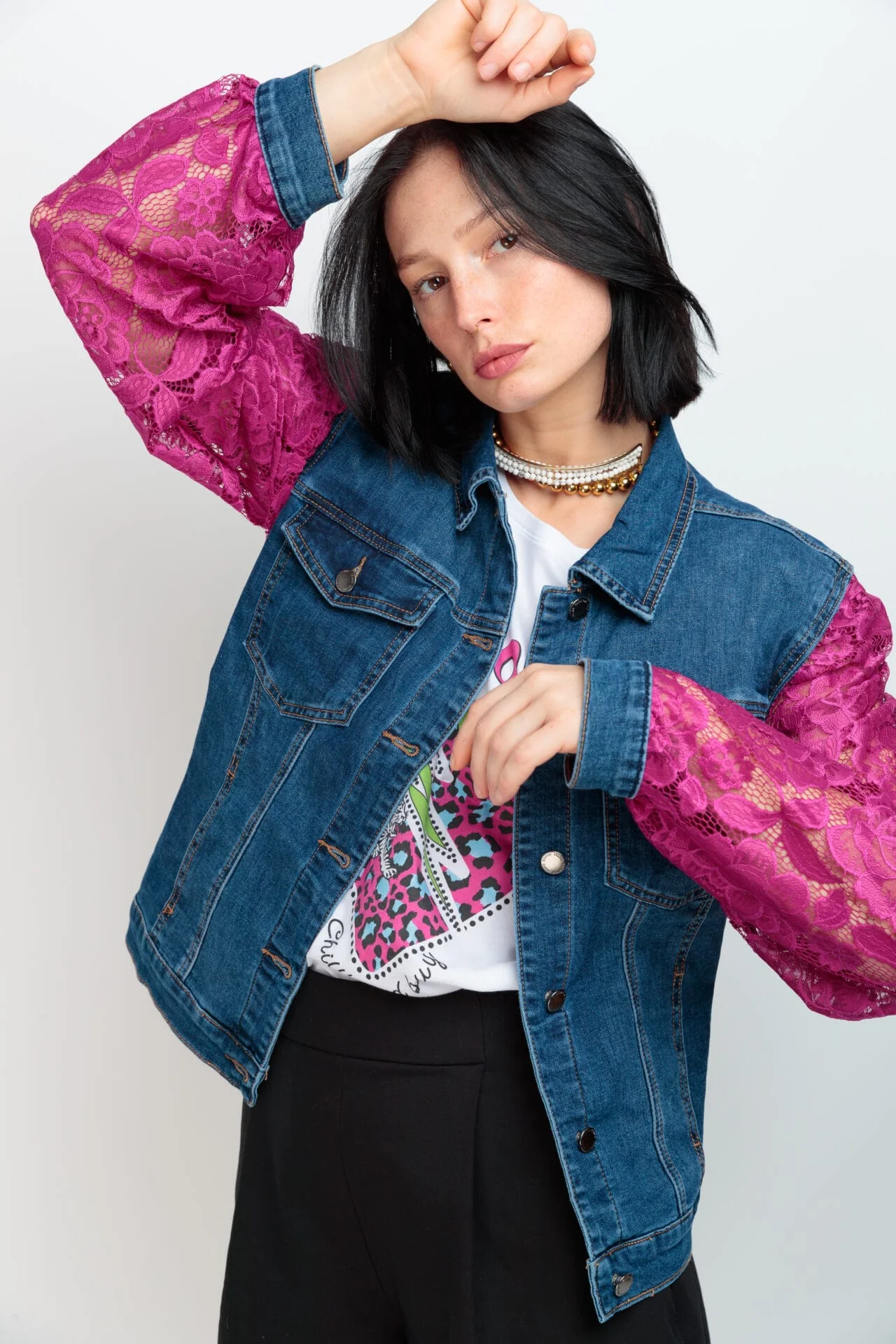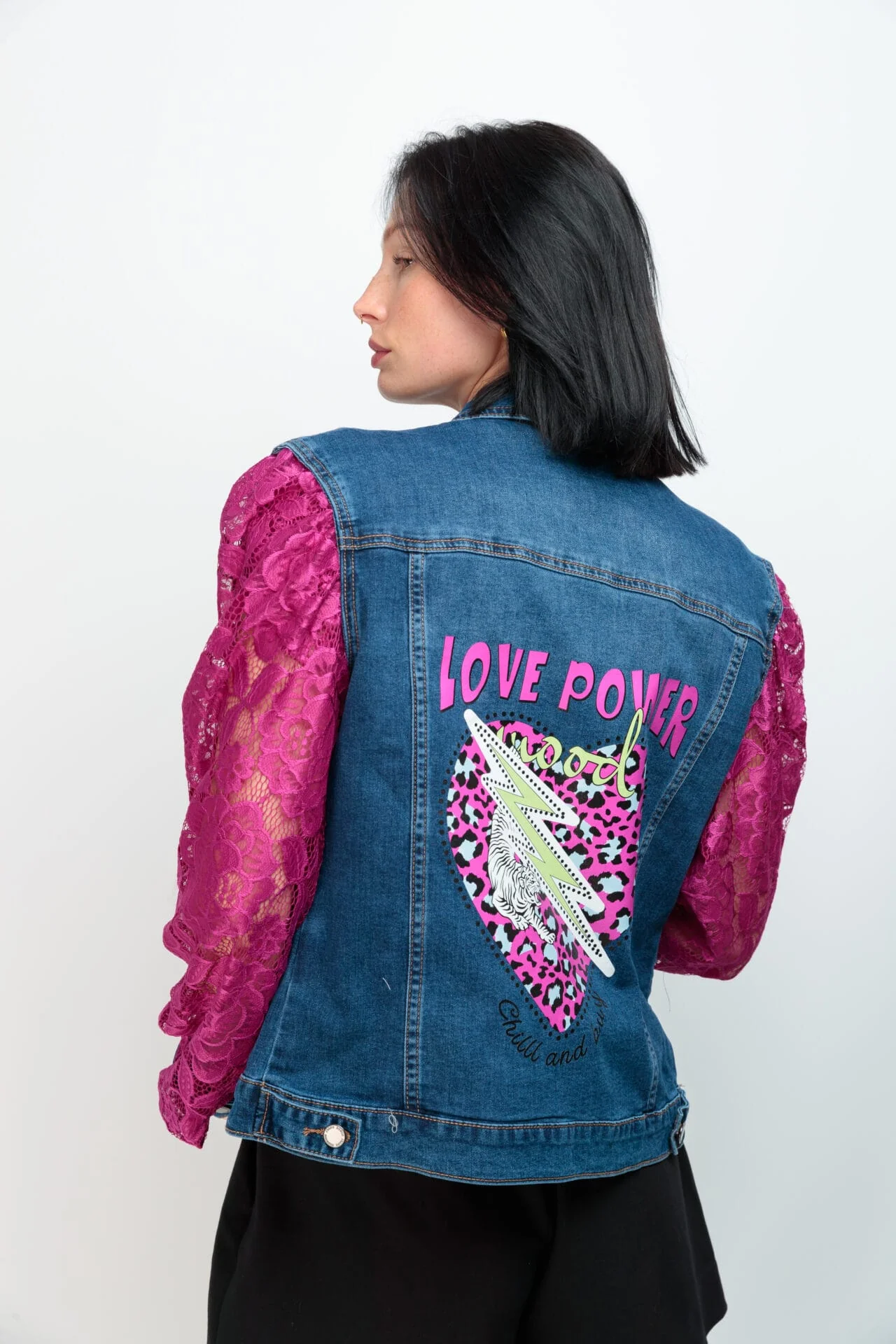 Cazadora Zadig Power Cazadora vaquera corta con bolsillos y botones metálicos. Mangas abullonadas en encaje fucsia con puños denim. Detalle gráfico en la espalda. Hecho en Vigo.