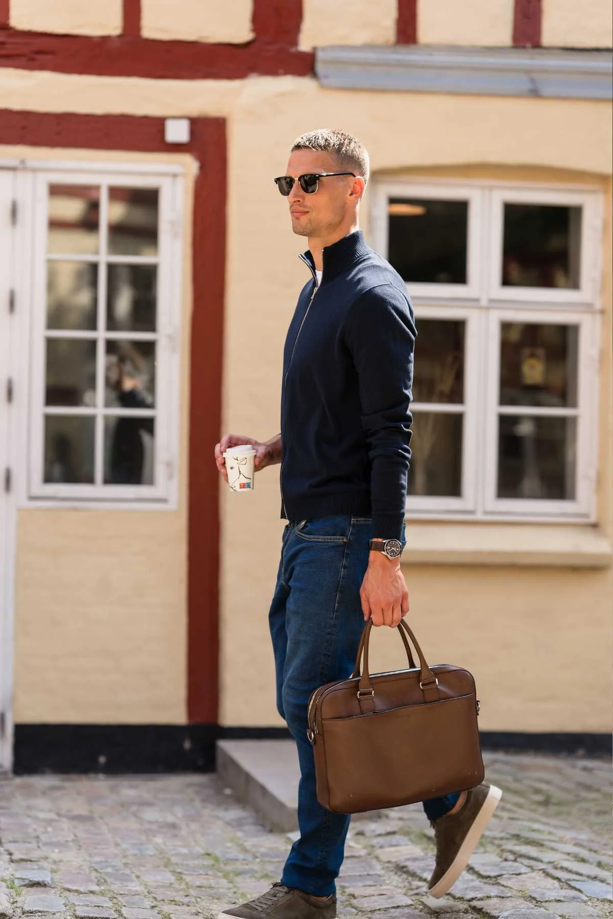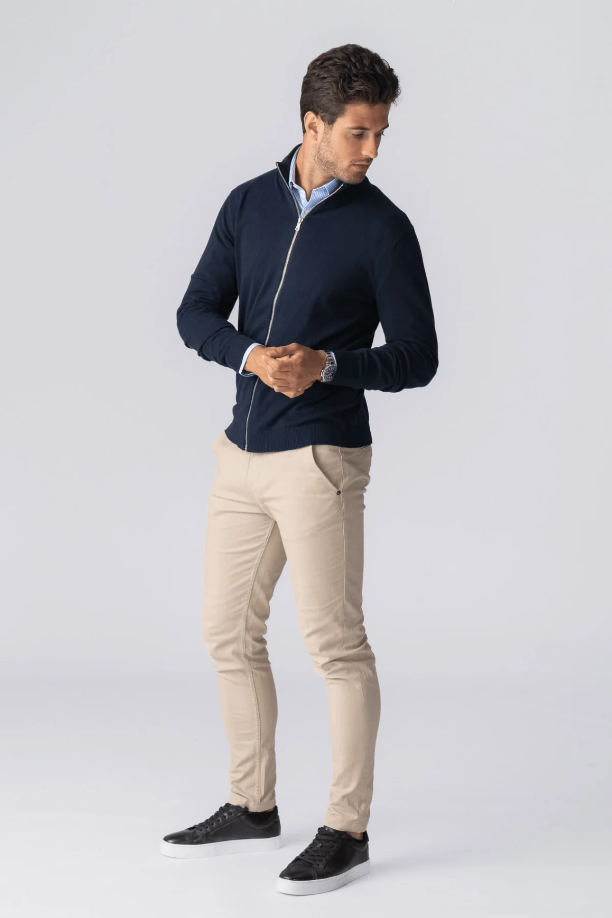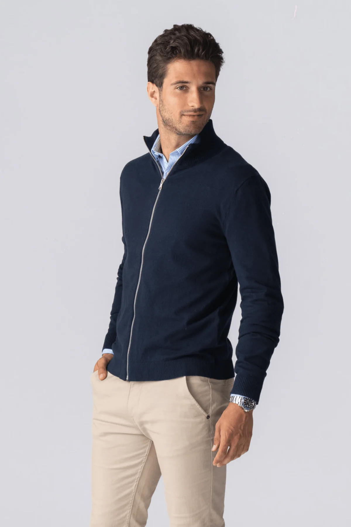 Te presentamos nuestra chaqueta de punto con cremallera en azul marino, diseñada para redefinir tus básicos de armario con una mezcla perfecta de estilo y funcionalidad. Confeccionado exclusivamente para hombre, este cárdigan encarna la sofisticación y la comodidad, convirtiéndolo en un artículo imprescindible para todo caballero.