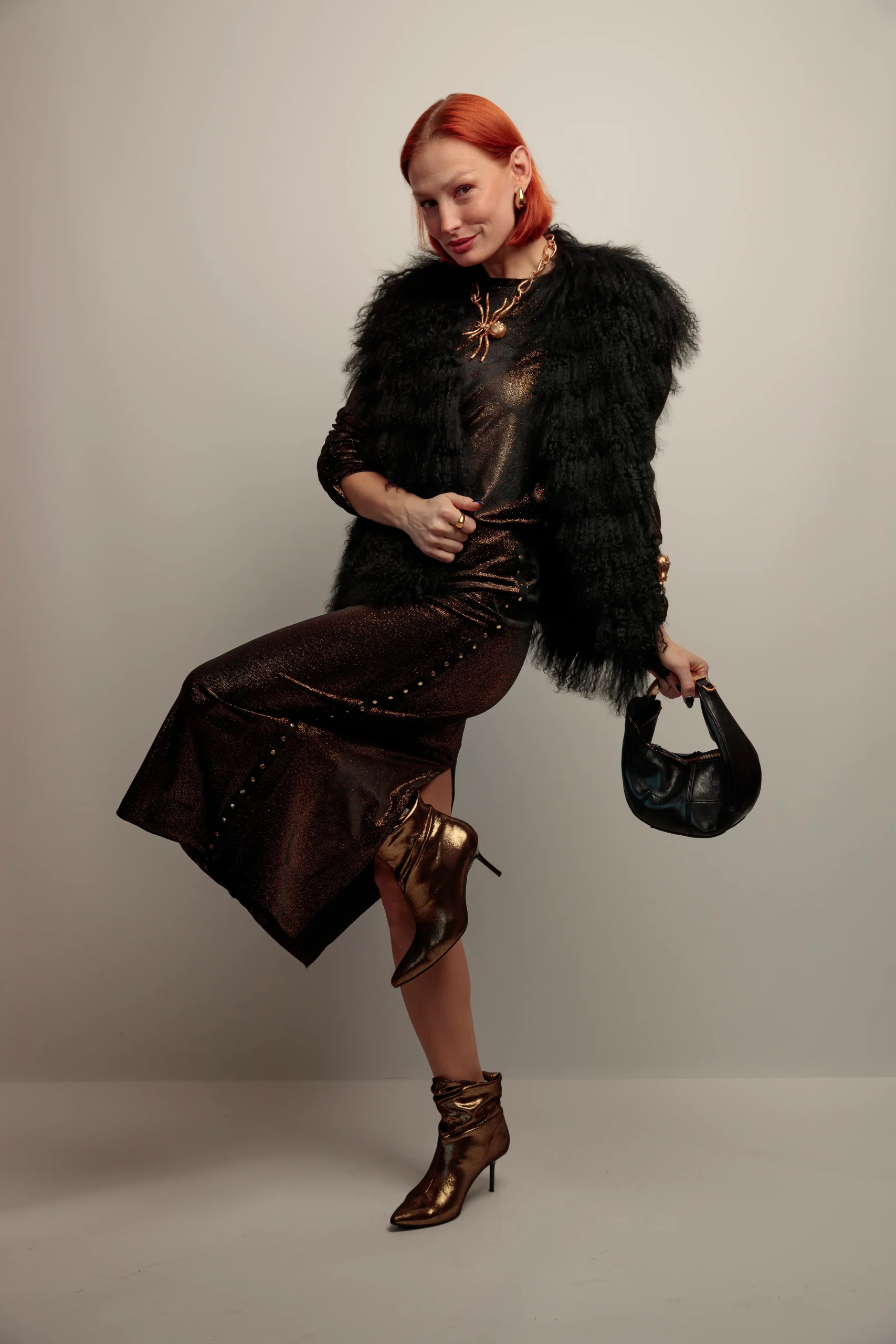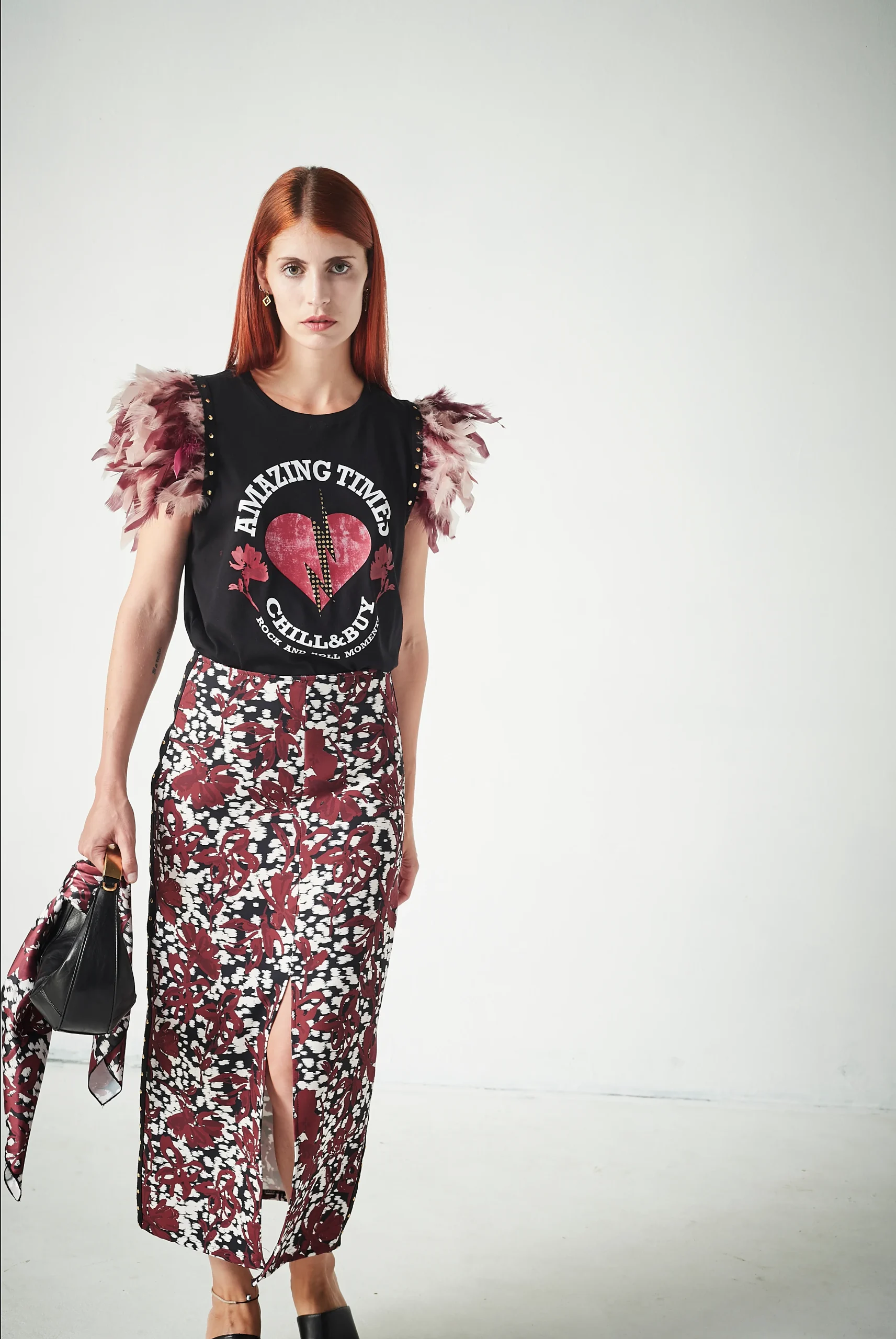 Falda larga de mujer, corte entallado, sin cintura, cierre con cremallera en la parte posterior. Detalle de abertura trasera y encaje en el bajo. Tejido estampado en tonos negros y granates. Confeccionada en Vigo.