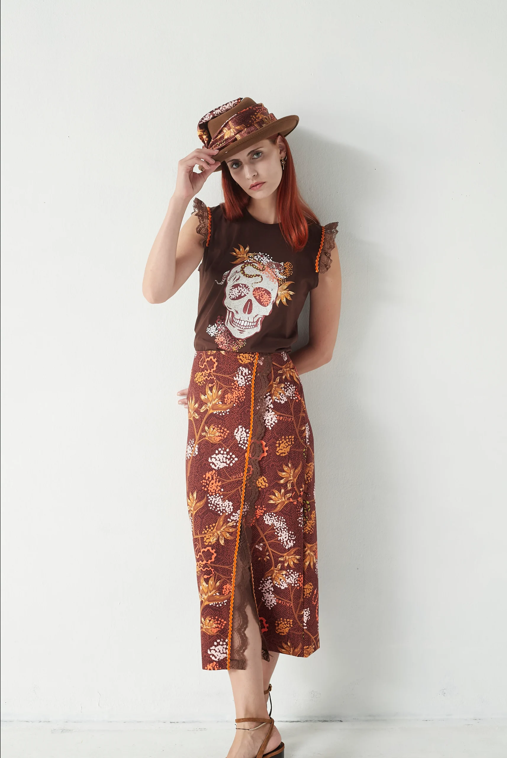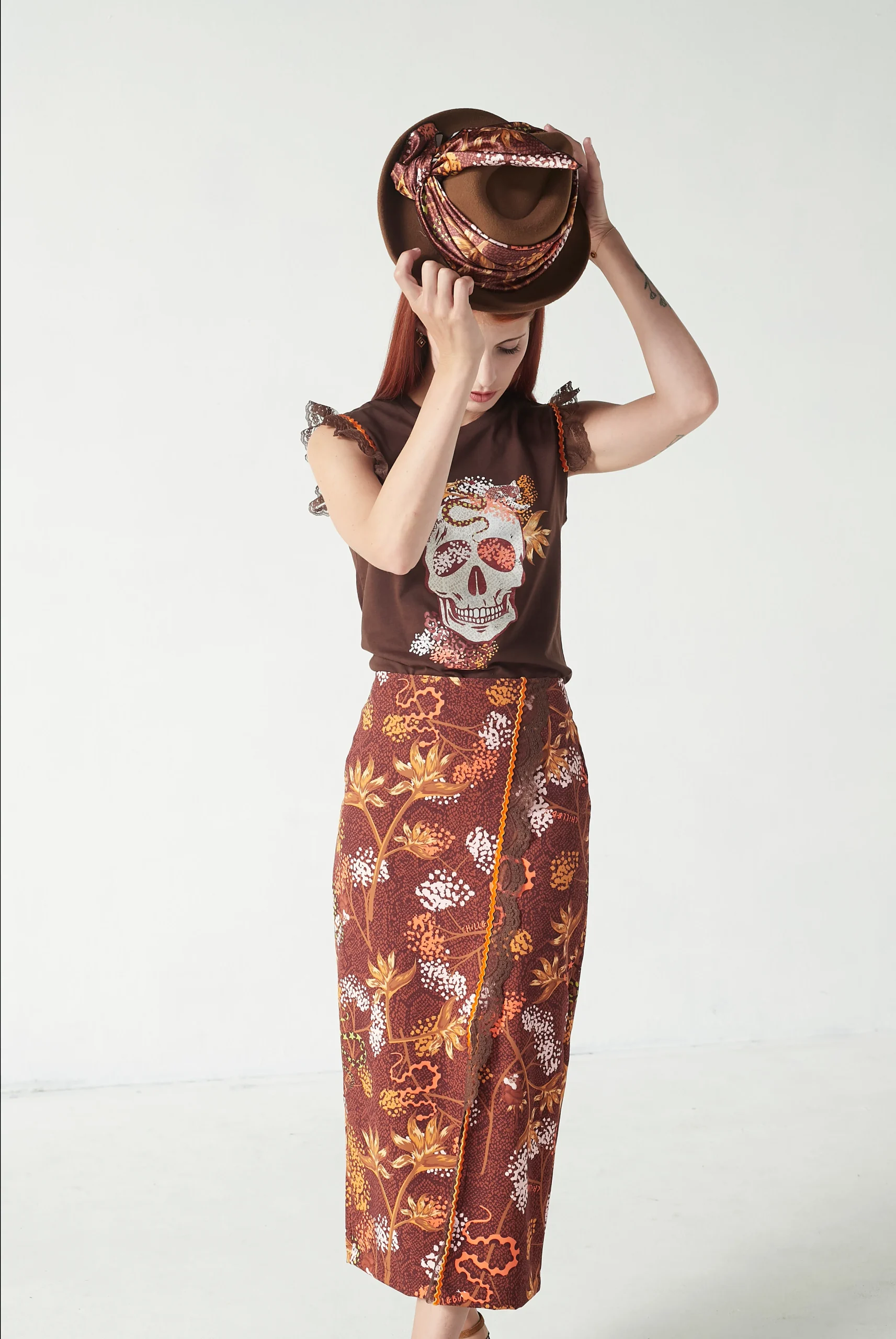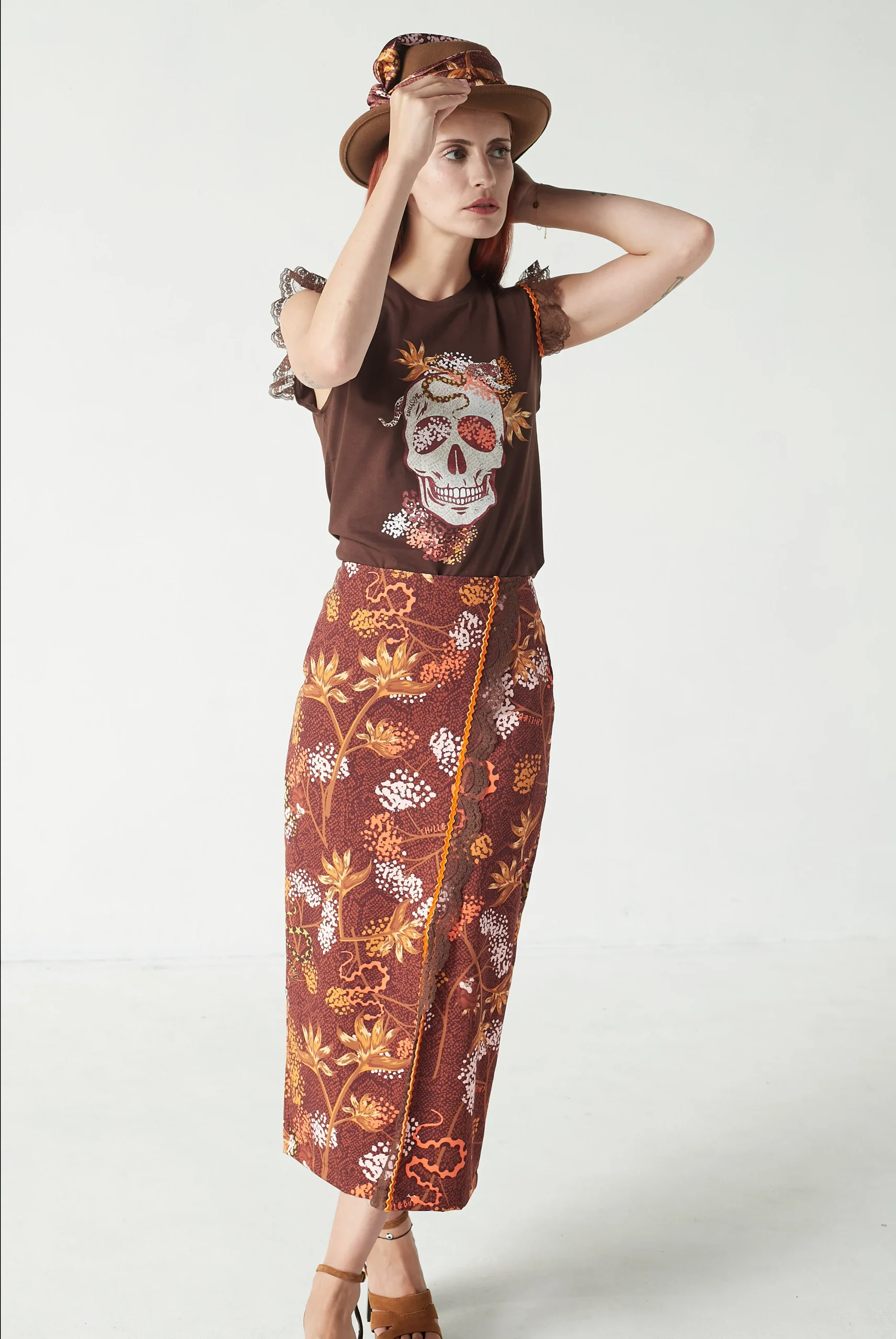 Falda lápiz confeccionada en tejido estampado en tonos marrones y naranjas, con un diseño elegante y detalles diferenciadores que aportan personalidad y estilo.