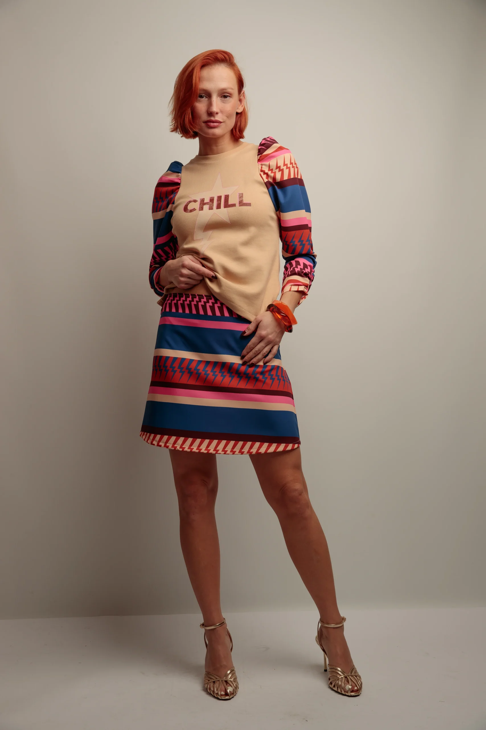 Falda mini de tiro alto sin cinturilla, que estiliza la silueta, con bajo evasé y cierre con cremallera oculta en la parte posterior. Confeccionado con tejido estampado.