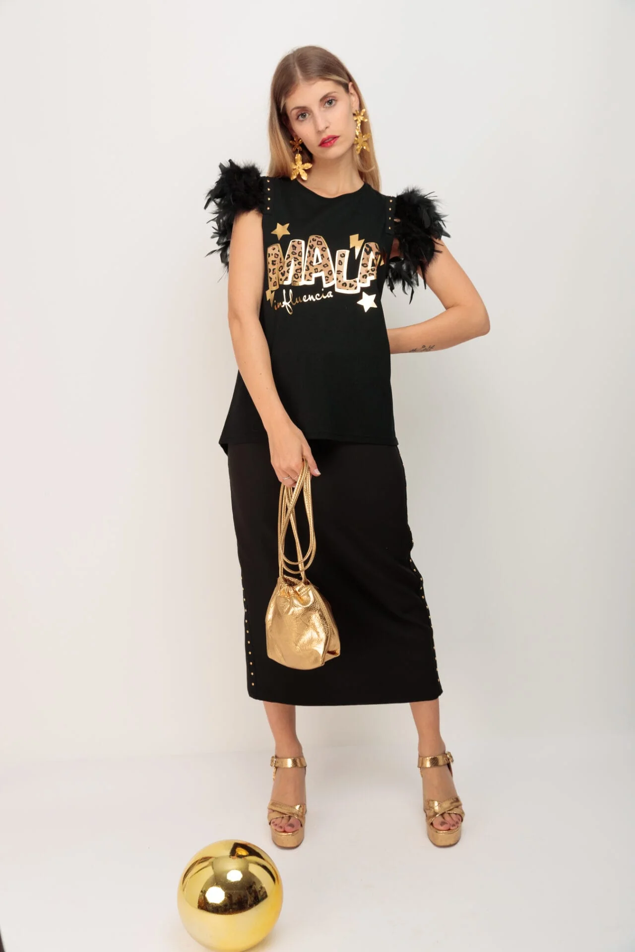 Falda larga con abertura trasera y detalle de tira de algodón tachuelas lateral. Cierre con cremallera en la espalda.