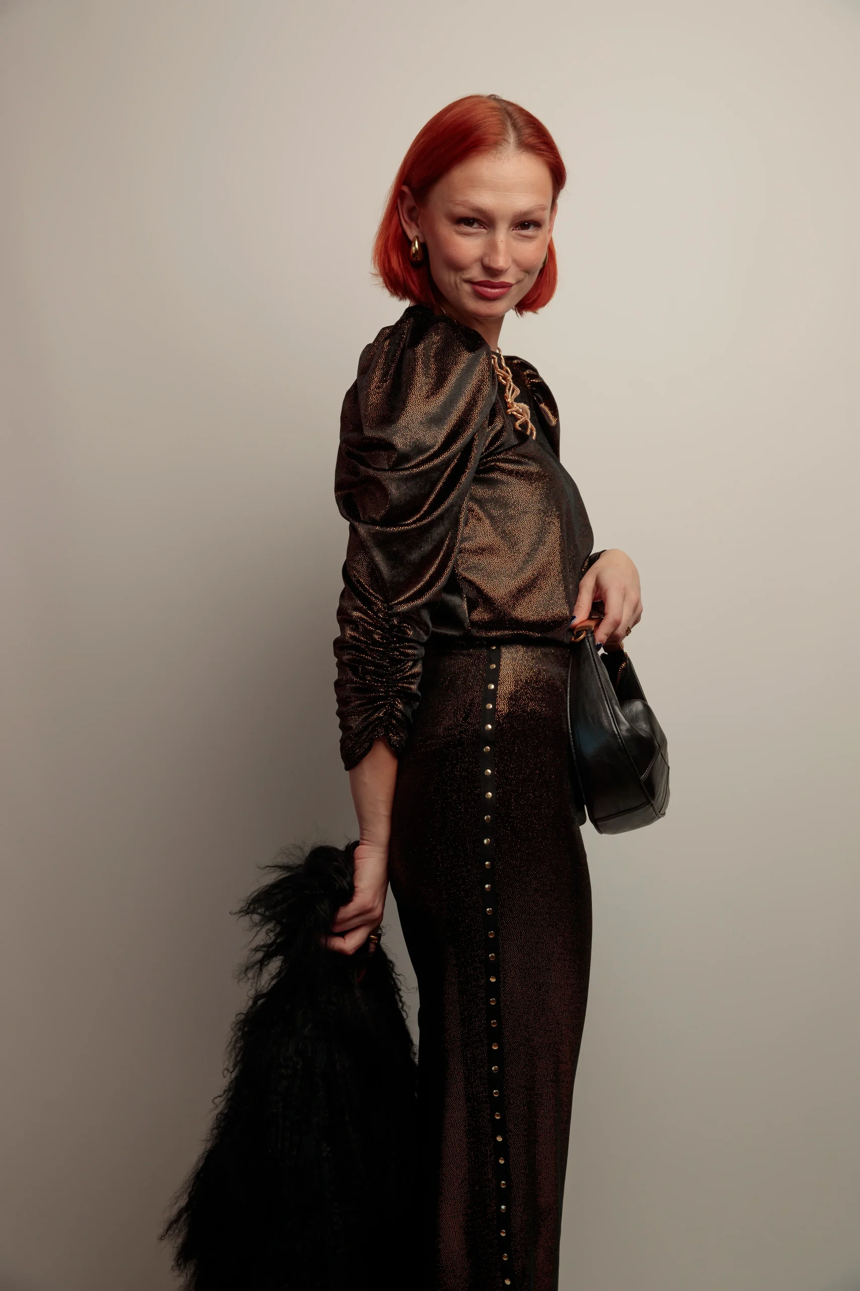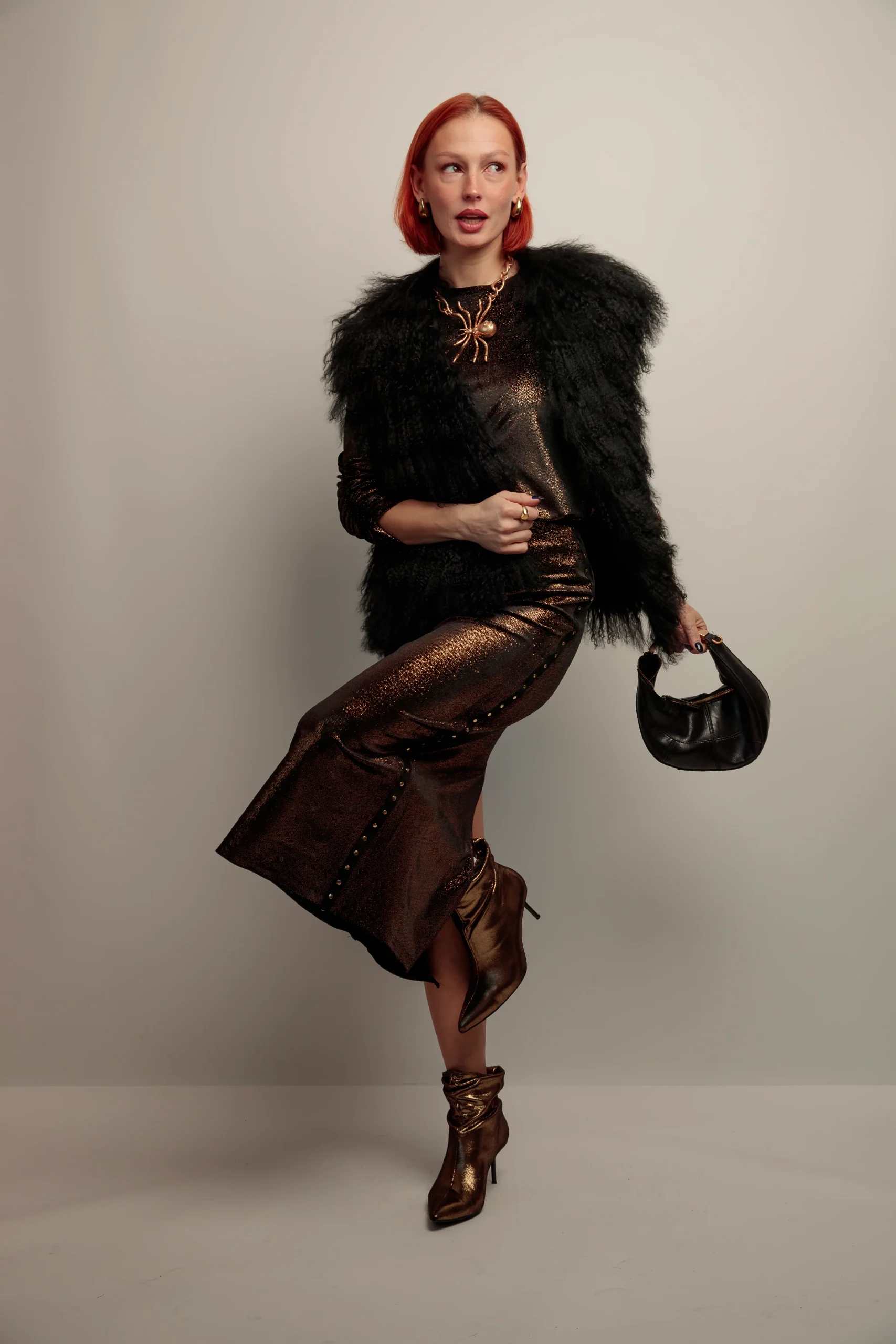Una pieza sofisticada y potente que realza la figura con un brillo sutil y elegante. Esta falda tubo está confeccionada en el mismo terciopelo negro con reflejos dorados de la colección, lo que le aporta un acabado luminoso y muy especial.