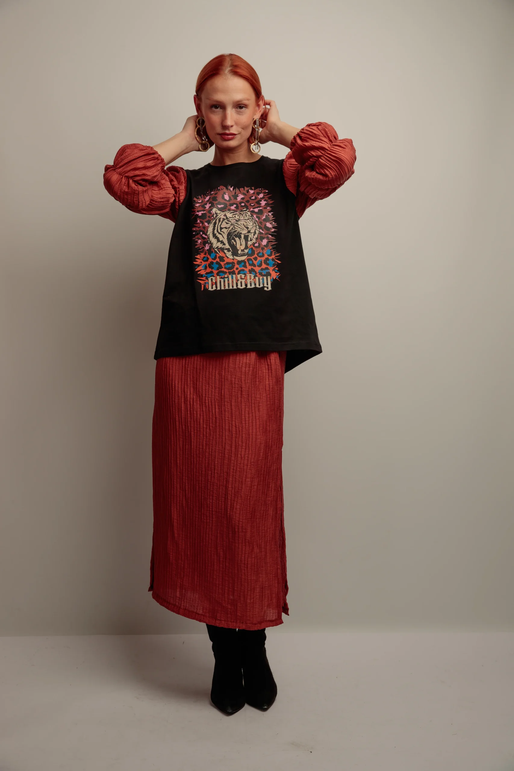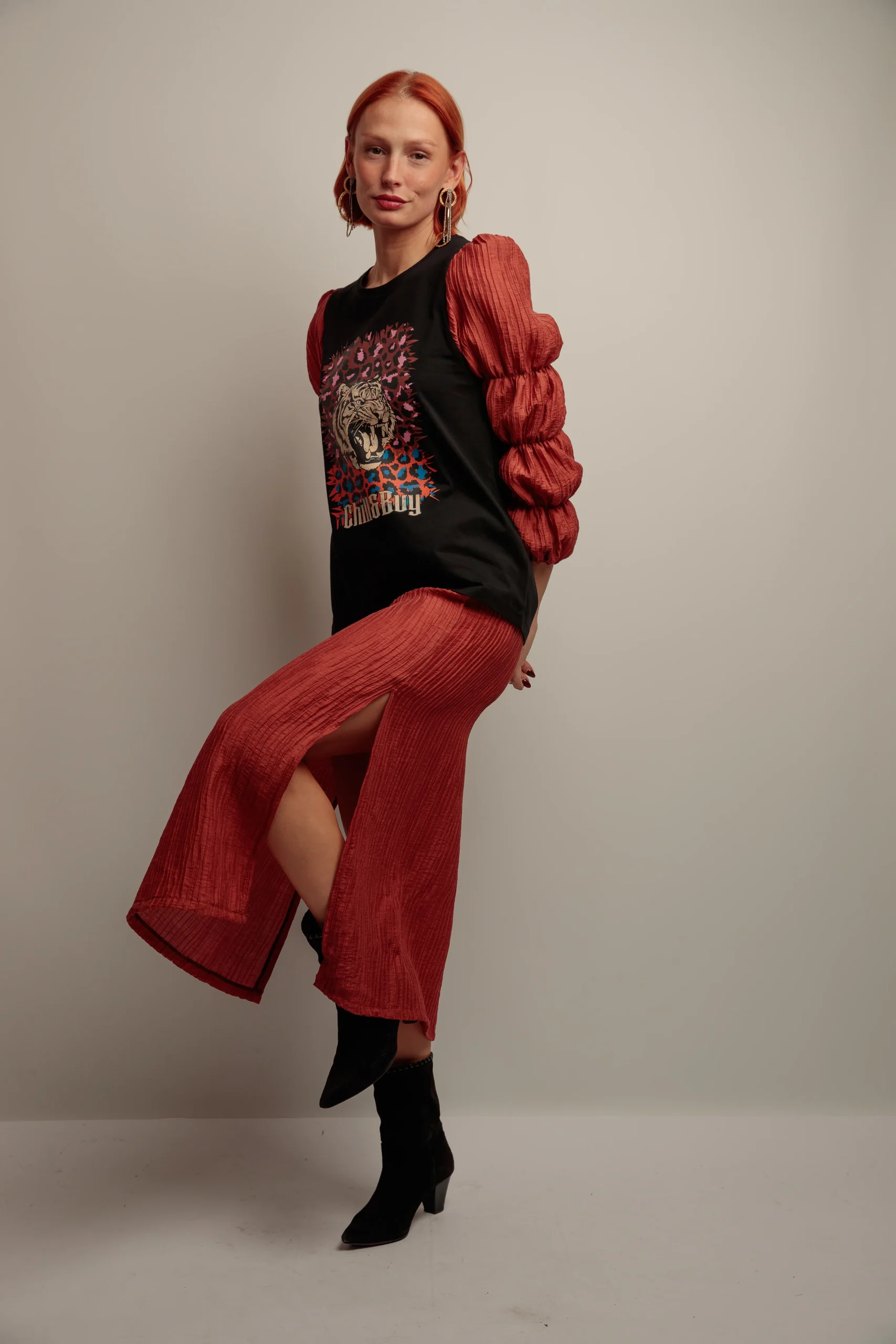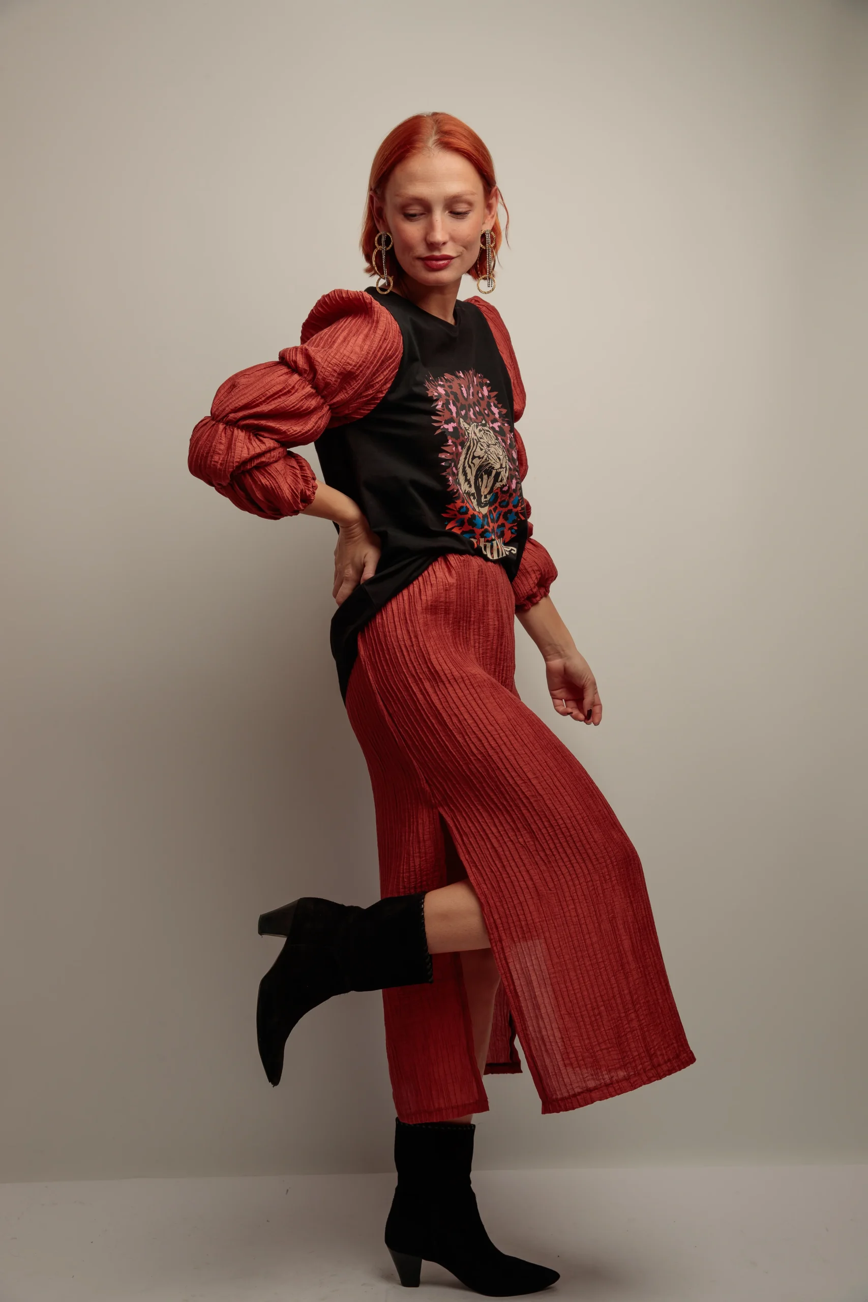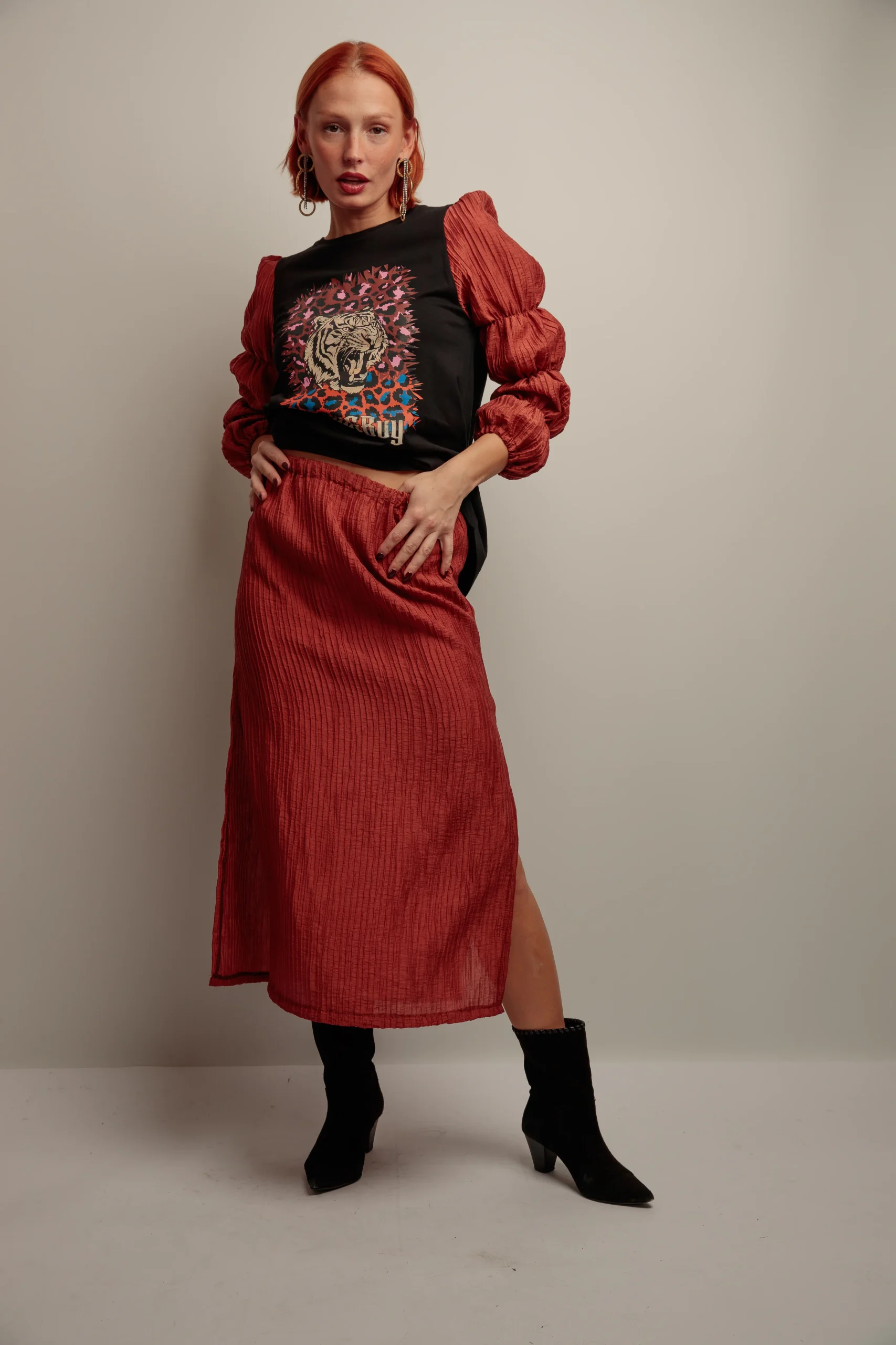 Falda recta confeccionada en un tejido plisado con textura ligera, en un cálido tono caldero que aporta carácter y versatilidad a cualquier look.