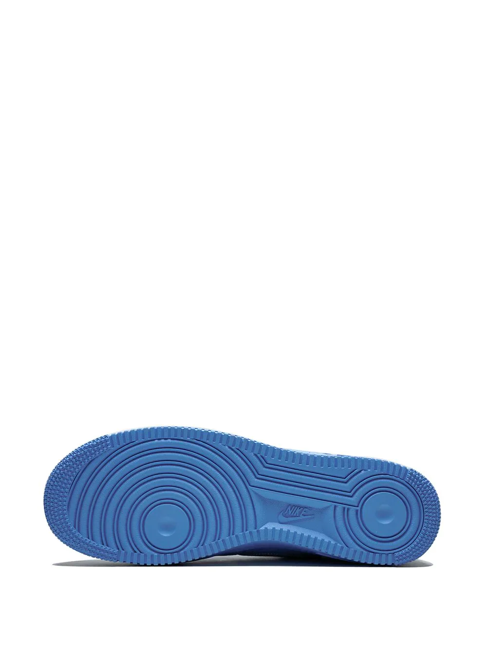 El Nike Air Force 1 Low University Blue con logotipos Nike Swoosh plateados metálicos en los laterales.