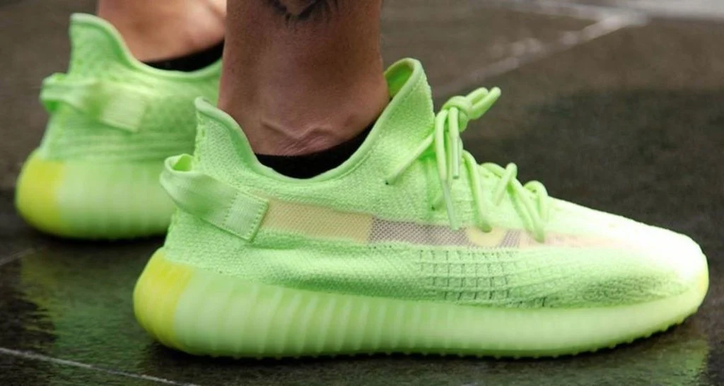Tenis Yeezy Boost 350 V2 Glow in The Dark de color verde de adidas con puntera de almendra, agujetas en la parte delantera y suela de goma.