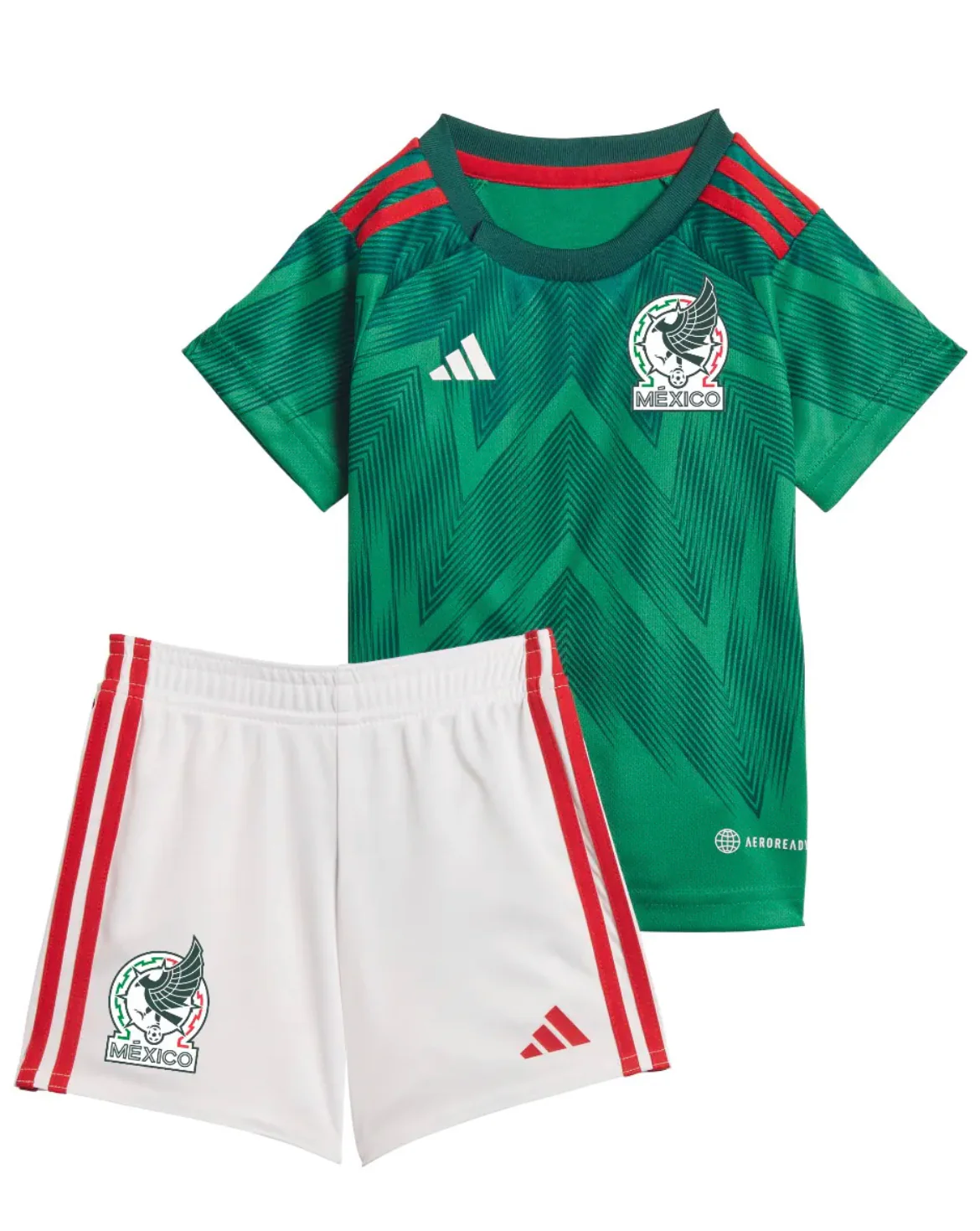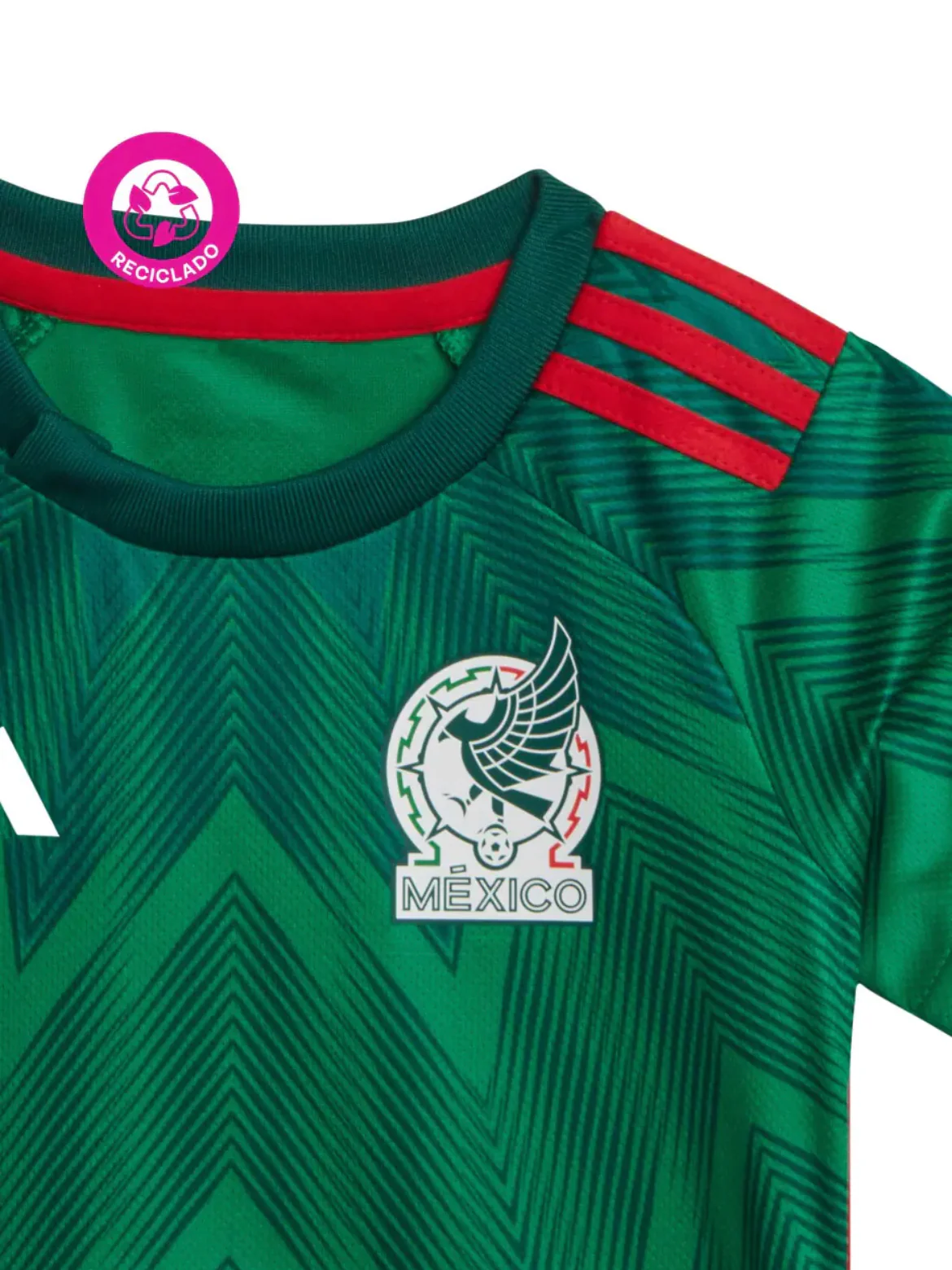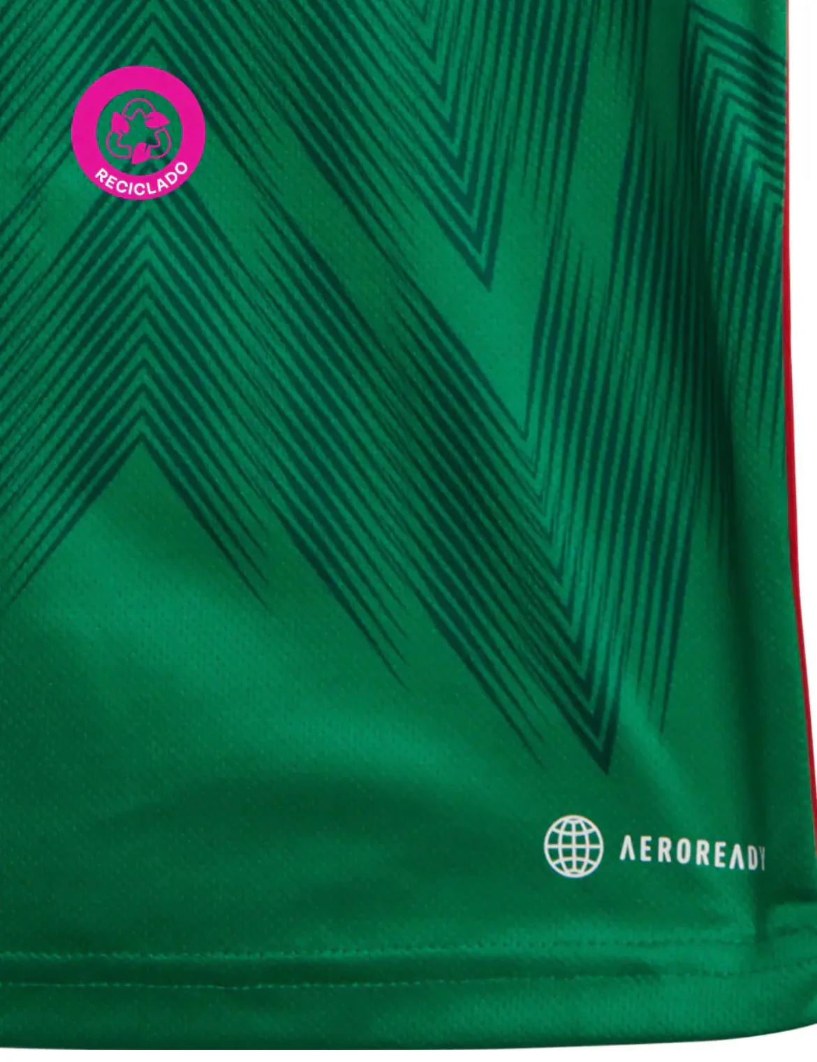 Un gráfico se adueña del pecho y parte media de la playera que está inspirado en el plumaje de Quetzalcóatl. El nuevo escudo de la Selección Nacional de México aparece en sus colores originales, mientras que el logotipo adidas aparece de manera minimalista; las tres franjas clásicas descansan sobre los hombros en rojo. En la nuca aparece la Serpiente Emplumada como jock tag. El short blanco con el escudo y logotipo adidas dándole un toque muy especial, lucirá como todo un profesional.