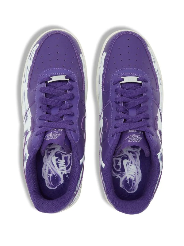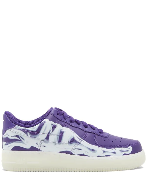 Tenis Air Force 1 ’07 Skeleton QS en cuero de color morado de Nike con puntera redonda, cierre con cordones en la parte delantera, parche del logo en la lengüeta, plantilla con logo, acolchado en los tobillos, logo Nike, logo en el contrafuerte y suela de goma.