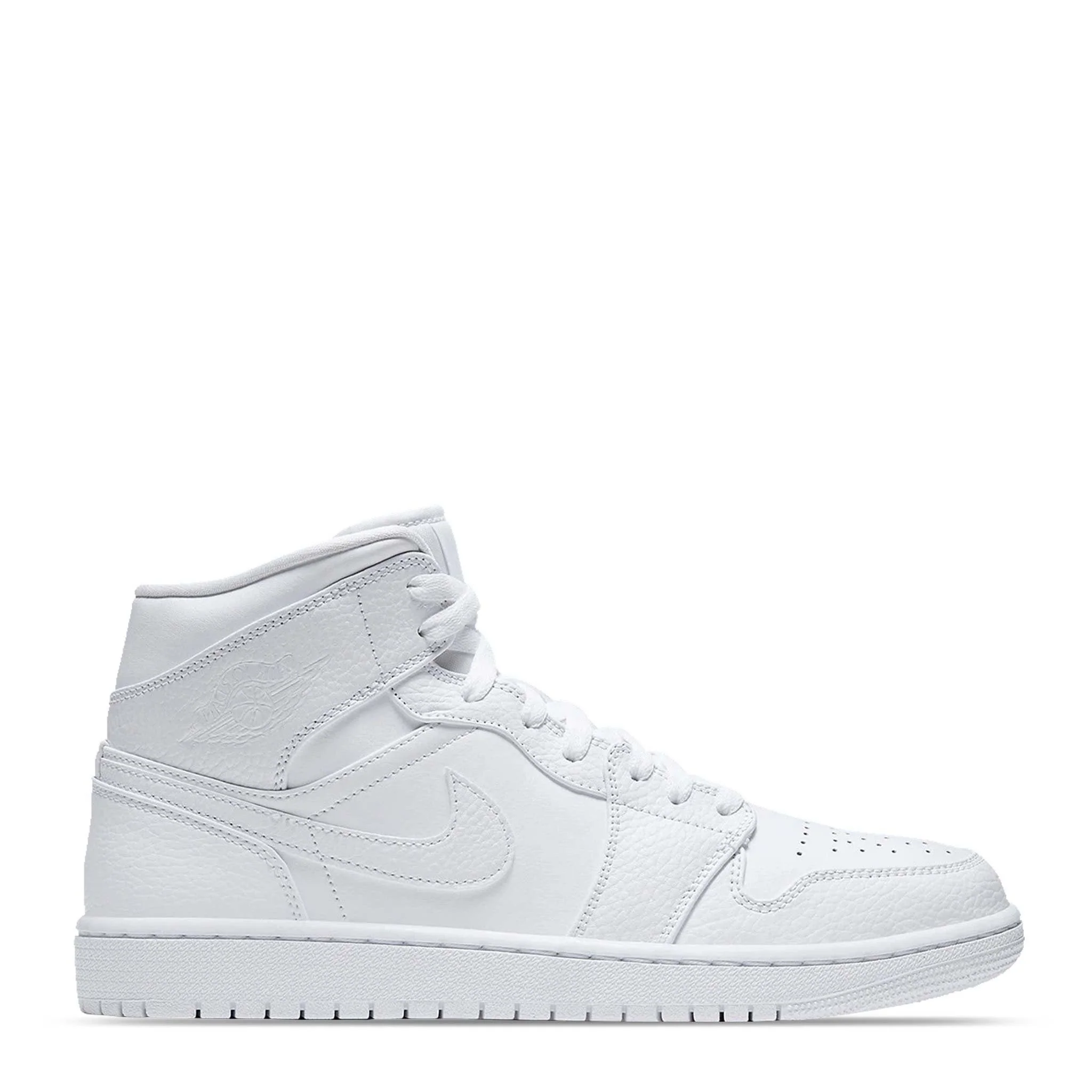 Blanco, piel de becerro, detalle del logo Swoosh característico, logo Air Jordan Wings característico, puntera redonda, cierre con agujetas en la parte delantera, parche del logo en la lengüeta, plantilla con logo y suela de goma.