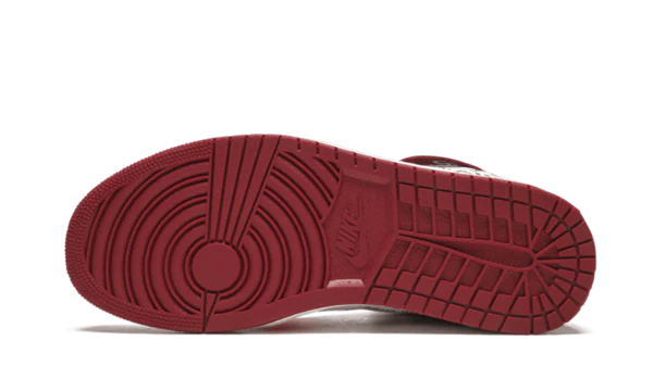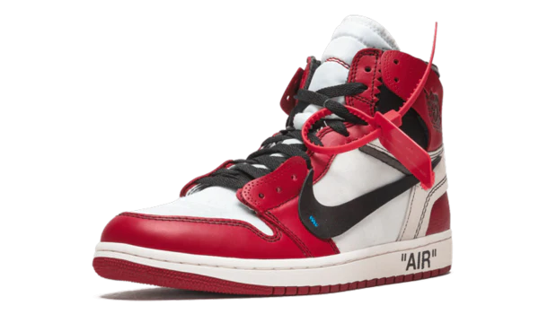 Tenis The 10: Air Jordan 1 de Nike x Off-White en cuero de color blanco, negro y rojo de Jordan con agujetas en la parte delantera, suela de goma y etiqueta de seguridad roja.