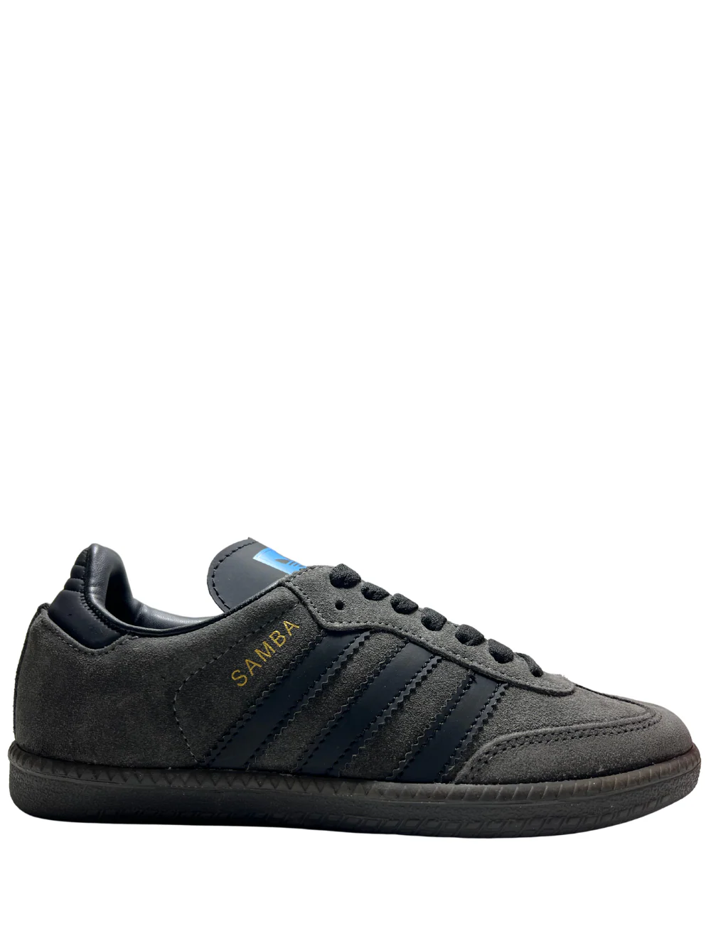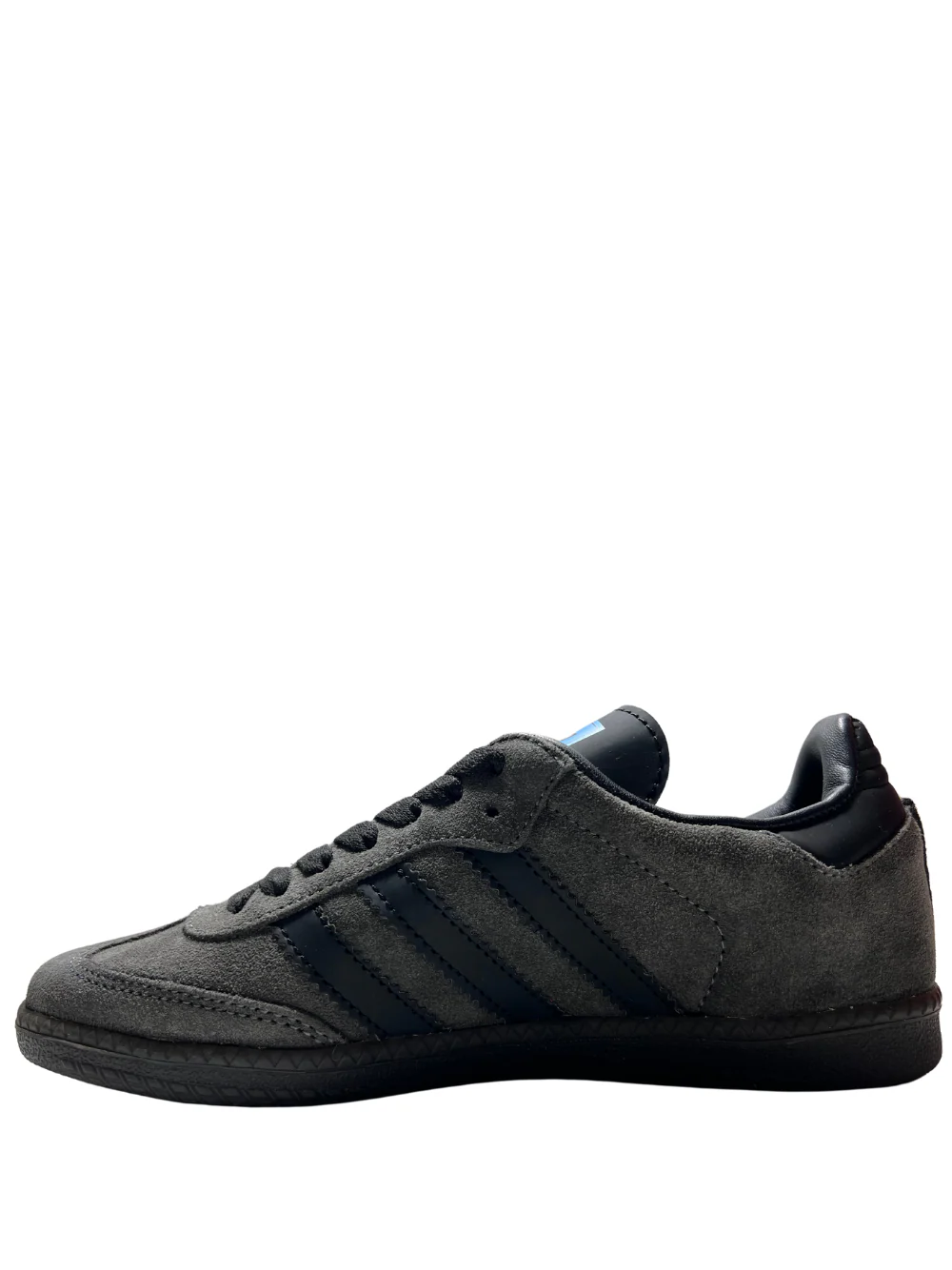 Negro, cuero, detalle característico de 3 franjas, logo en relieve en la lengüeta, puntera redonda, cierre con agujetas en la parte delantera, plantilla con logo y suela de goma.
