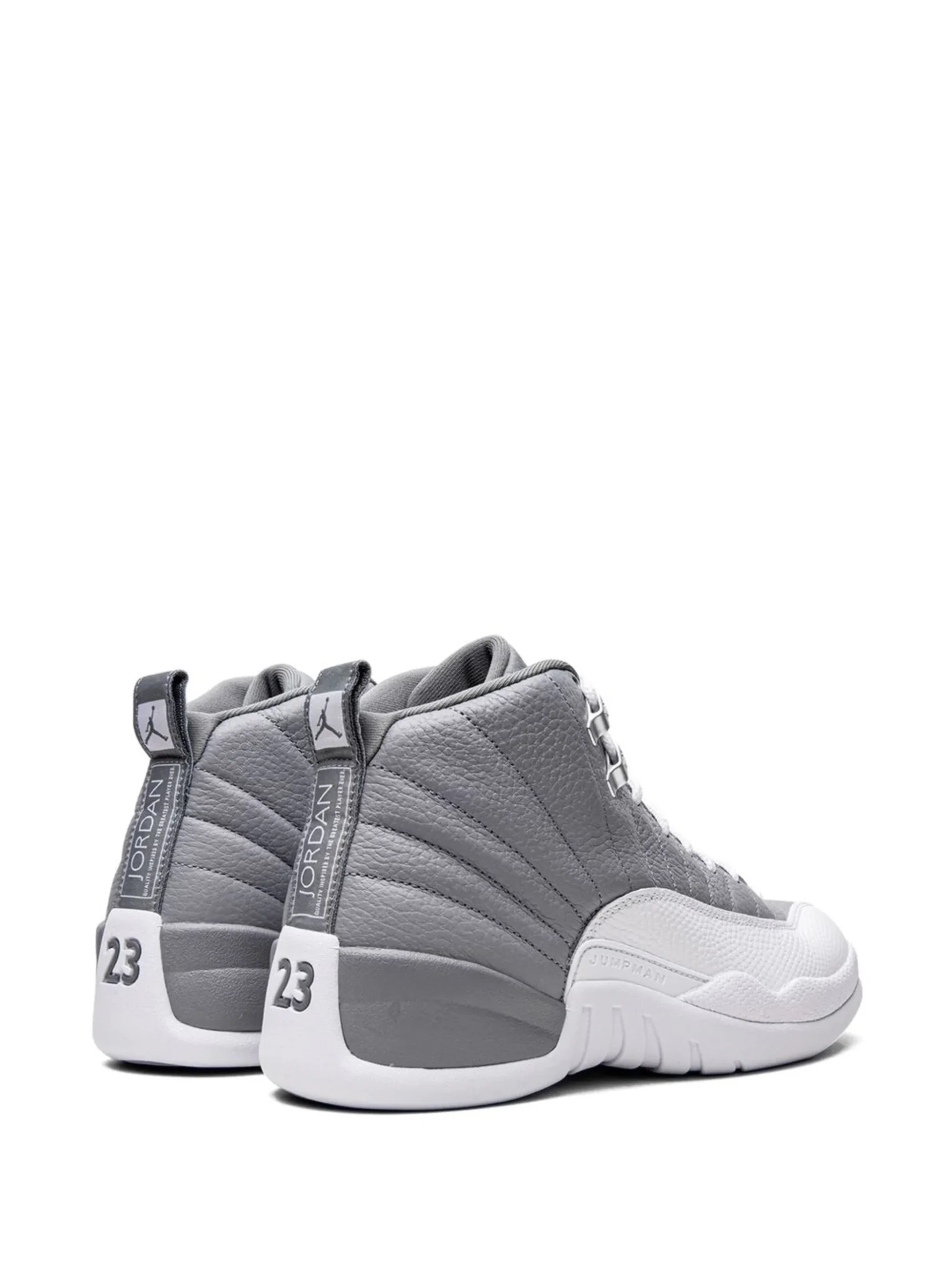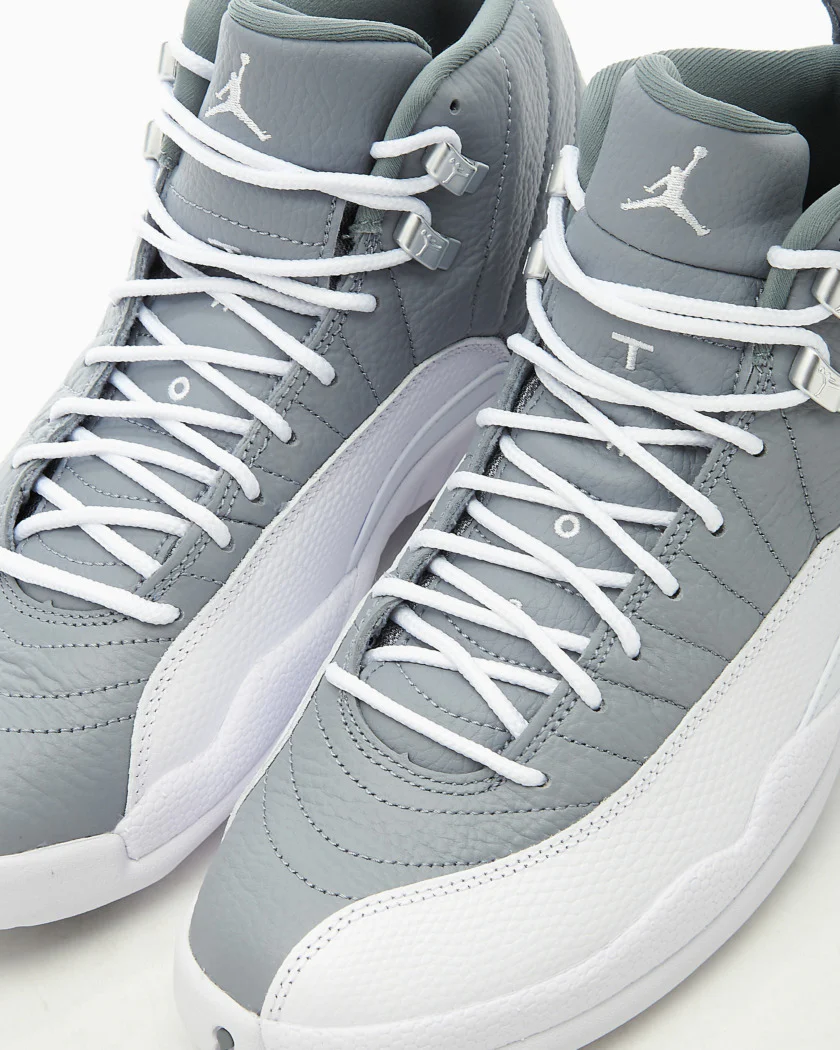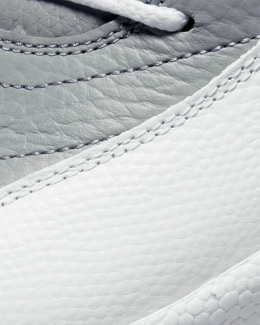 Gris claro, blanco, piel de becerro, puntera redonda, cierre con agujetas en la parte delantera, logo bordado en la lengüeta, diseño por el tobillo, plantilla con logo y suela de goma.