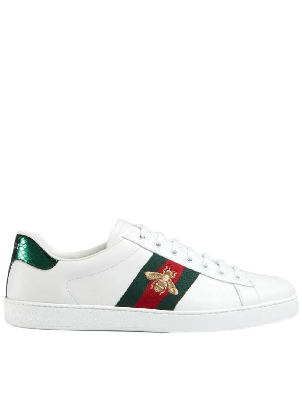 Los tenis Ace de Gucci se destacan gracias a los detalles en contraste en la parte posterior, mientras que el icónico detalle Web alude a la marca. El patrón vibrante propio del bordado Kingsnake se ha convertido en un símbolo clave de la casa italiana.