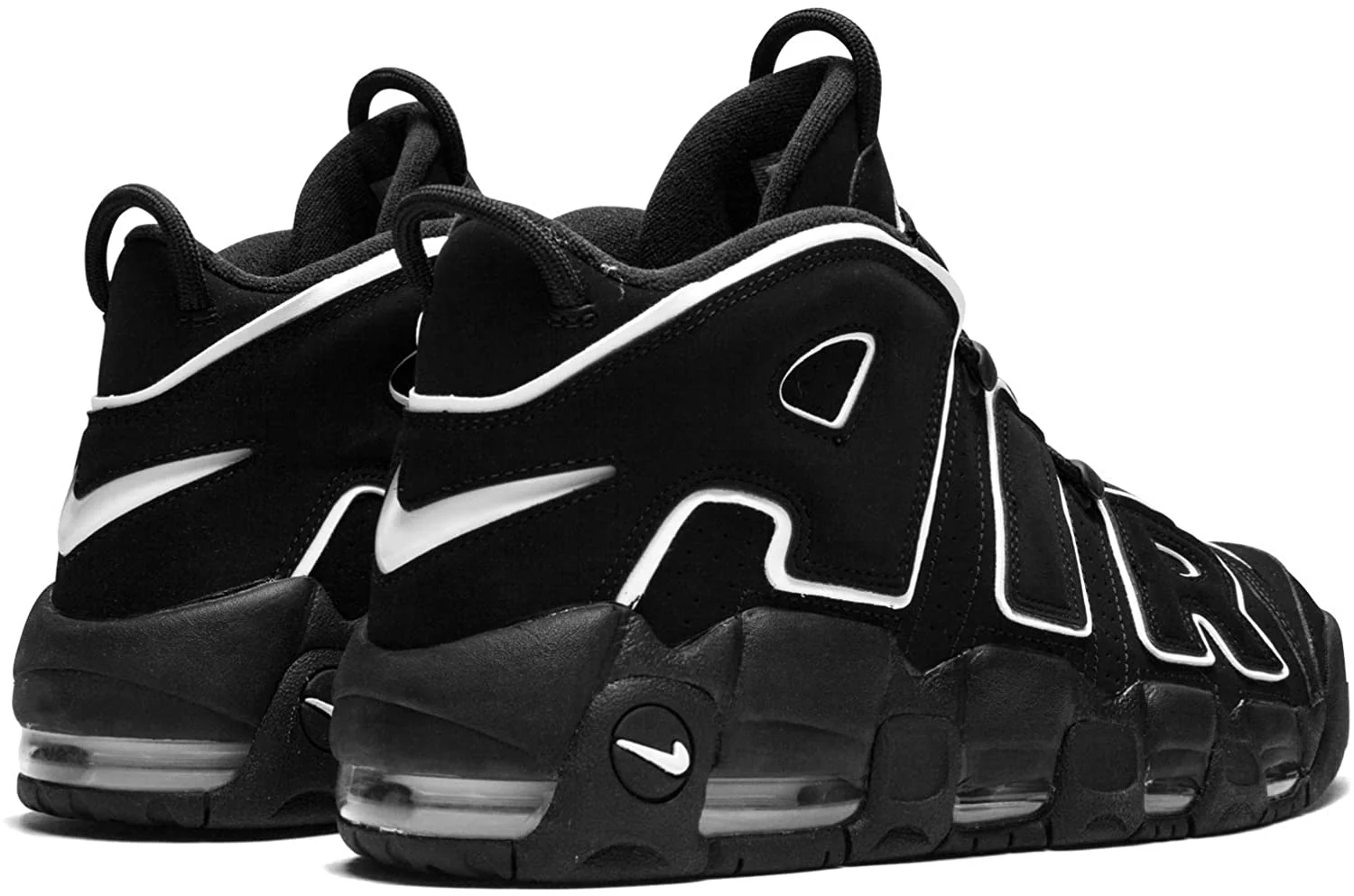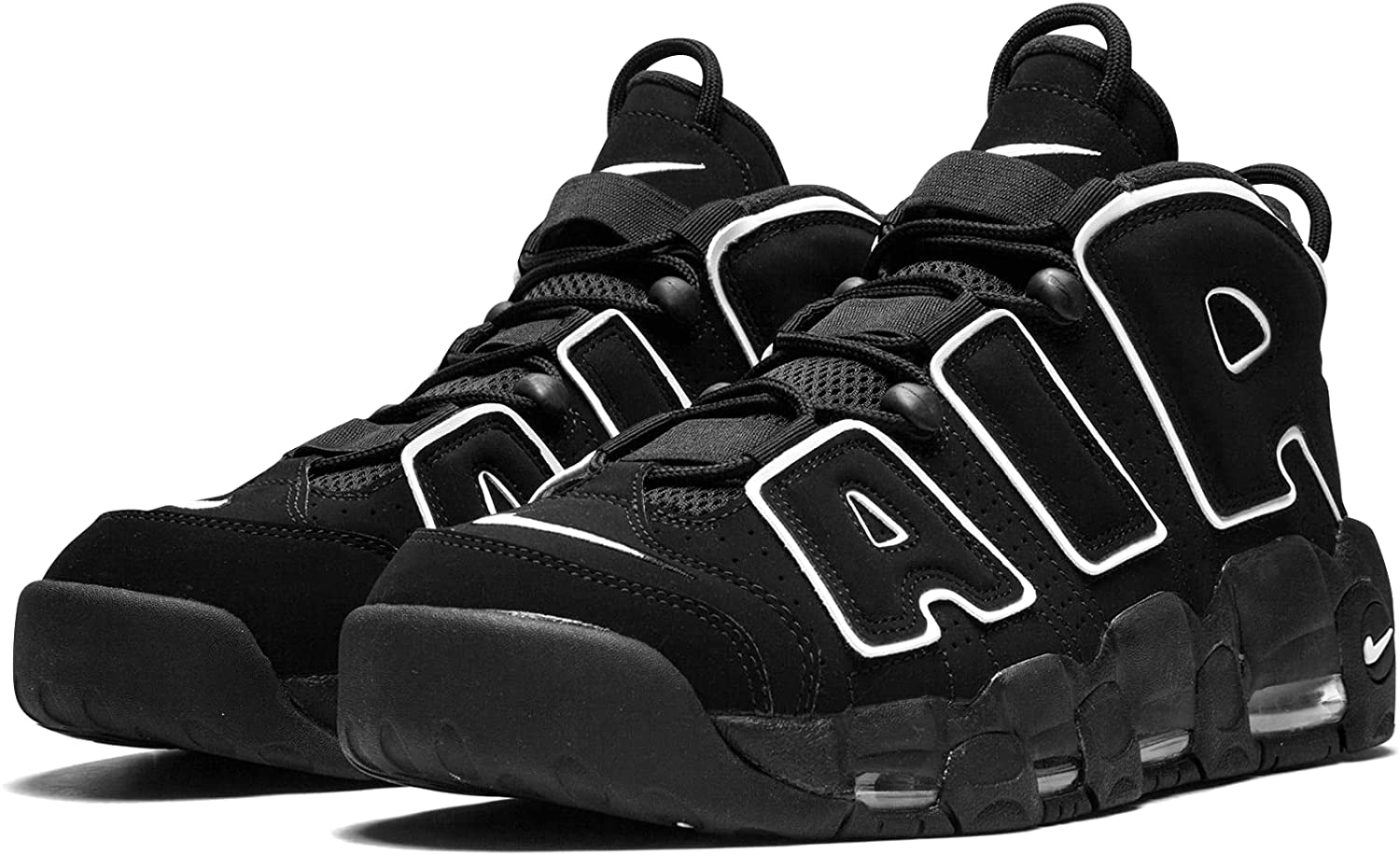 Tenis Air More Uptempo en piel de color negro y blanco de Nike con puntera de almendra, logo en relieve en la lengüeta, plantilla con logo, acolchado en los tobillos, suela Nike Air, suela de goma y cierre con agujetas en la parte delantera.