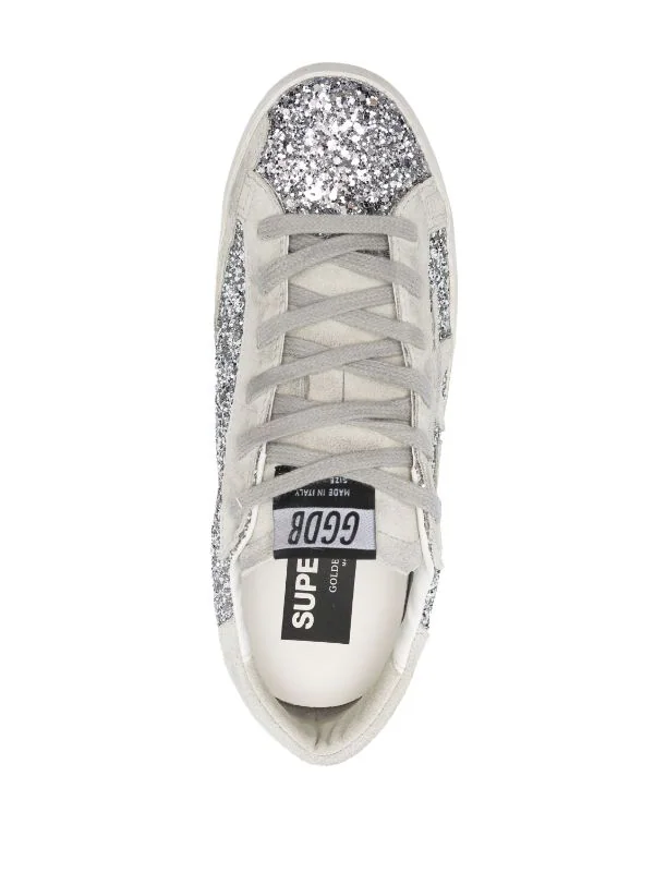 Deportivo Golden Goose en piel color glitter plata. Detalle con estrella en color glitter gris y talón en glitter gris . Cierre con cordón.