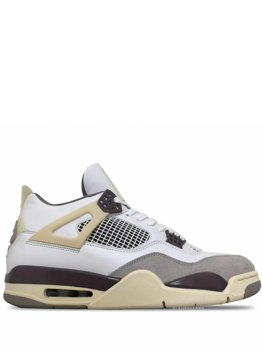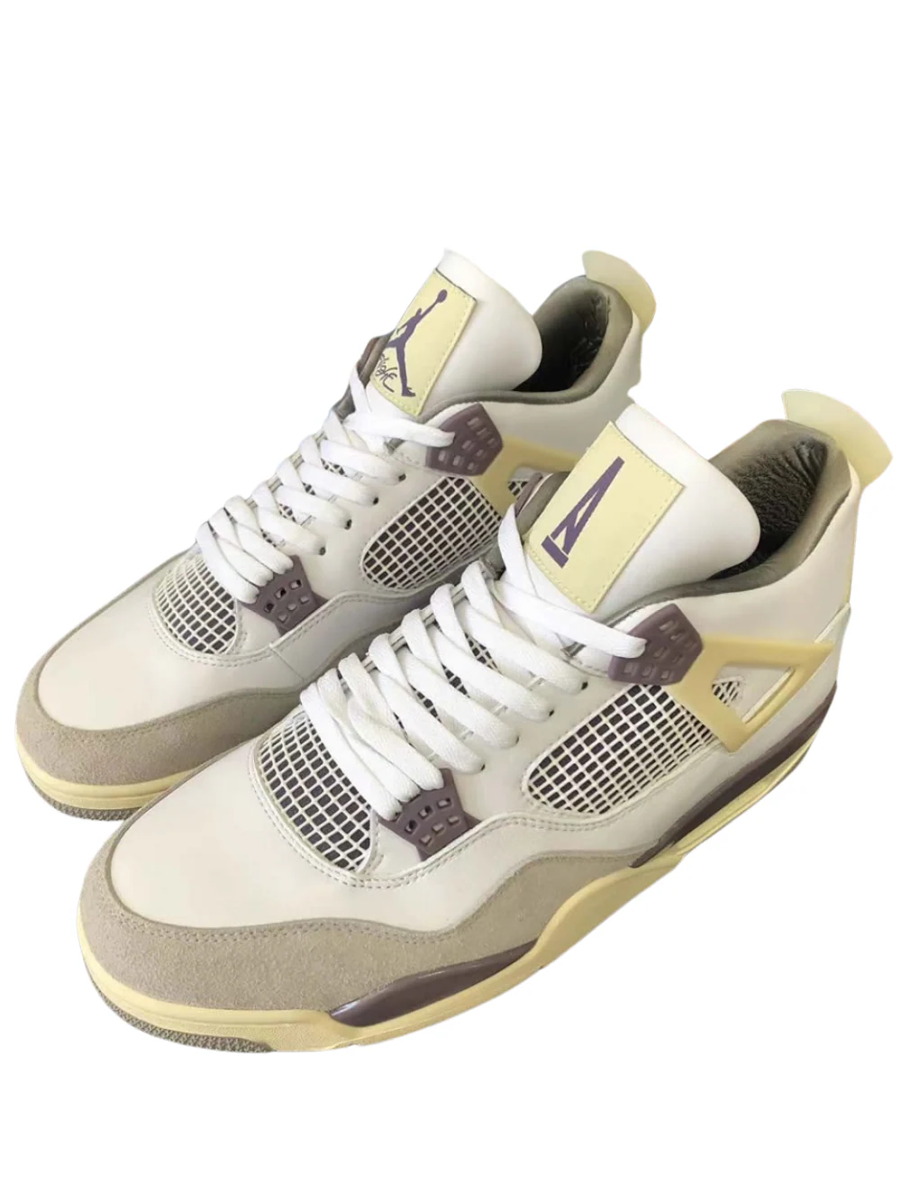 Jordan 4 A Ma Maniére x Air Jordan 4 colaborativo cubierto con una base blanca y gris junto con detalles en violeta.