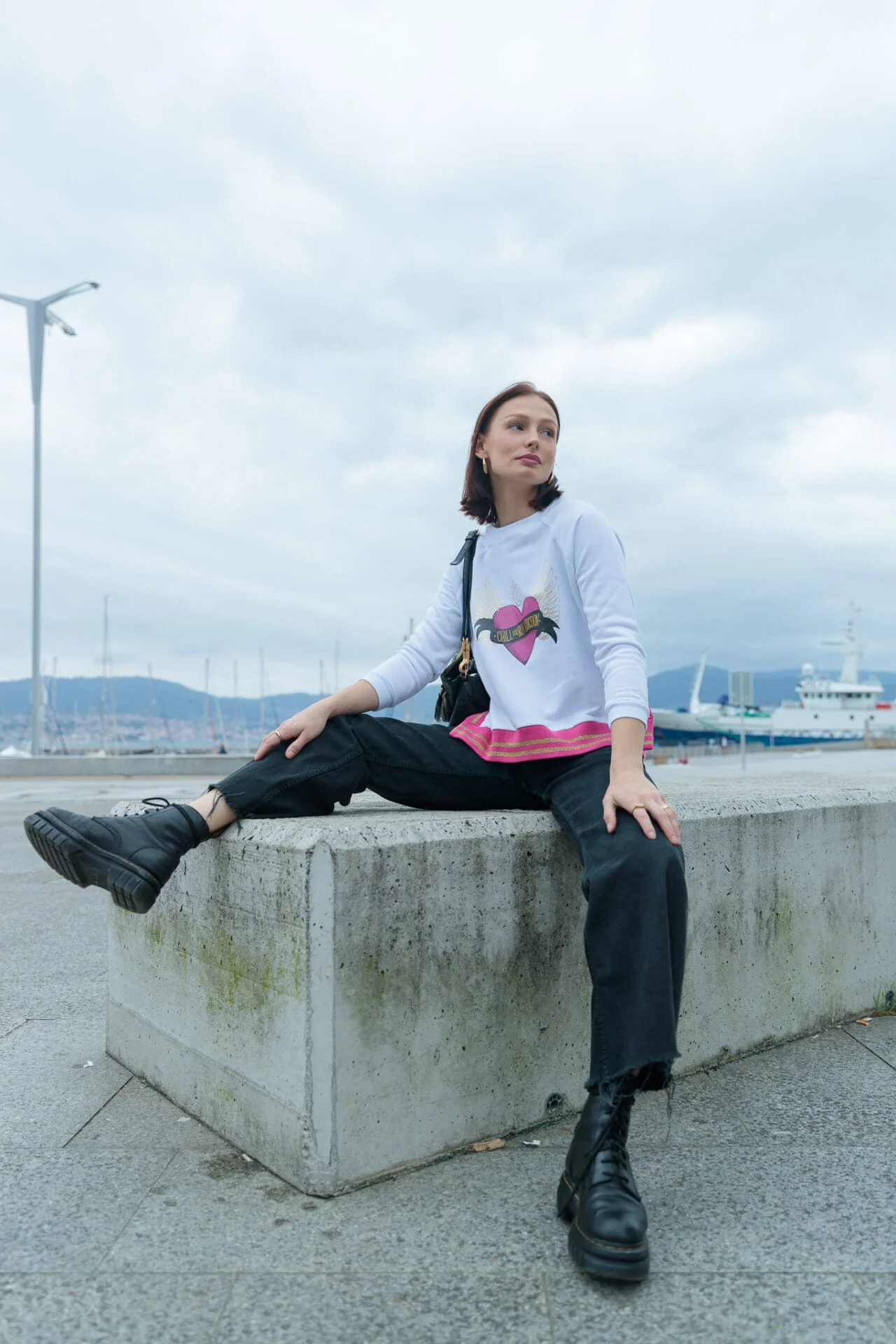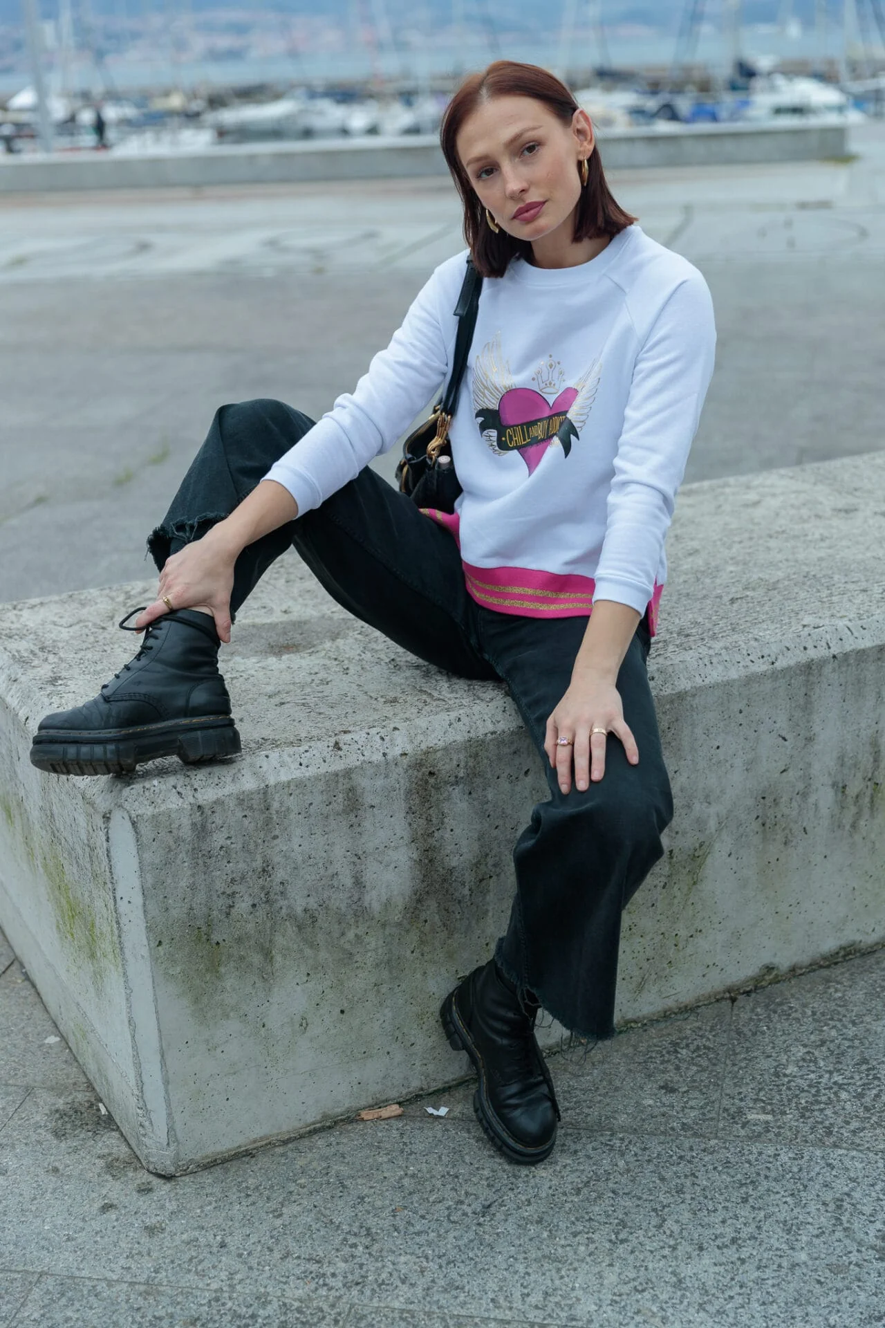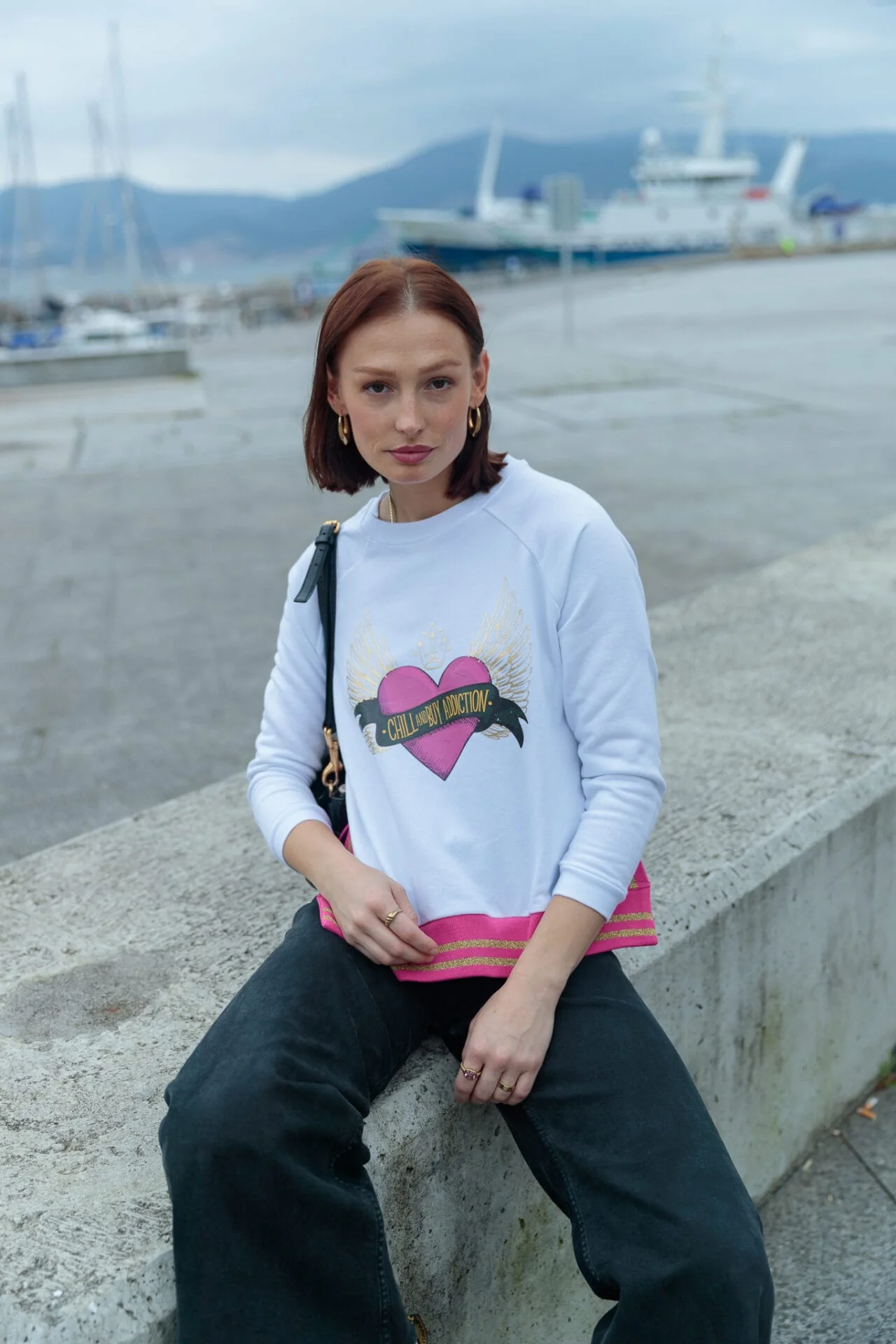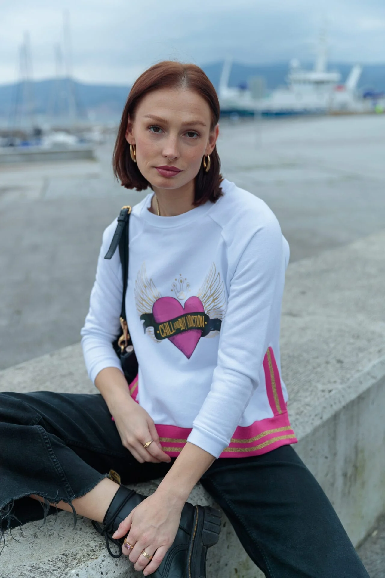 Sudadera de algod贸n en color blanco, con cuello redondo y manga ranglam. Detalle de rib con lurex en color fucsia en el bajo. Estampaci贸n frontal.