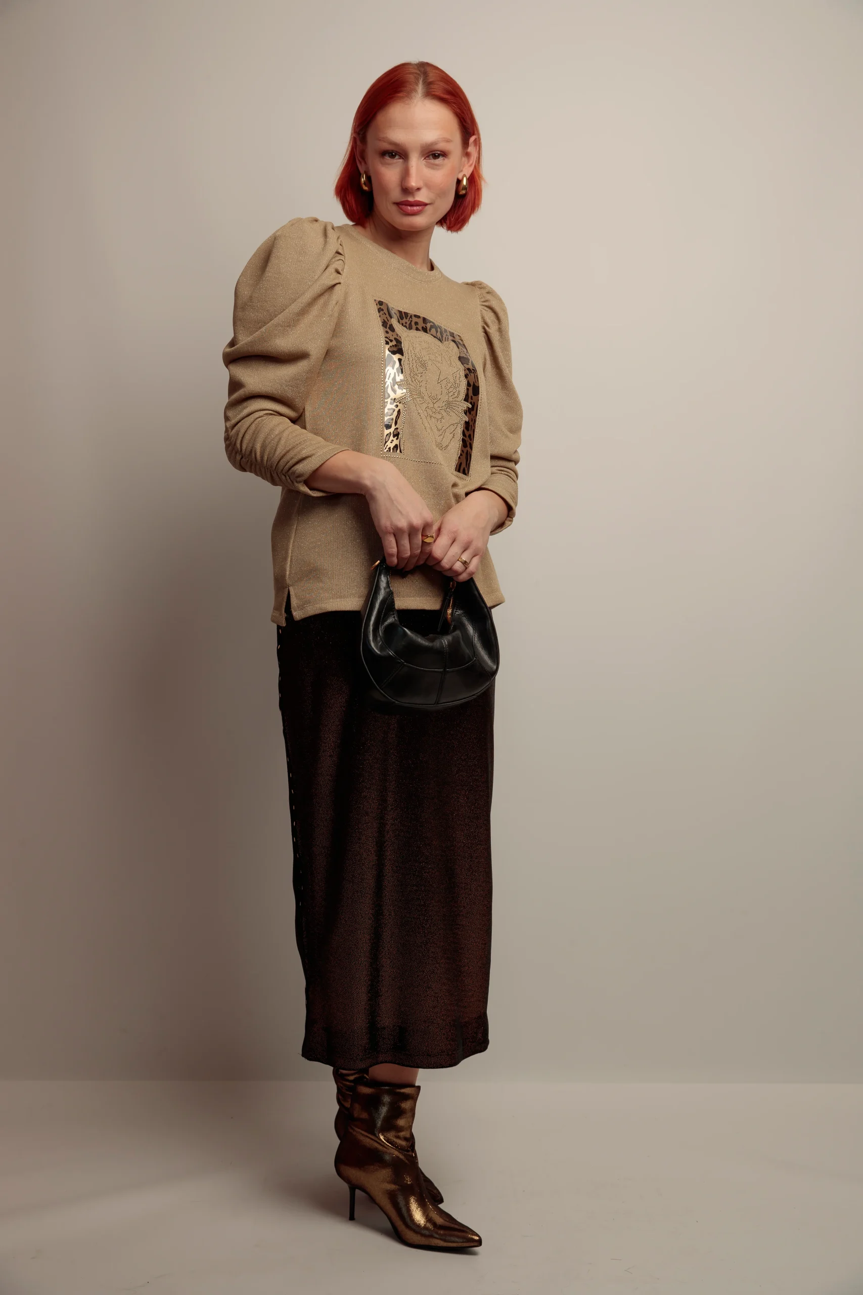 Sudadera top entallada, cuello redondo y manga larga abullonada. Confeccionada en tejido de algodón en color dorado con lurex. Estampación frontal de strass.