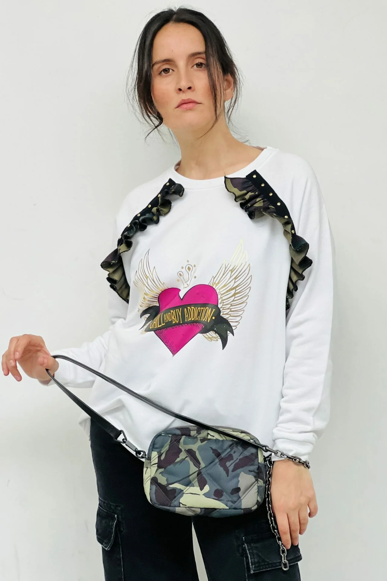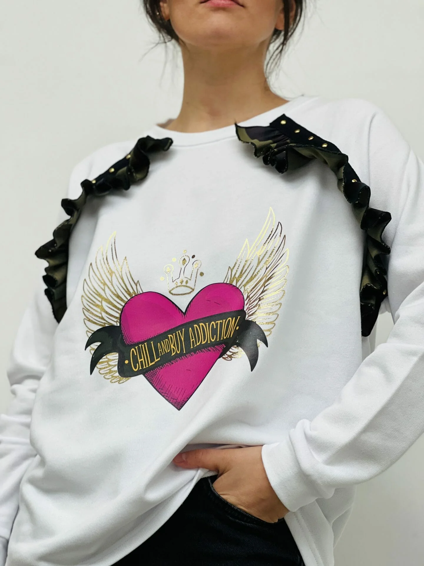 Sudadera con cuello redondo y corte evas茅. Detalle delantero de volante con tachas . Estampaci贸n delantera.
