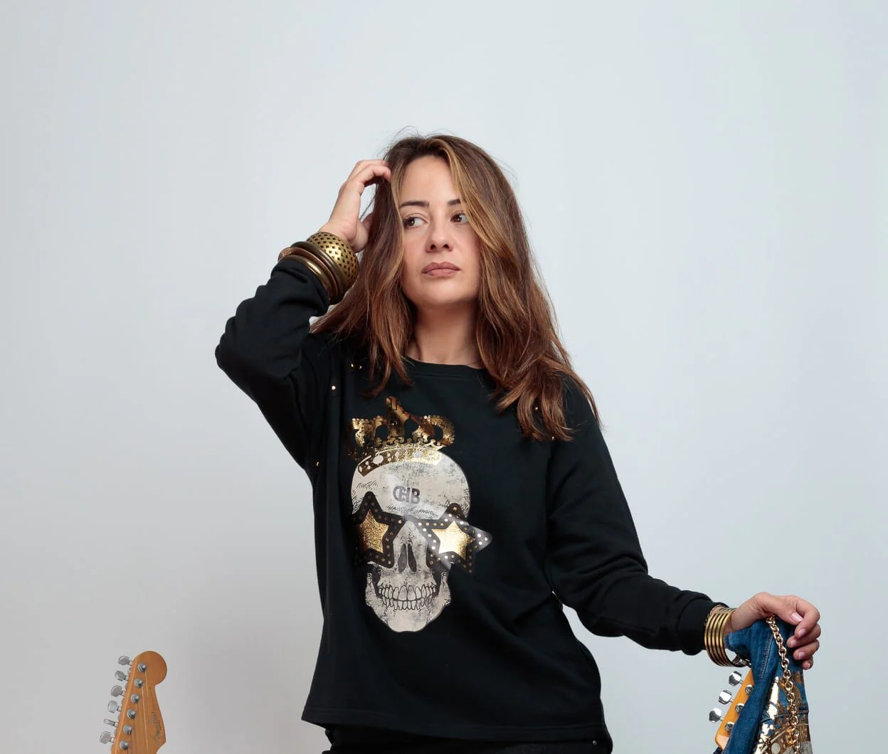 Sudadera manga ranglam, corte evasé y bajo asimétrico. Detalle de tachuelas metálicas doradas en la costura de la manga. Estampación frontal.