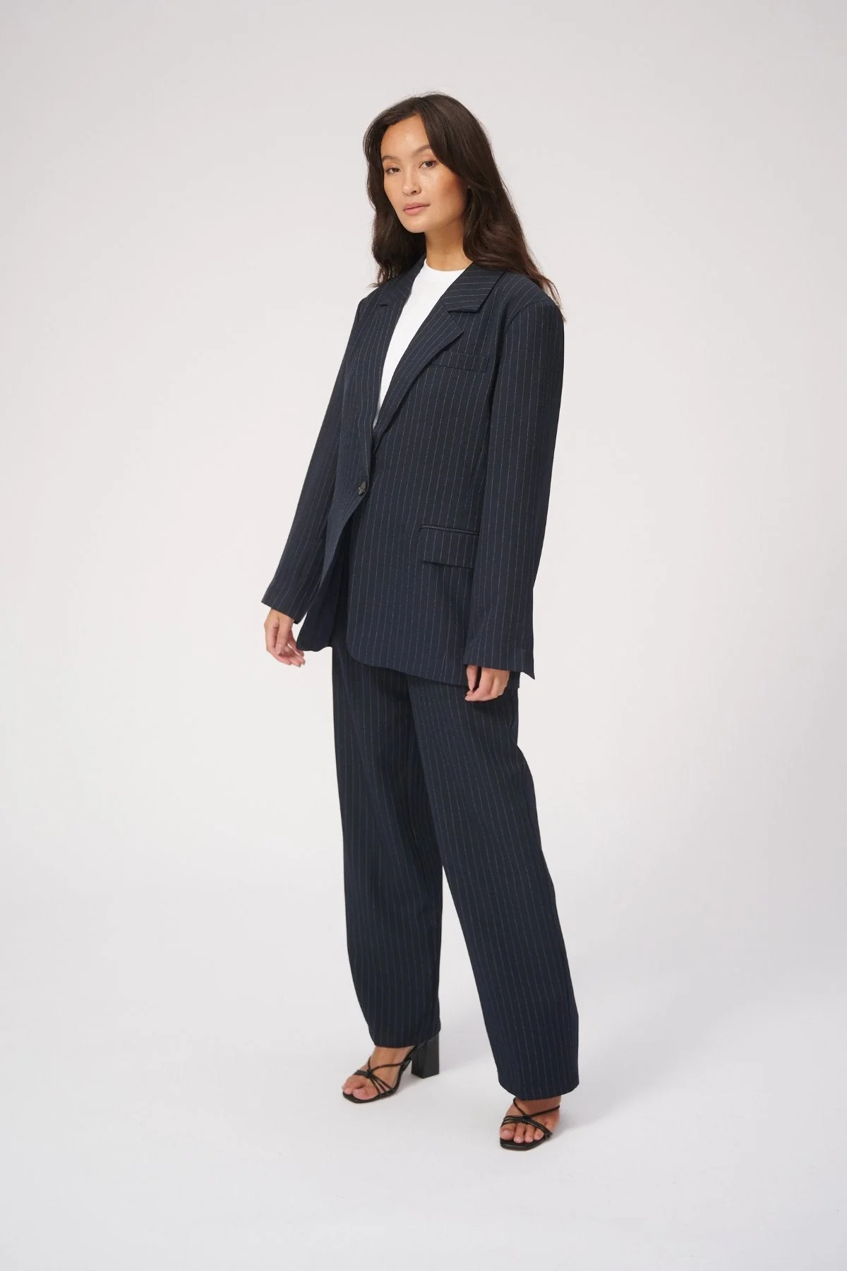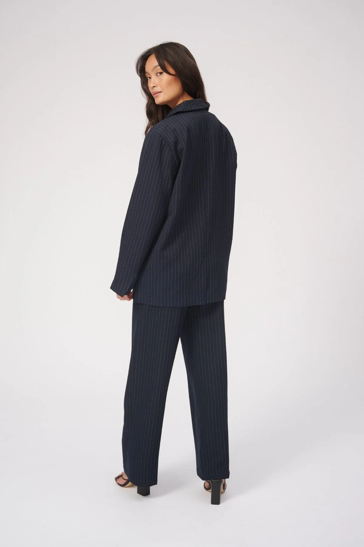 Este traje presenta un patrón tradicional de rayas azul marino, una opción atemporal que agrega profundidad e interés visual a su conjunto. El fondo azul marino intenso combinado con sutiles rayas realza el aspecto general, creando un traje refinado pero llamativo, perfecto tanto para entornos profesionales como sociales. El patrón de rayas es un guiño a la sastrería clásica, pero el oversized El ajuste lo mantiene fresco y a la moda.
