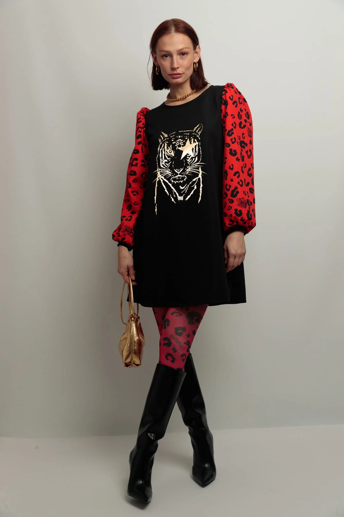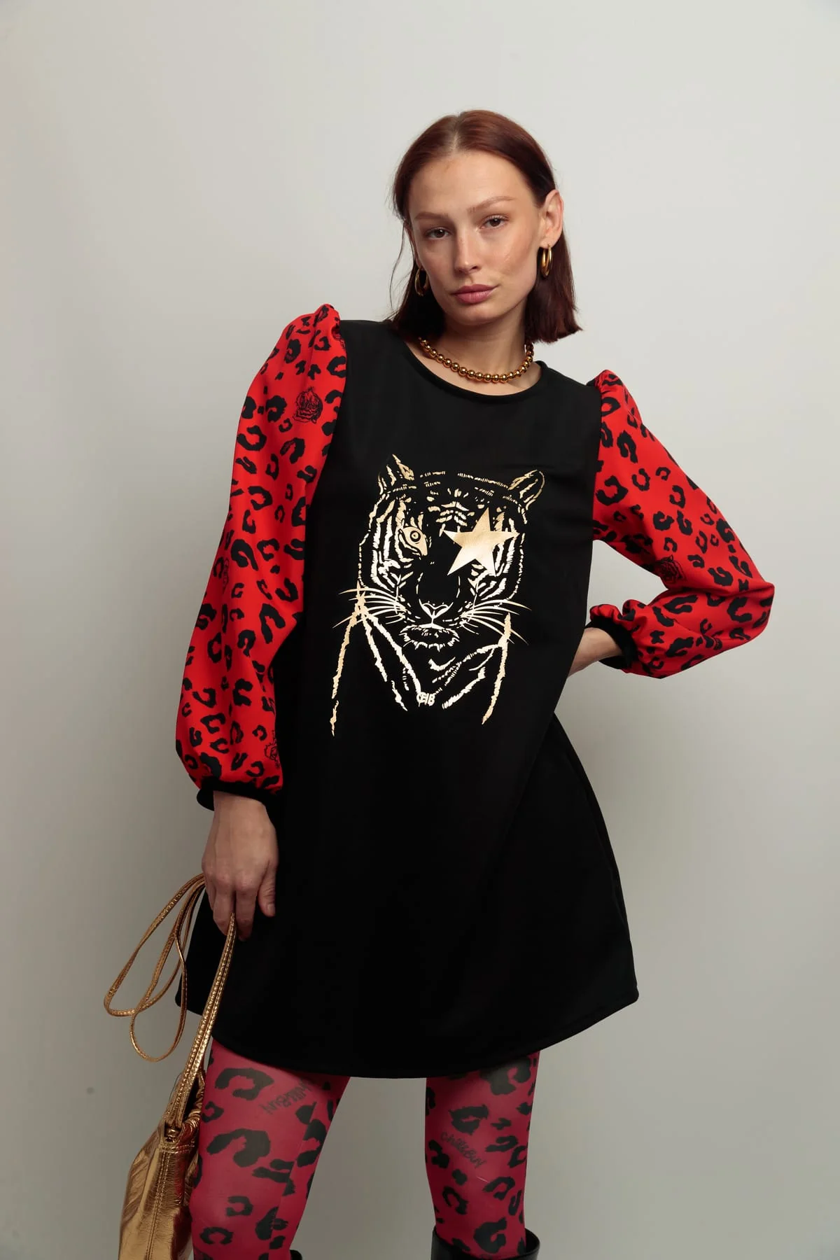 Vestido negro con cuello redondo, corte evase, y con bolsillos. Mangas abullonadas en estampado animal print color rojo. Estampación frontal dorada.