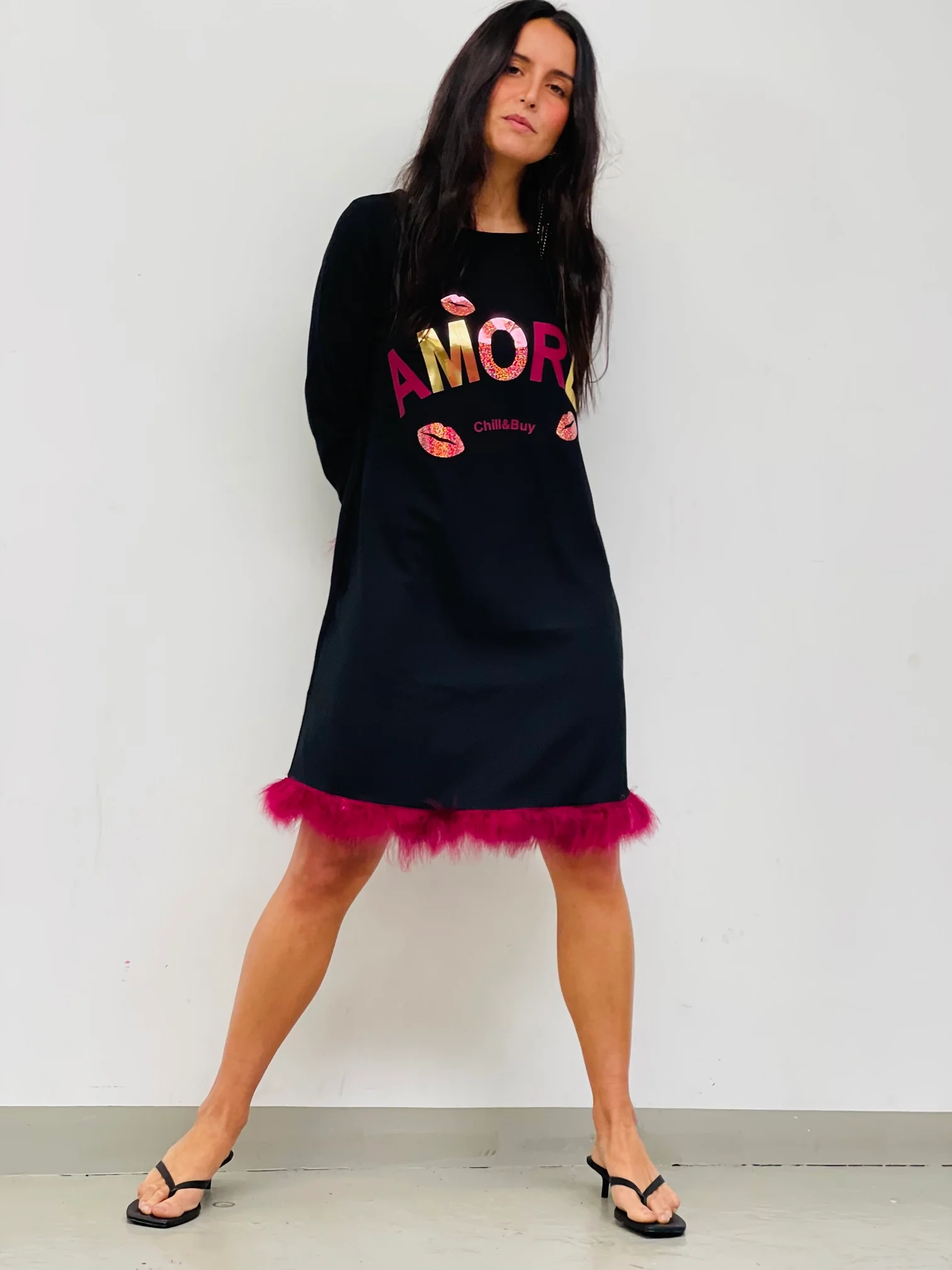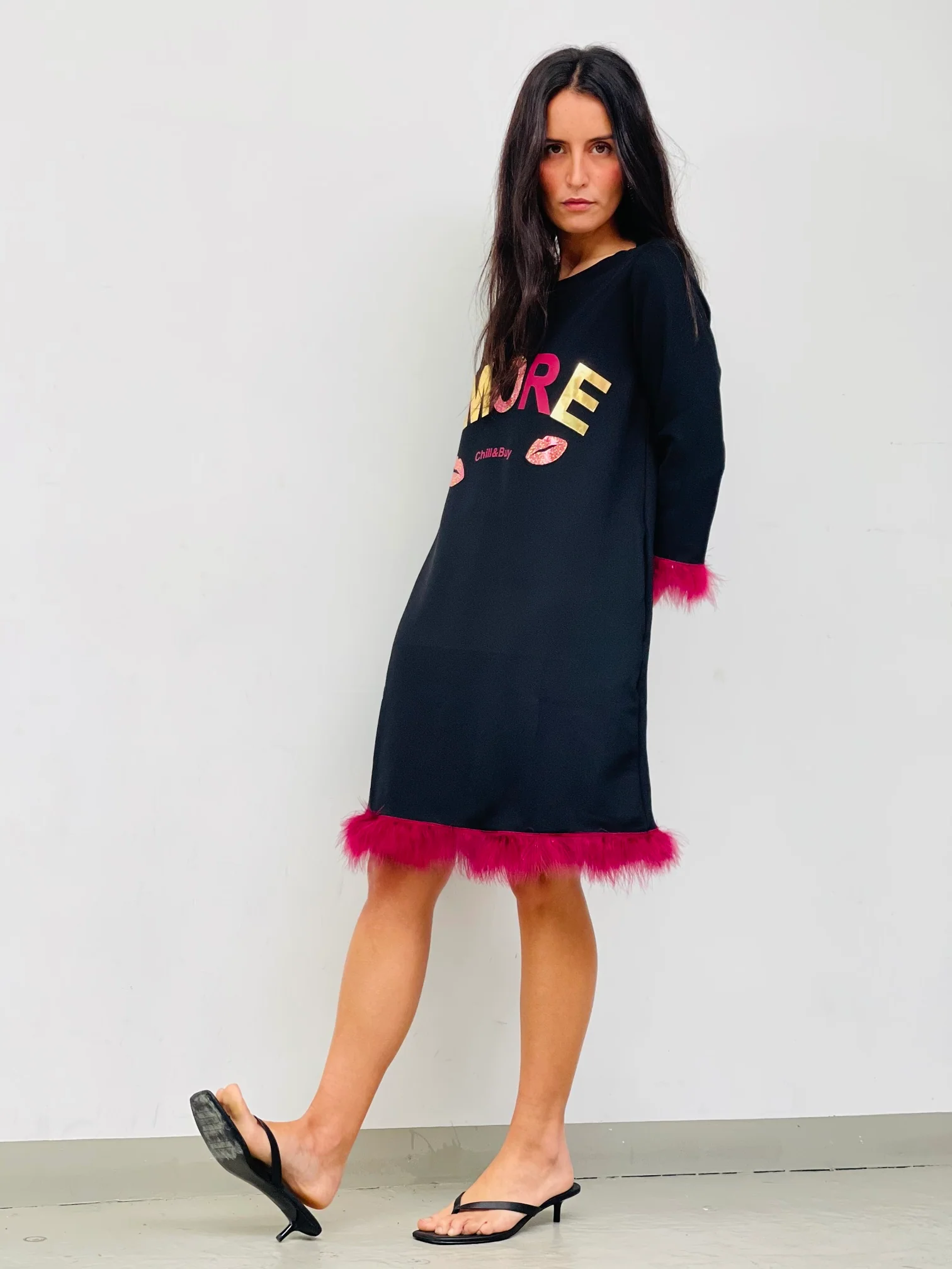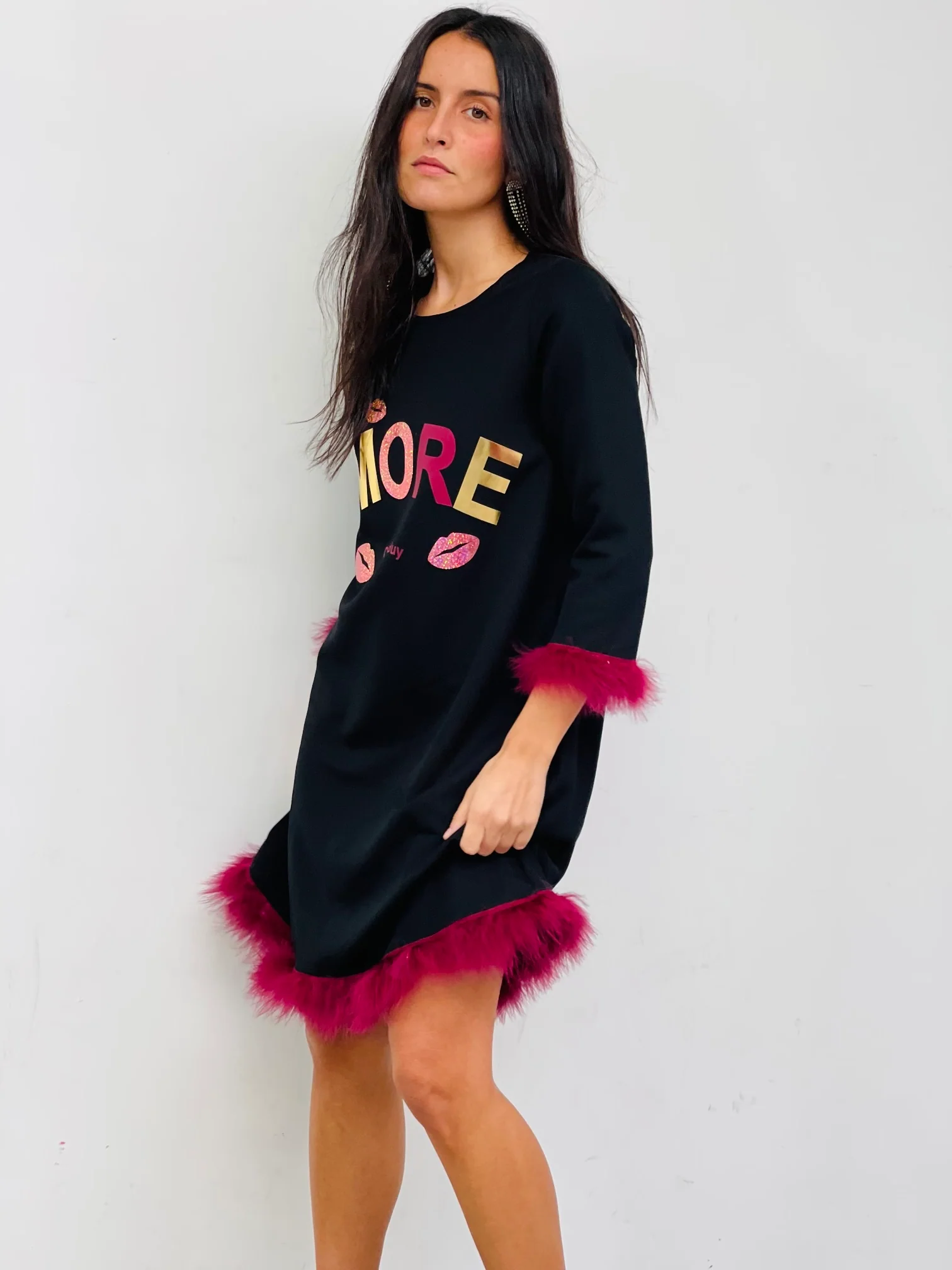 Vestido corto de mujer en color negro con cuello redondo, con bolsillos y manga larga. Cierre con cremallera oculta en la espalda. Detalle de marabú a contraste en puños y bajo. Confeccionado en tejido tipo crep con elastano. Made in Vigo.
