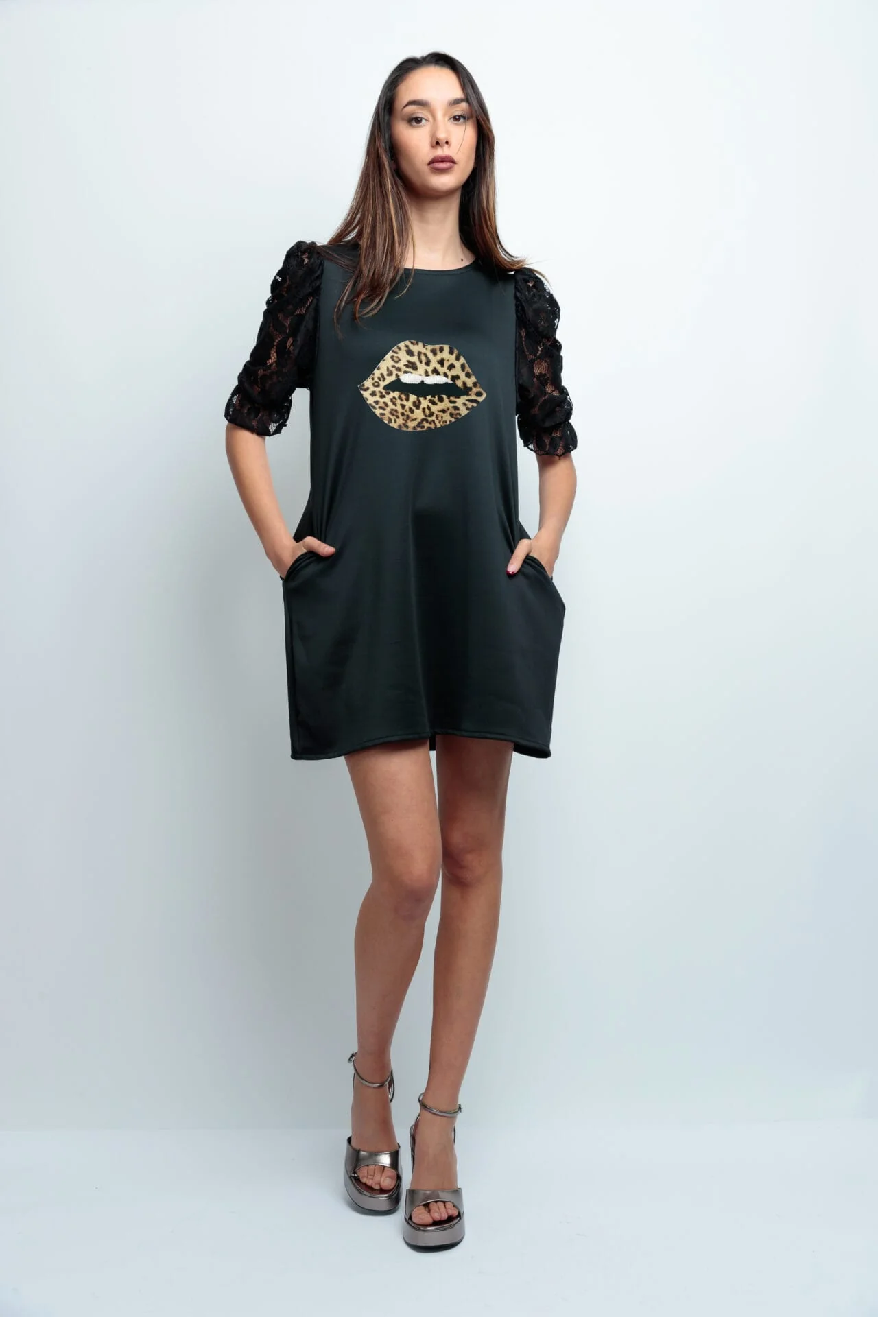 Vestido negro con encaje en las mangas y bolsillos interiores que posee en el medio de este una boca con estampado de leopardo.