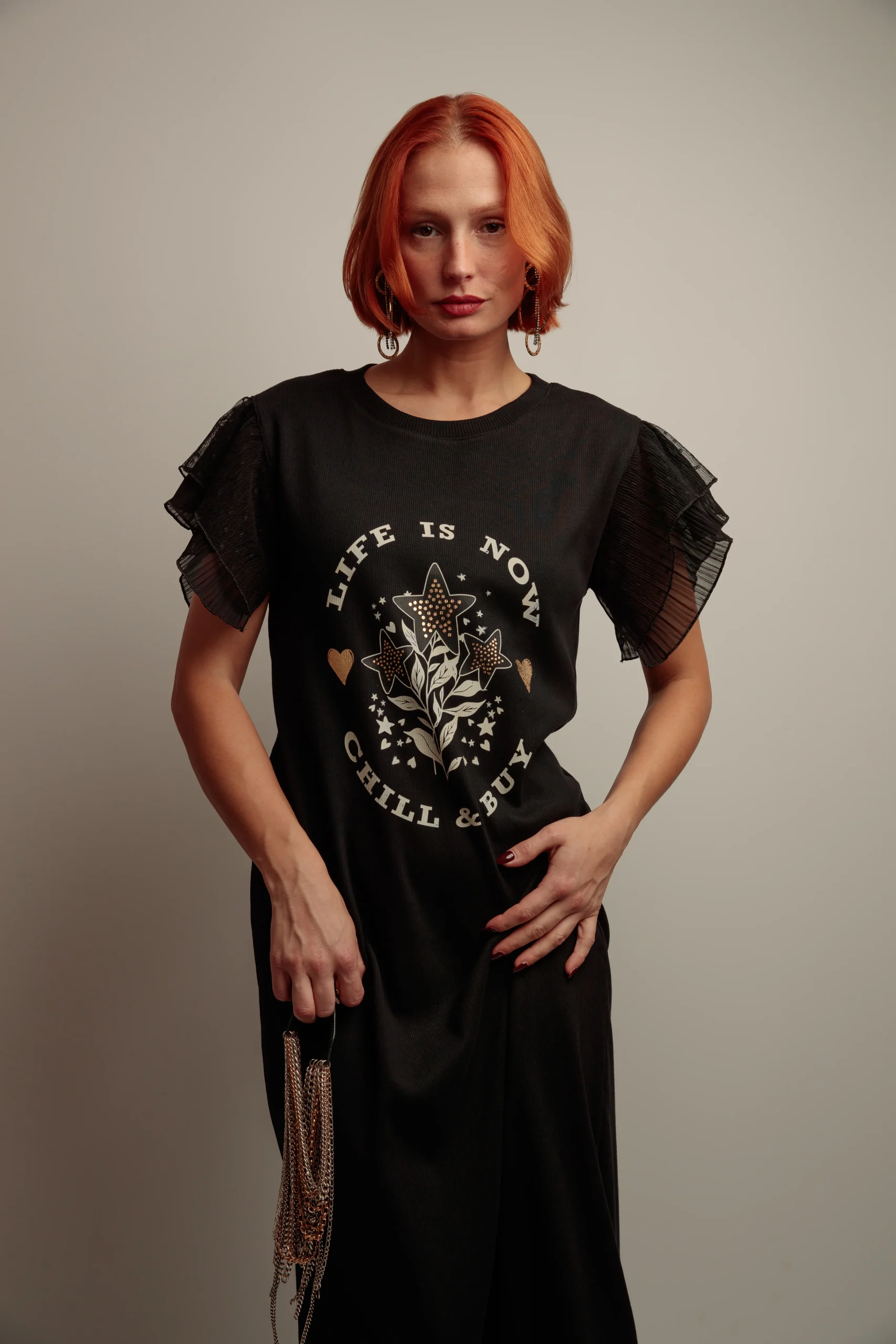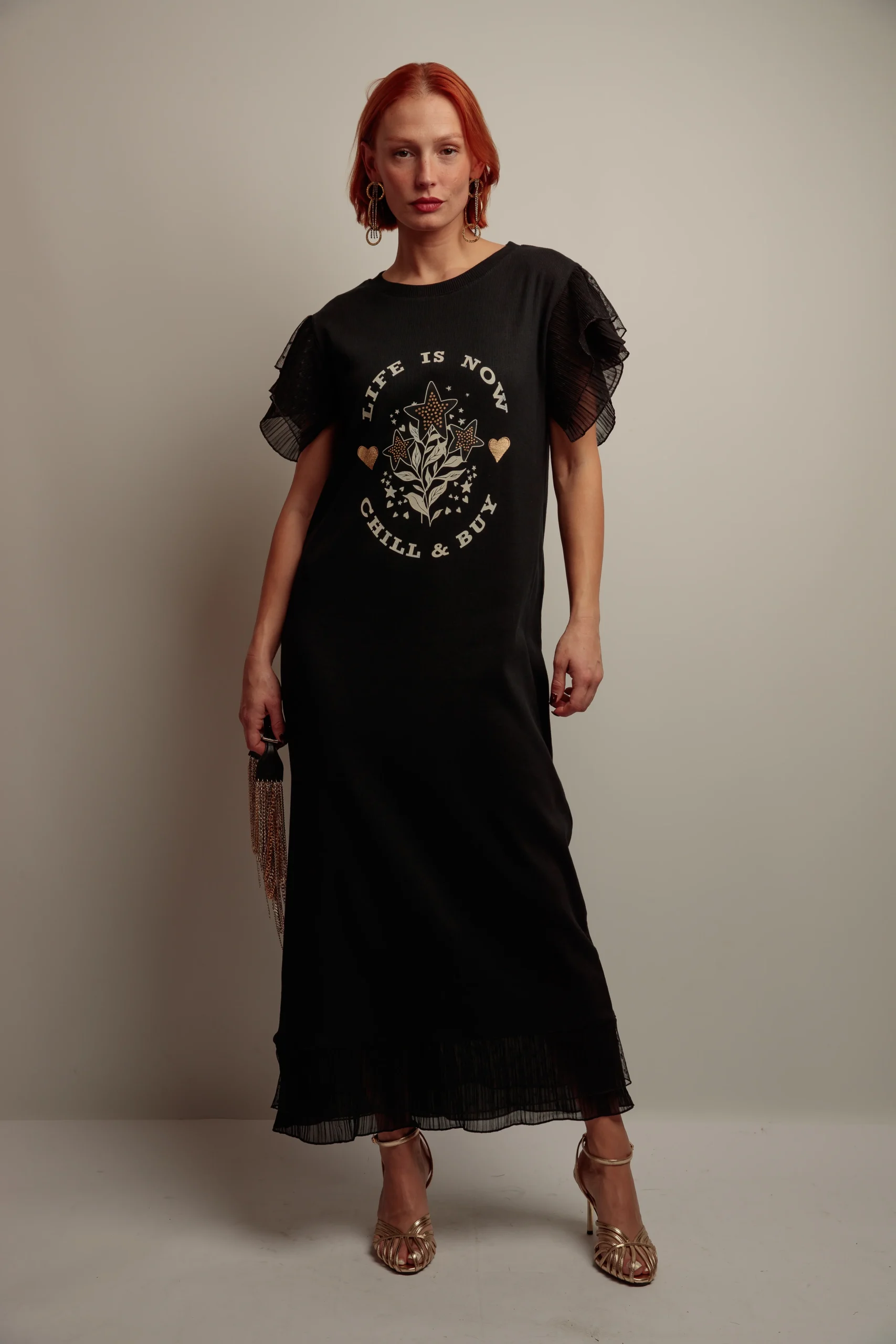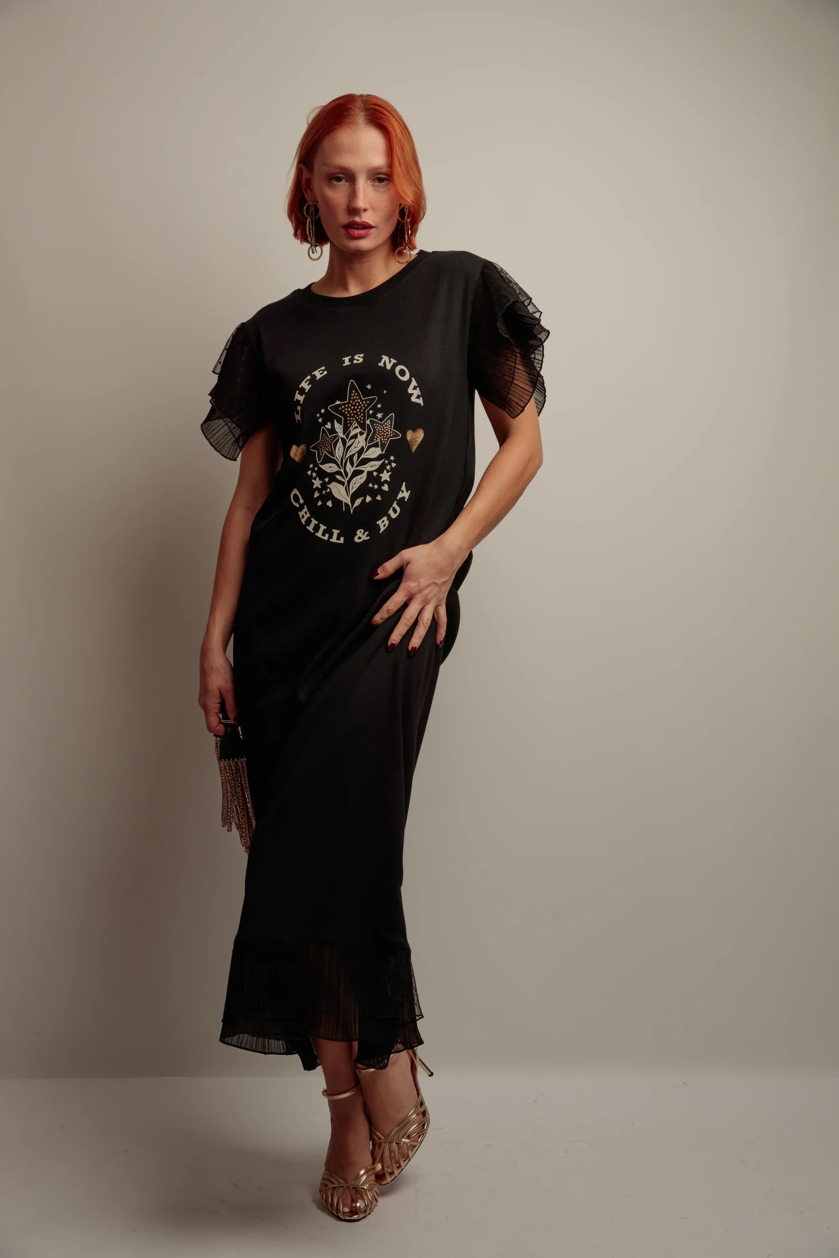 Vestido largo recto, con cuello redondo y abertura trasera. Confeccionado en tejido canalé en color negro. Detalle de volantes de tul doble en el hombro y en el bajo. Estampación frontal. Confeccionado en Vigo.