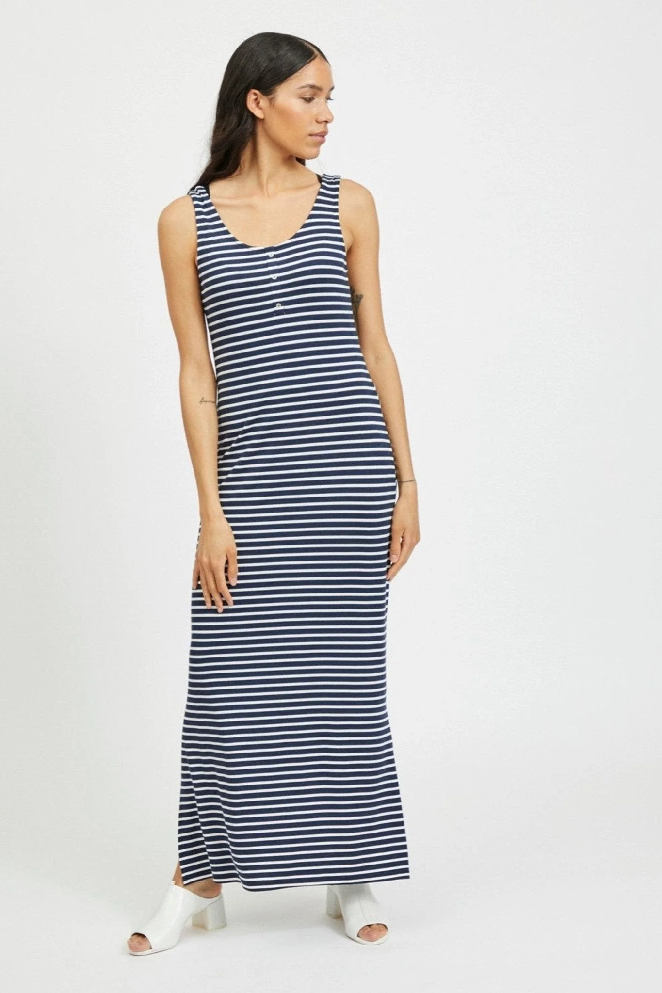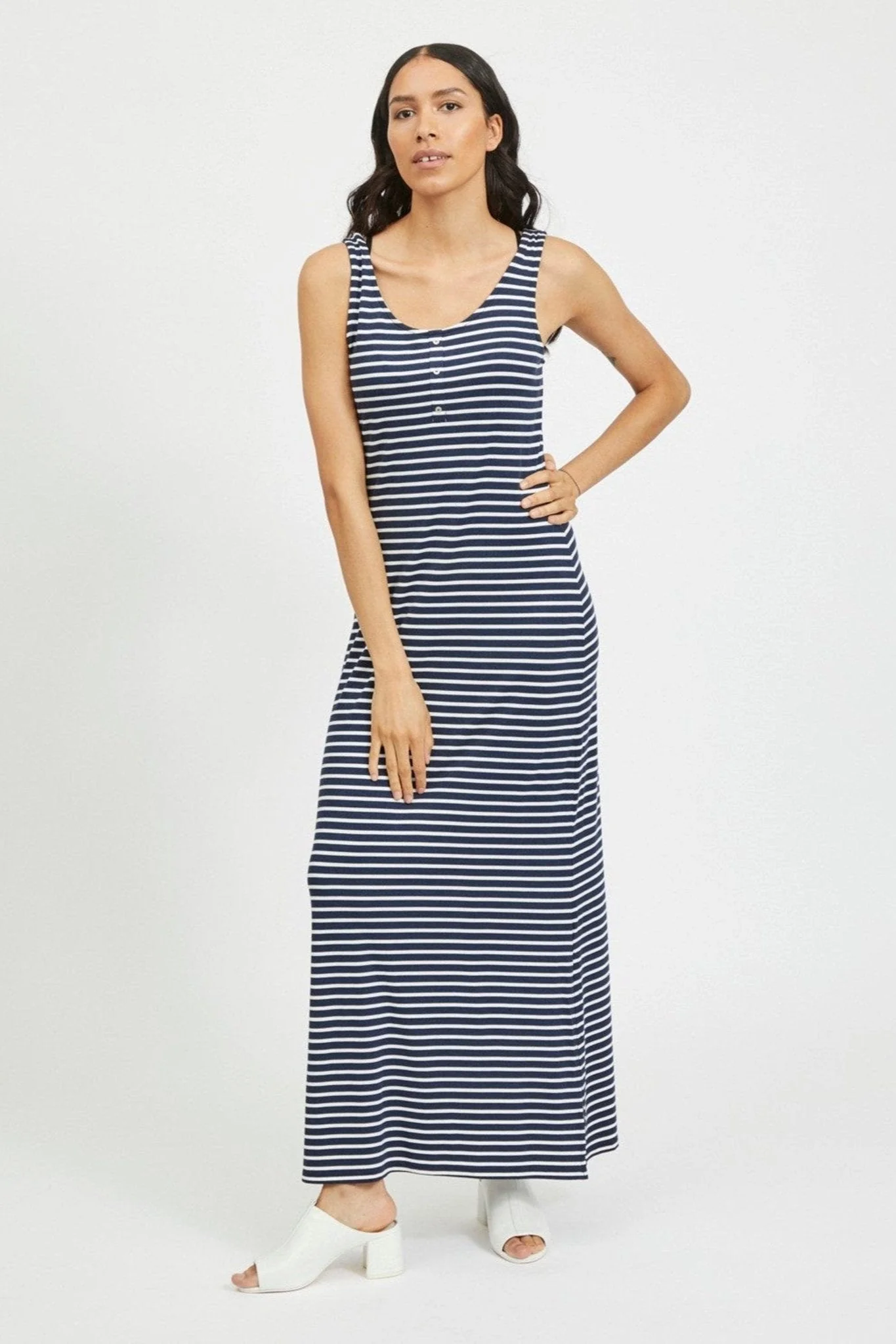 Haz una declaración con el Dell Maxi Vestido de Vila, con rayas marítimas clásicas en azul y blanco. Esta impresionante pieza está diseñada para mujeres que aprecian la elegancia atemporal y el estilo de verano sin esfuerzo.