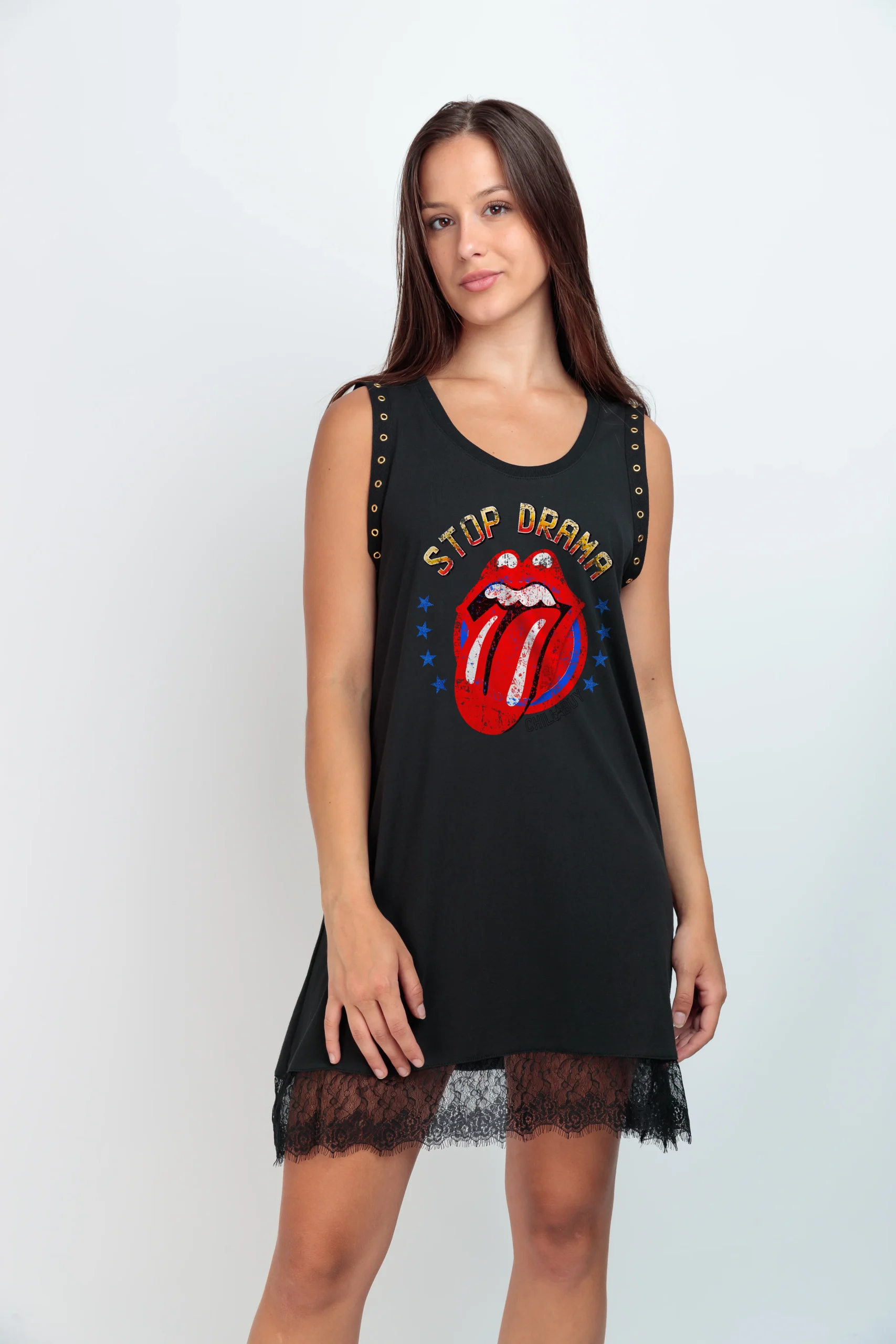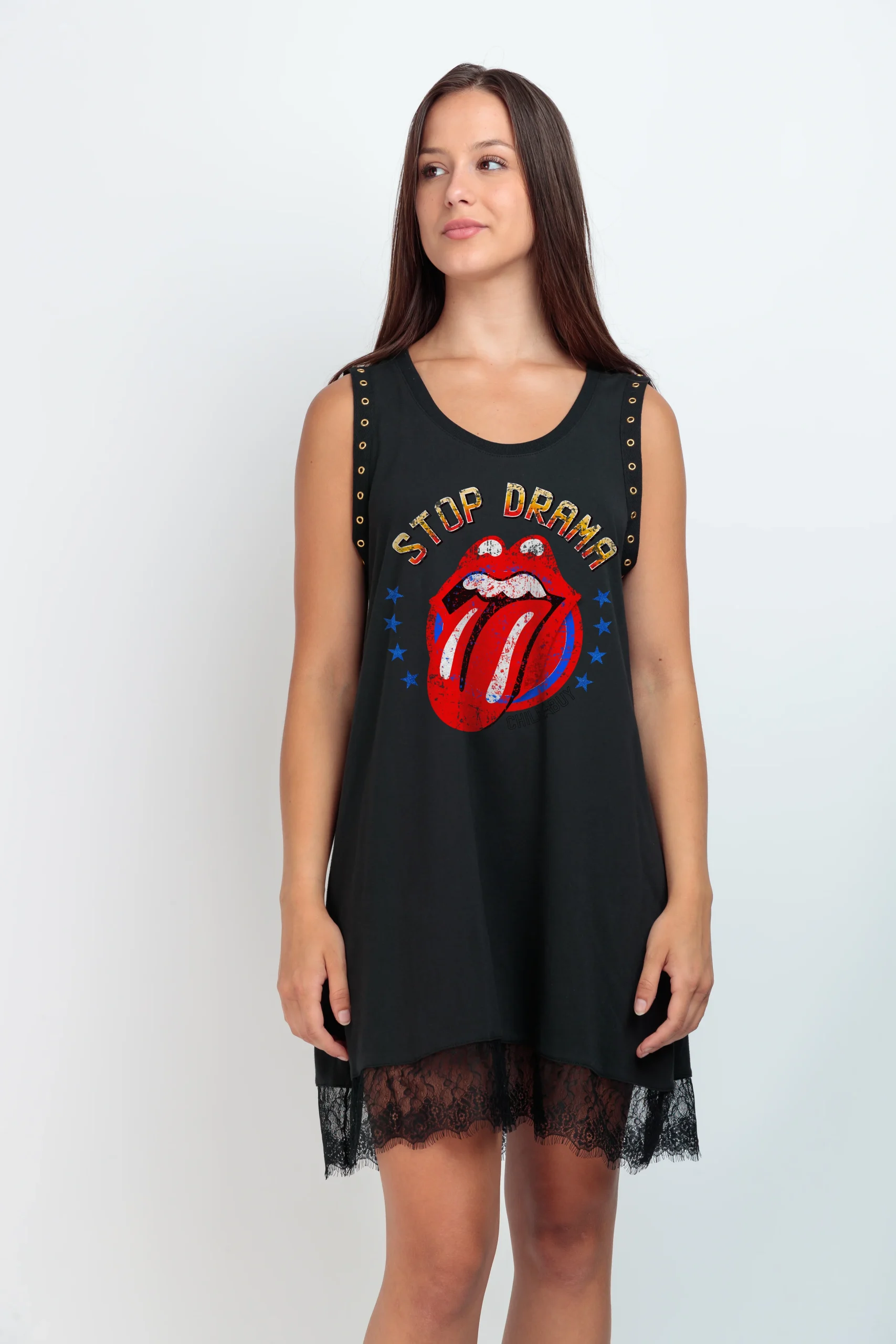 Este vestido destaca por su estampado frontal «Stop Drama» con acabado glitter, que aporta un aire rebelde y divertido. Las sisas están rematadas con una tira de ojales metálicos dorados, que le dan un toque cañero y sofisticado al mismo tiempo.