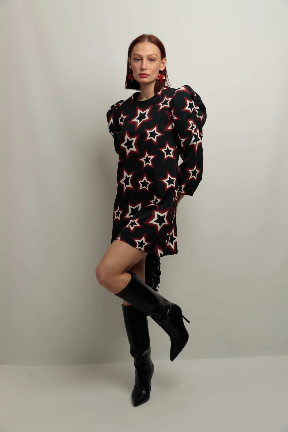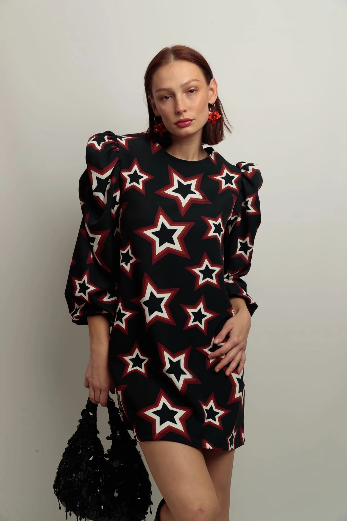 Vestido cuello redondo, corte evase, con bolsillos y cierre con cremallera oculta en la espalda. Mangas abullonadas.