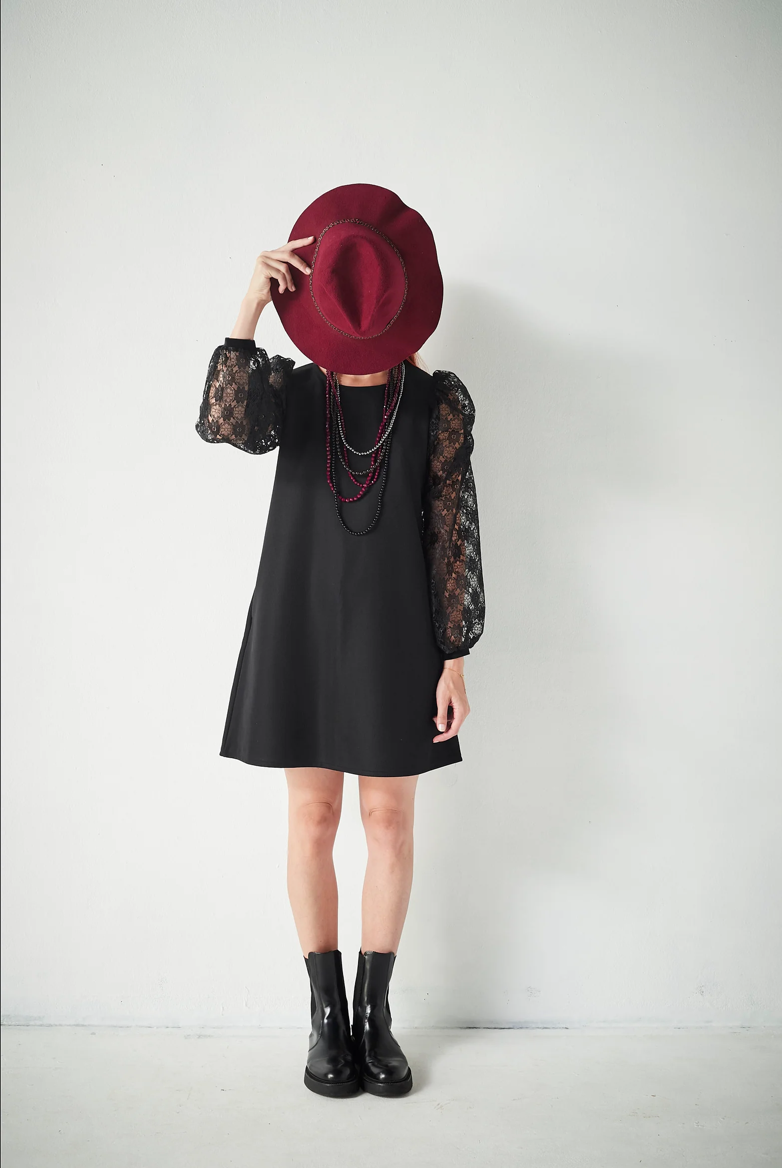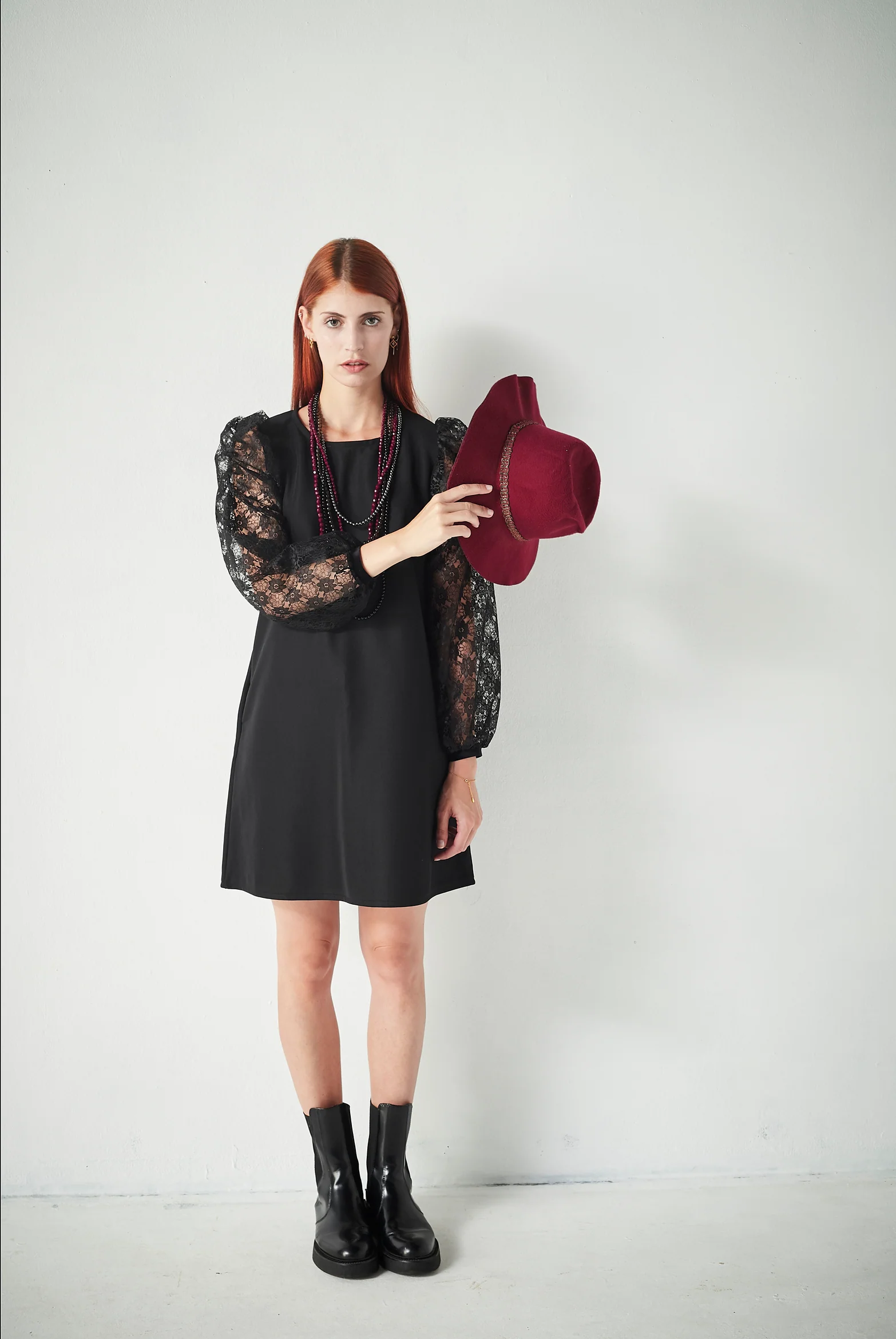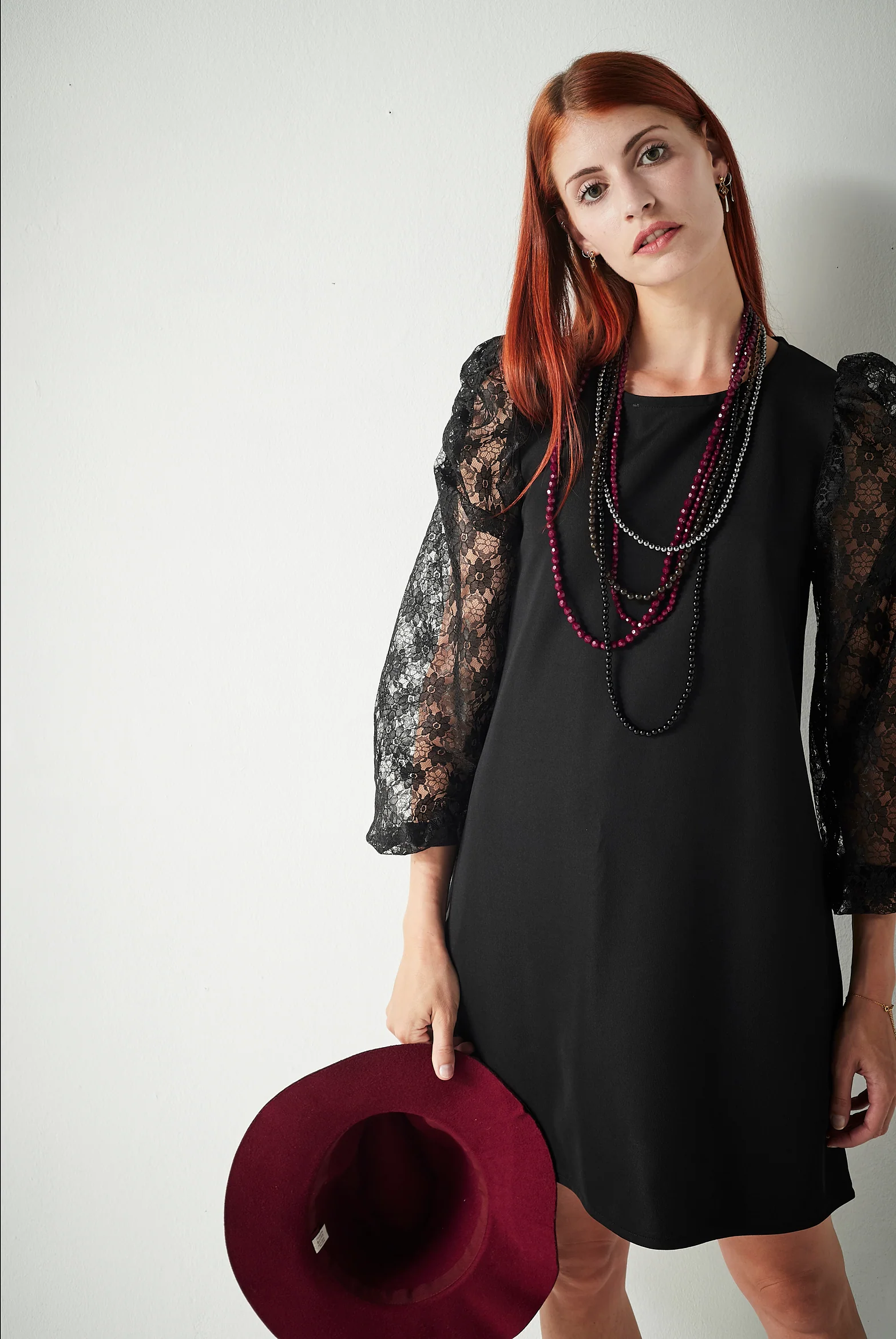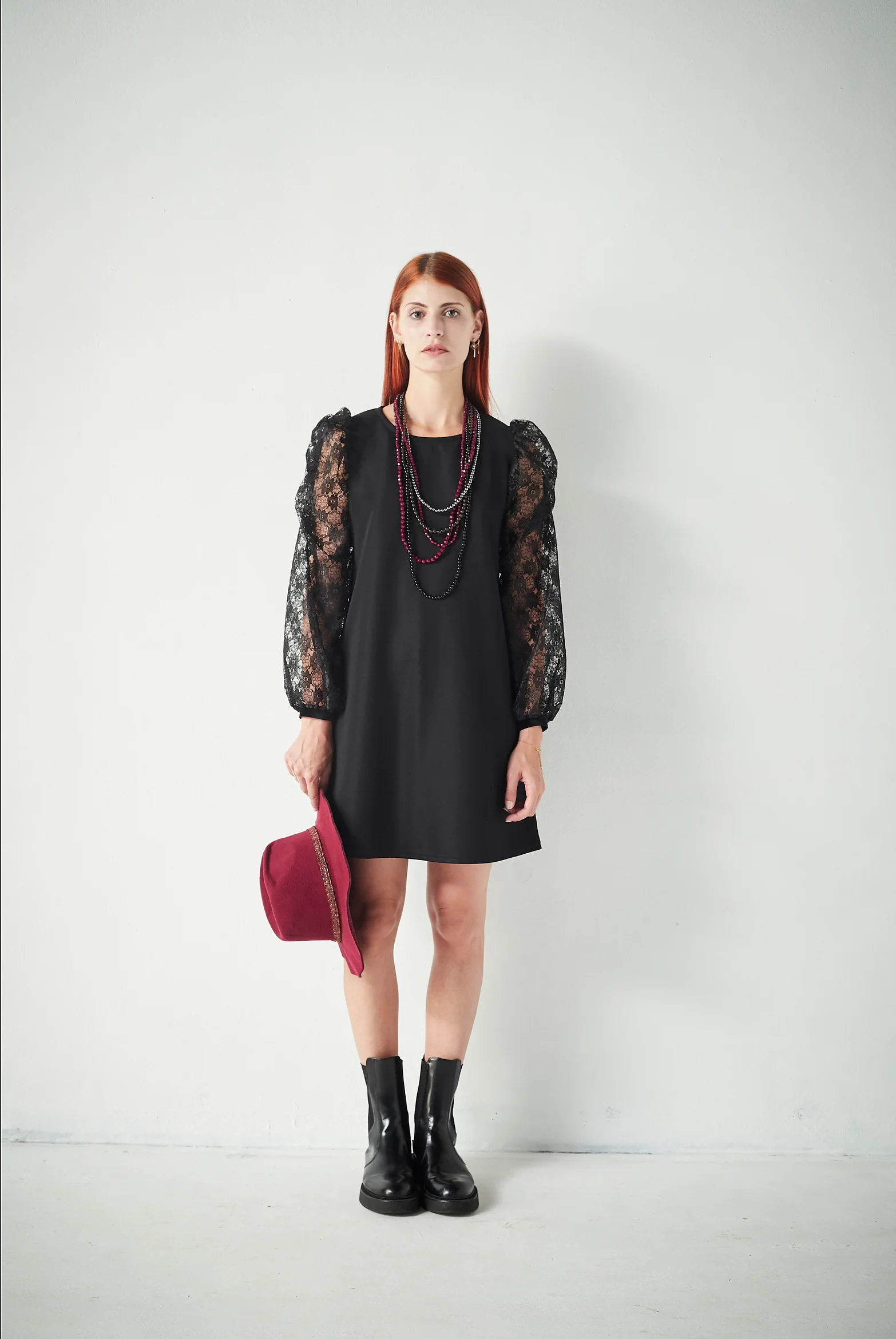 Vestido corto de mujer, con corte evasé, con bolsillos y cuello redondo. Detalle de manga larga de encaje abullonada y con puño de terciopelo. Estampación frontal en color dorado.