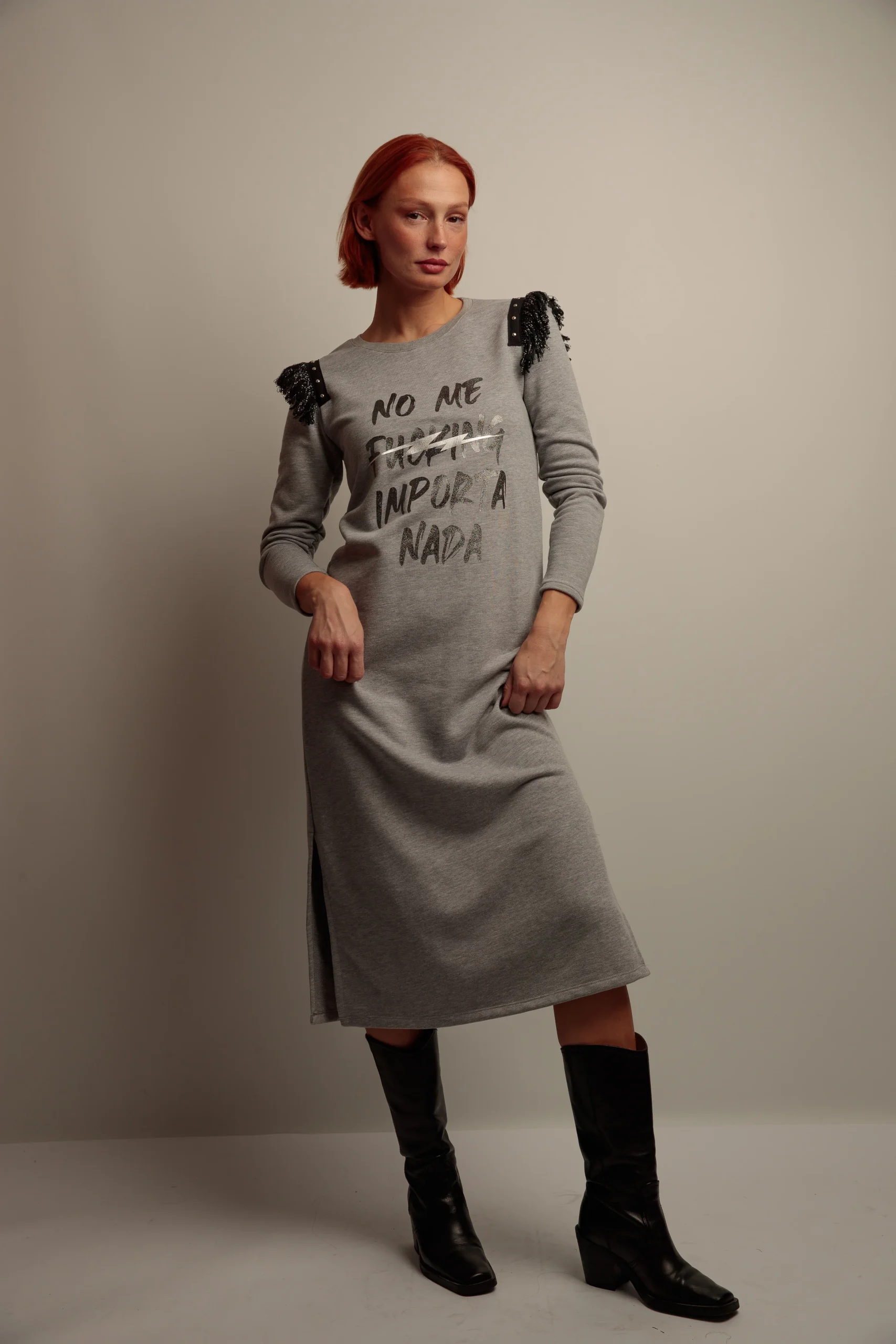 Este vestido largo de algodón combina comodidad y estilo con aberturas laterales que aportan movimiento y frescura. Sus flecos de lurex en el hombro, rematados con tachuelas plateadas, le dan un toque rebelde y brillante. La manga larga lo hace perfecto para cualquier época, y su diseño frontal confeccionado en Vigo asegura calidad y originalidad en cada detalle. Ideal para quienes buscan diversión y personalidad en su look.