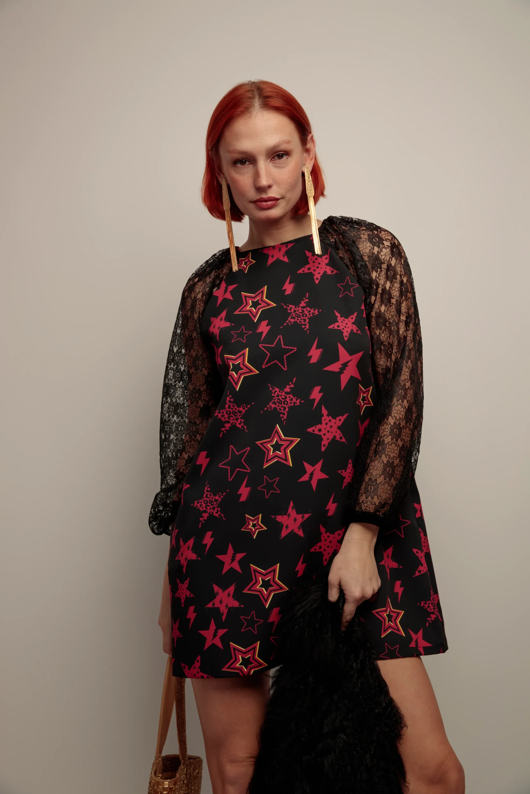 Vestido corto de mujer, cuello redondo, corte evasé, con bolsillos y cierre con cremallera oculta en la parte posterior. Detalle de manga ranglam en tejido de encaje negro. Cuerpo del vestido en tejido estampado en base negra con estrellas en tonos granate. Confeccionado en Vigo.