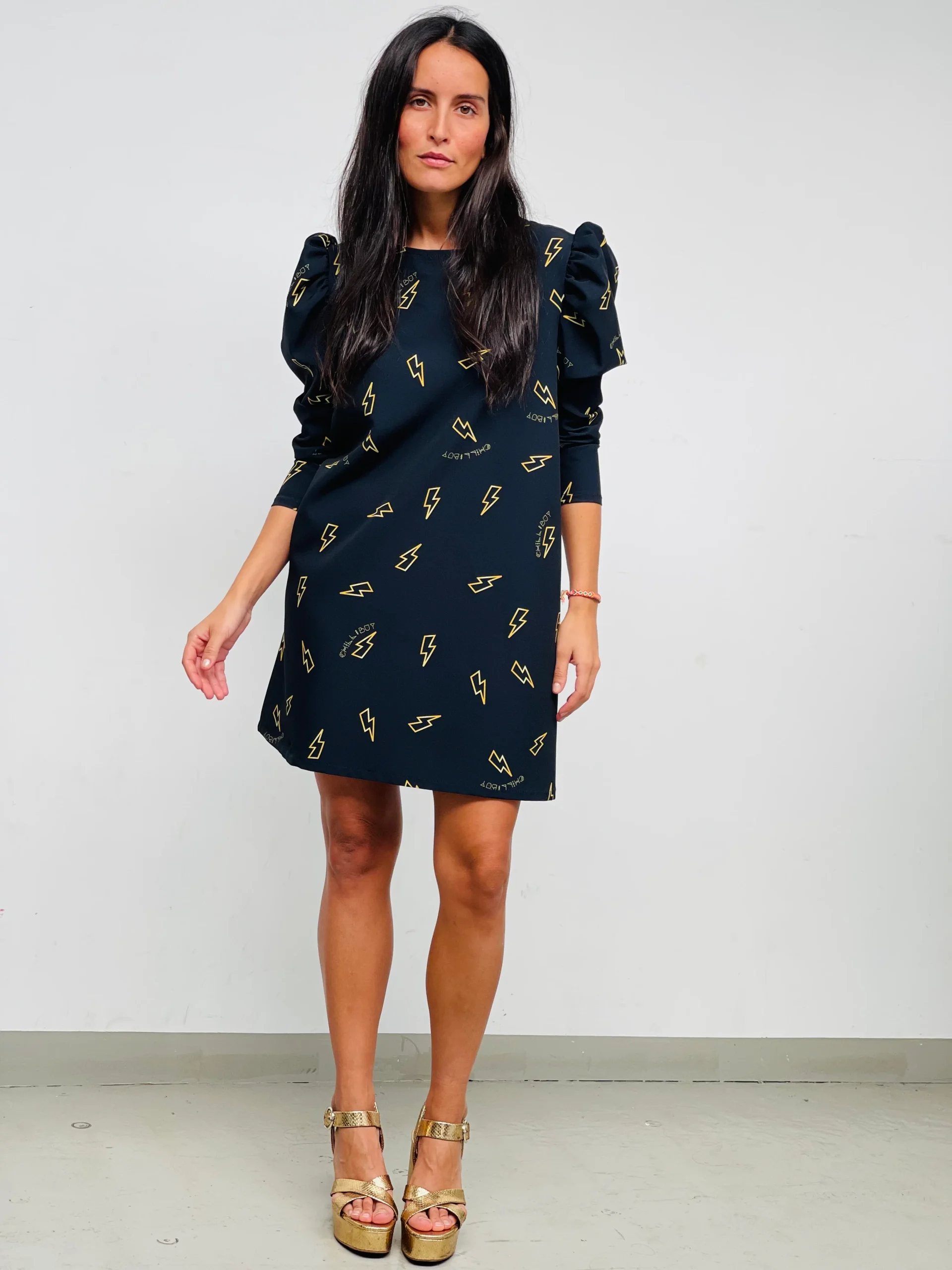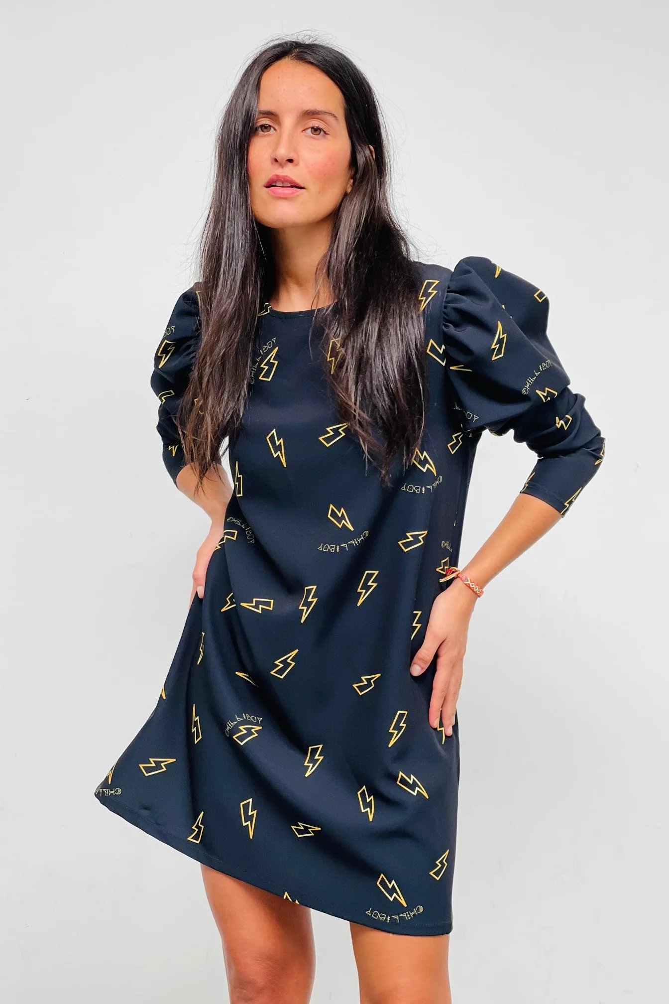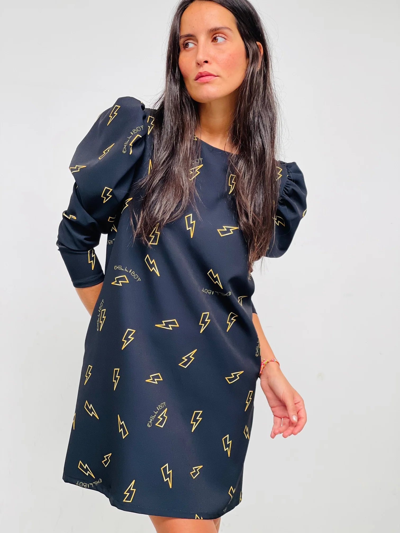 Vestido corto de mujer, con cuello redondo, corte evase, con bolsillos y cierre con cremallera oculta en la parte posterior. Tejido tipo crep con elastano en tono negro con rayos en color dorado. Confeccionado en Vigo.