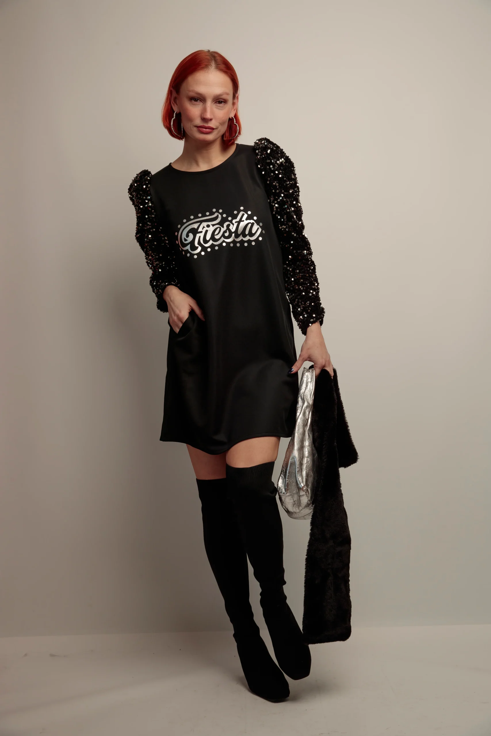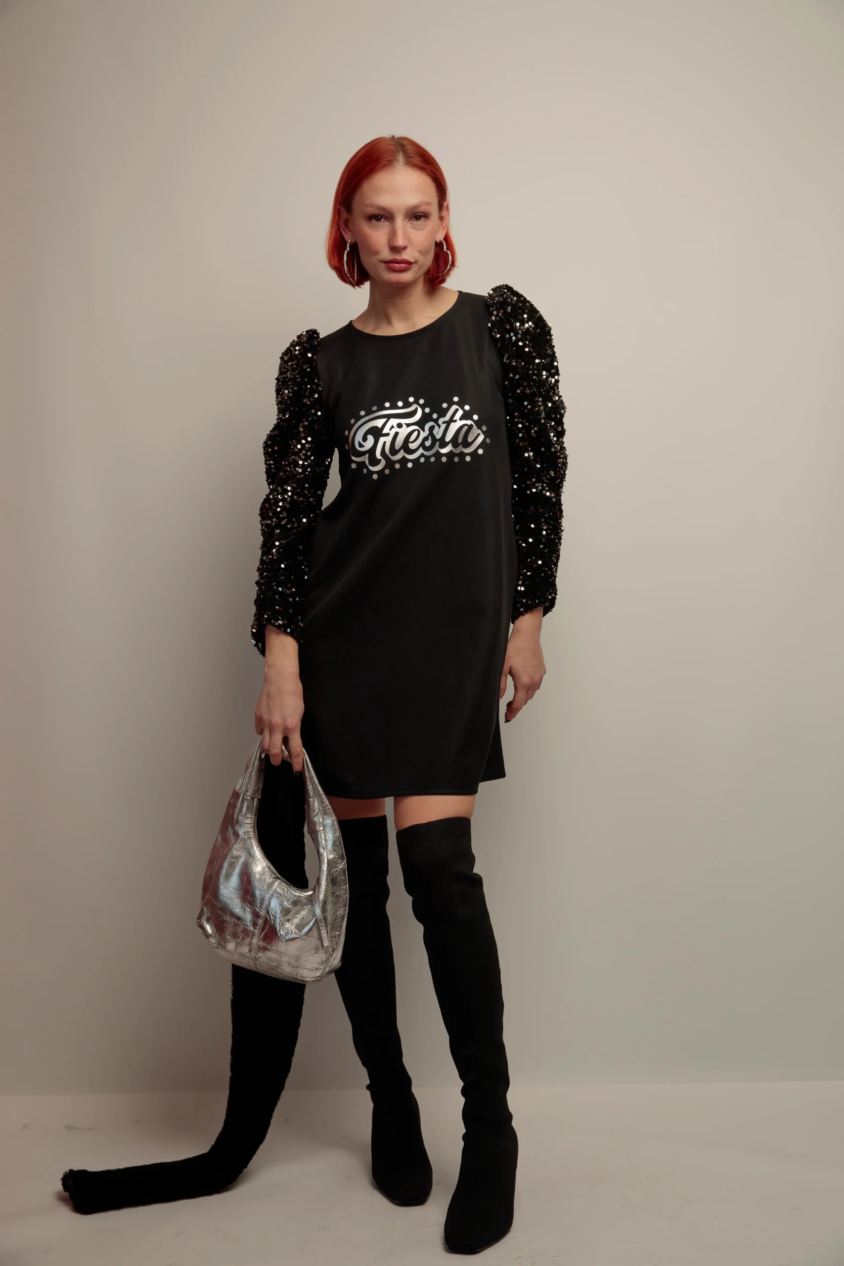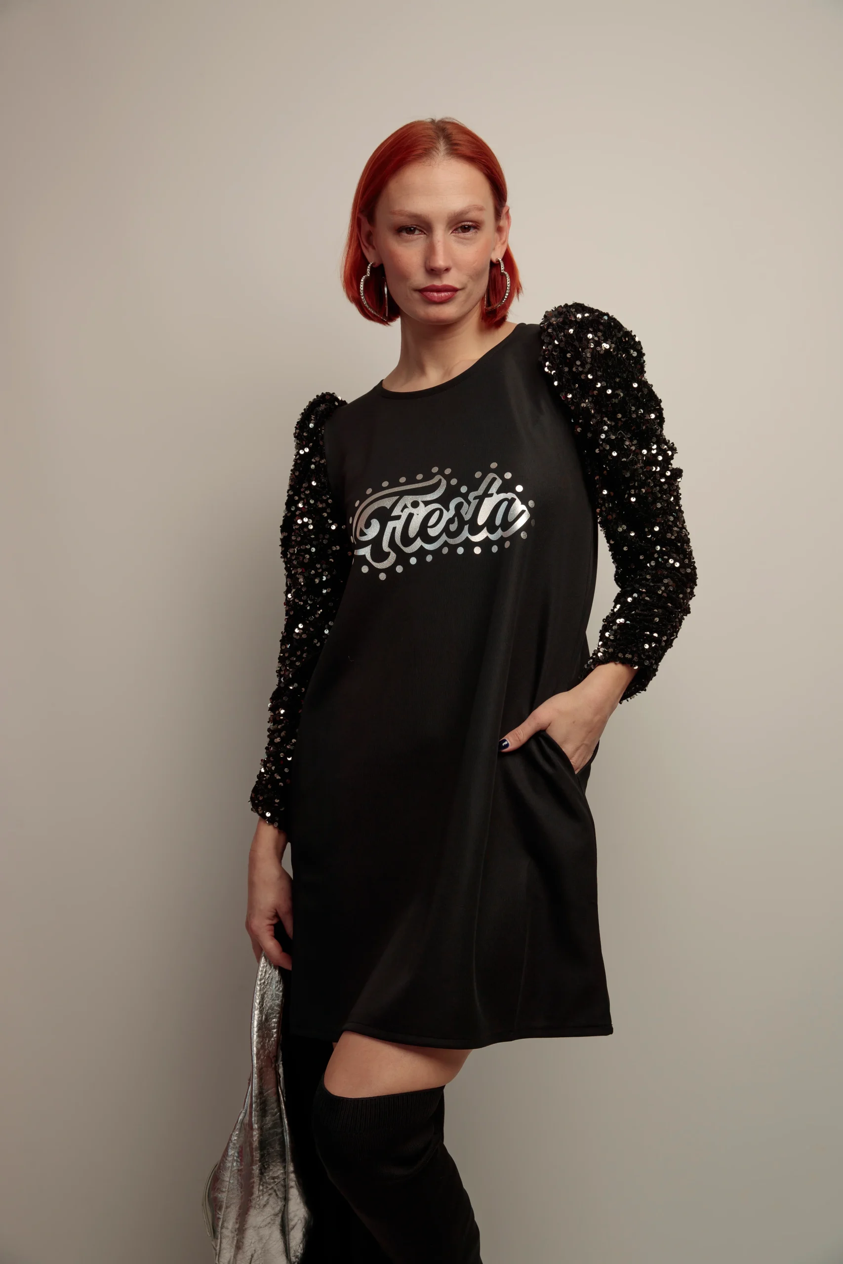 Este vestido corto para mujer combina elegancia y estilo con su corte evasé y cuello redondo. Destacan sus mangas abullonadas de lentejuelas, que aportan un toque sofisticado y moderno. Los prácticos bolsillos laterales añaden funcionalidad sin perder la estética. La estampación frontal en tono plateado realza el diseño, haciendo de esta prenda una opción ideal para ocasiones especiales o un look diario con personalidad.