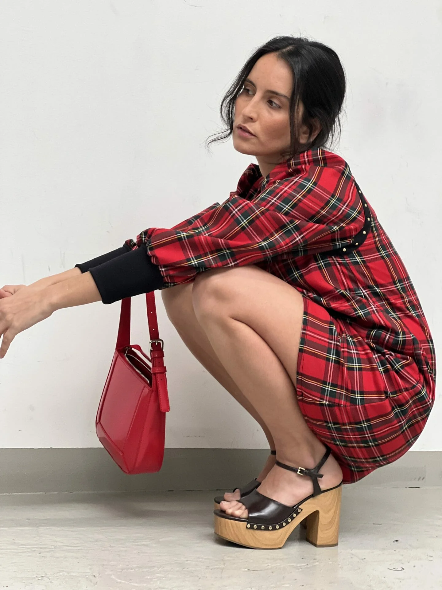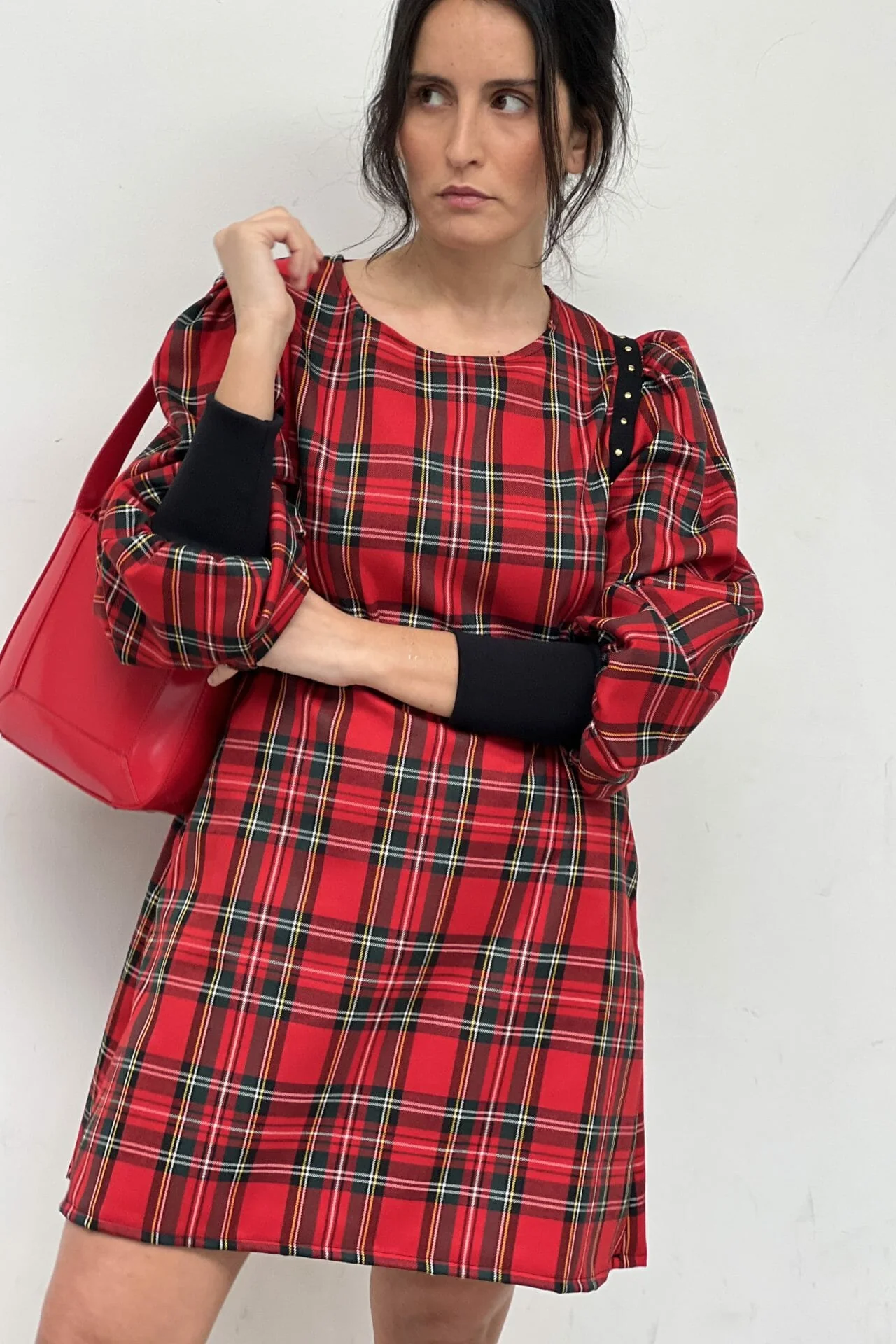 Vestido corto estampado, escote redondo y manga larga abullonada con puño de algodón a contraste y adorno de tachuelas . Cierre con cremallera oculto en costura posterior.