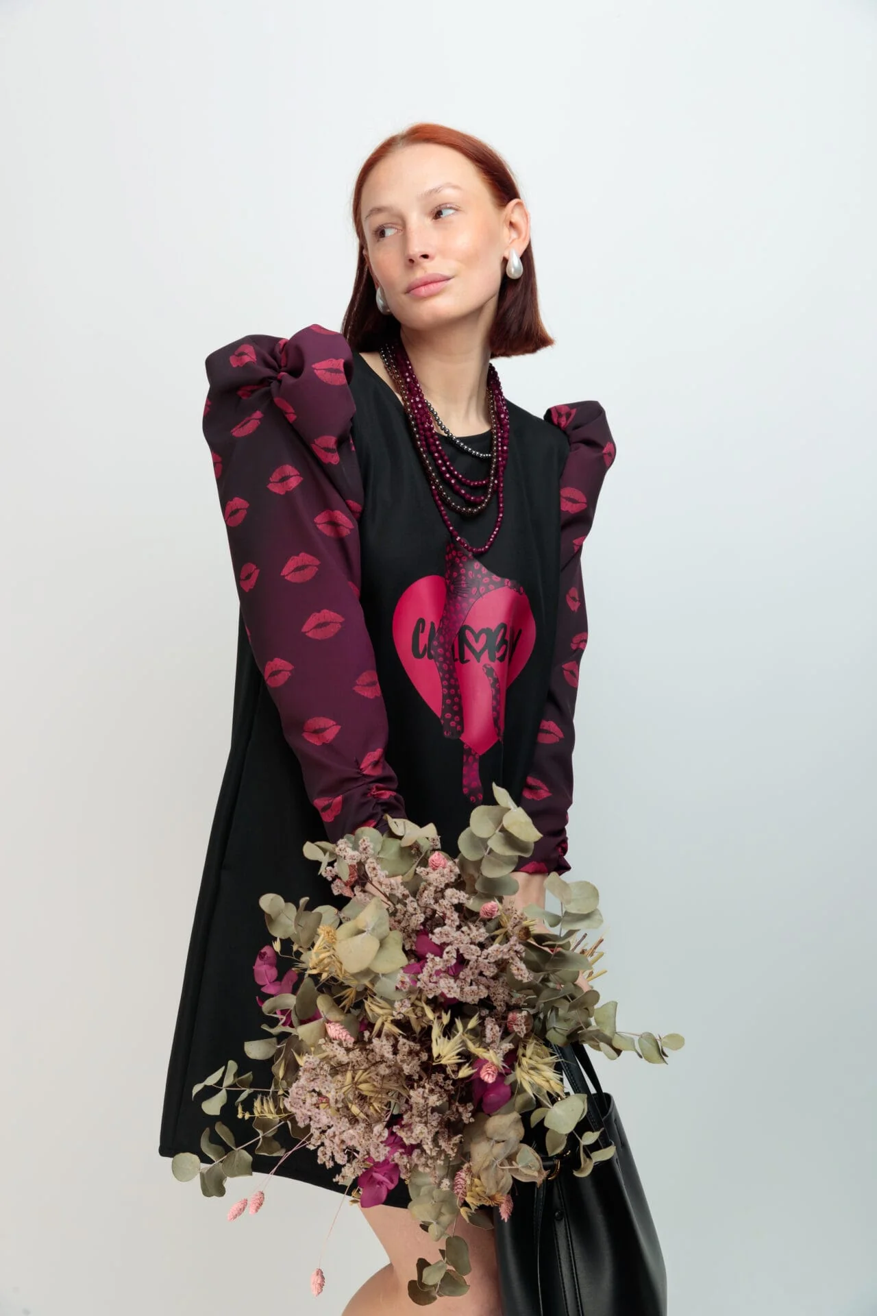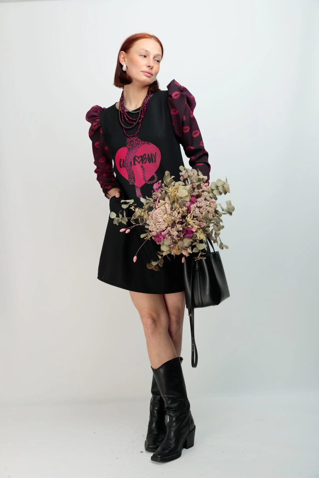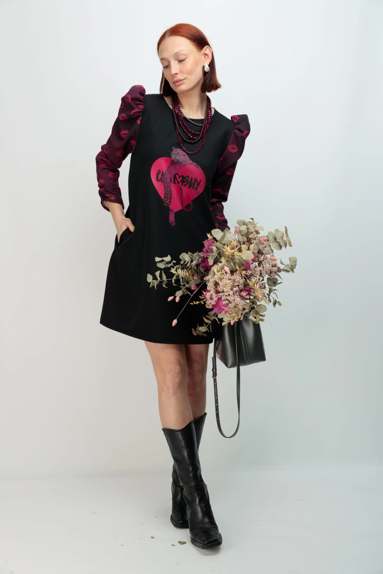 Vestido corto en color negro, con cuello redondo, corte evasé y con bolsillos. Detalle de manga larga abullonada y frunce en el puño. Estampación frontal.