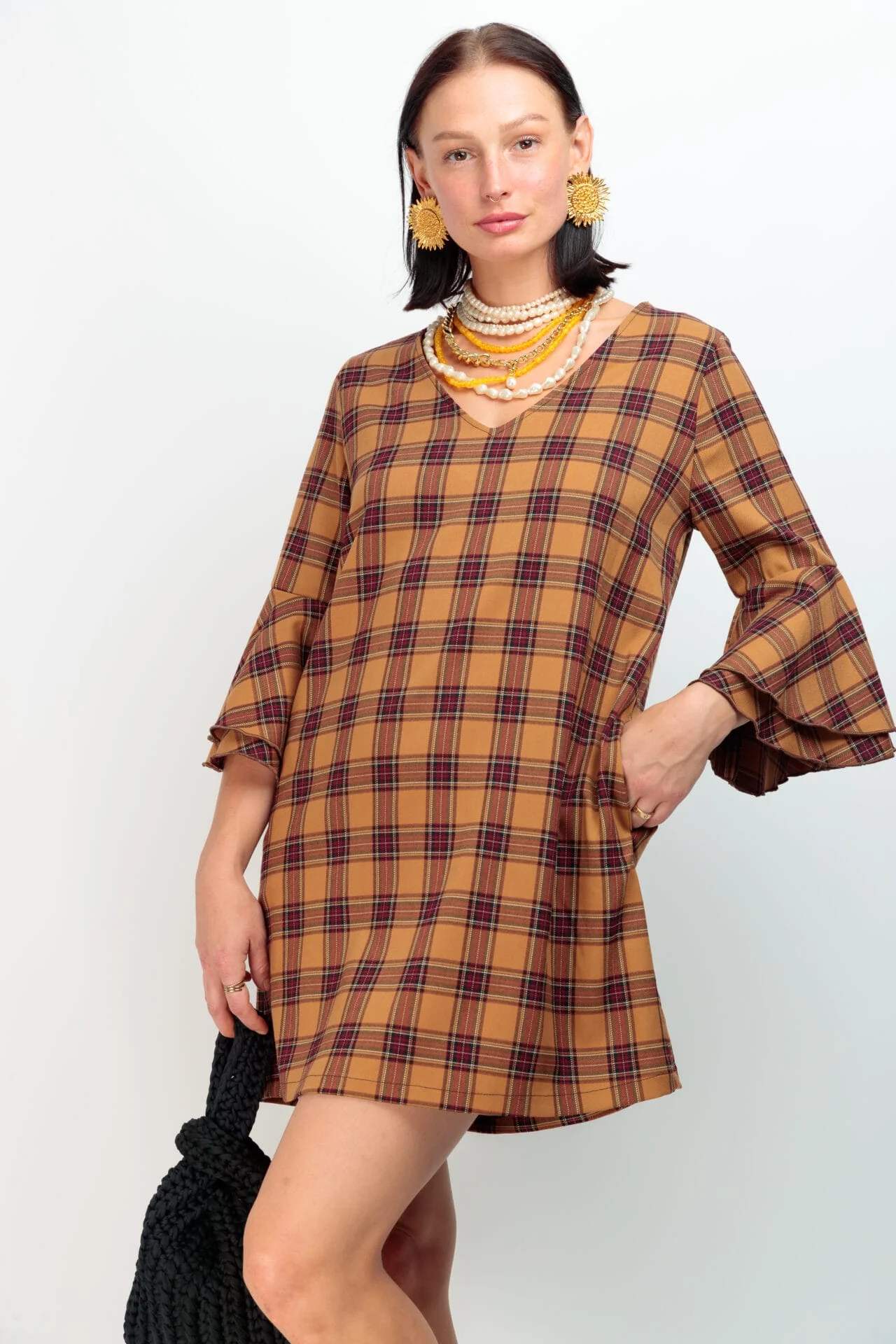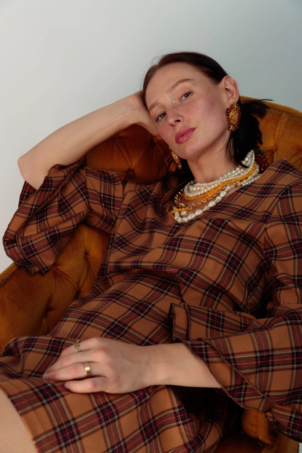 Descubre la elegancia y el estilo atemporal con nuestro encantador Vestido Maya Celta Mostaza de estampado tartán en un vibrante color mostaza. Se trata del clásico estampado de cuadros escoceses en unos colores especiales, en un cálido y alegre color mostaza. Este color le da un aire moderno y fresco al diseño, haciéndolo perfecto para destacar en cualquier prenda o accesorio. Los cuadros, con su simetría y estructura, se ven aún más llamativos en mostaza, aportando un toque de energía y originalidad. Es ideal para quienes buscan un estilo que sea tanto clásico como contemporáneo. ¡Seguro que llamará la atención!